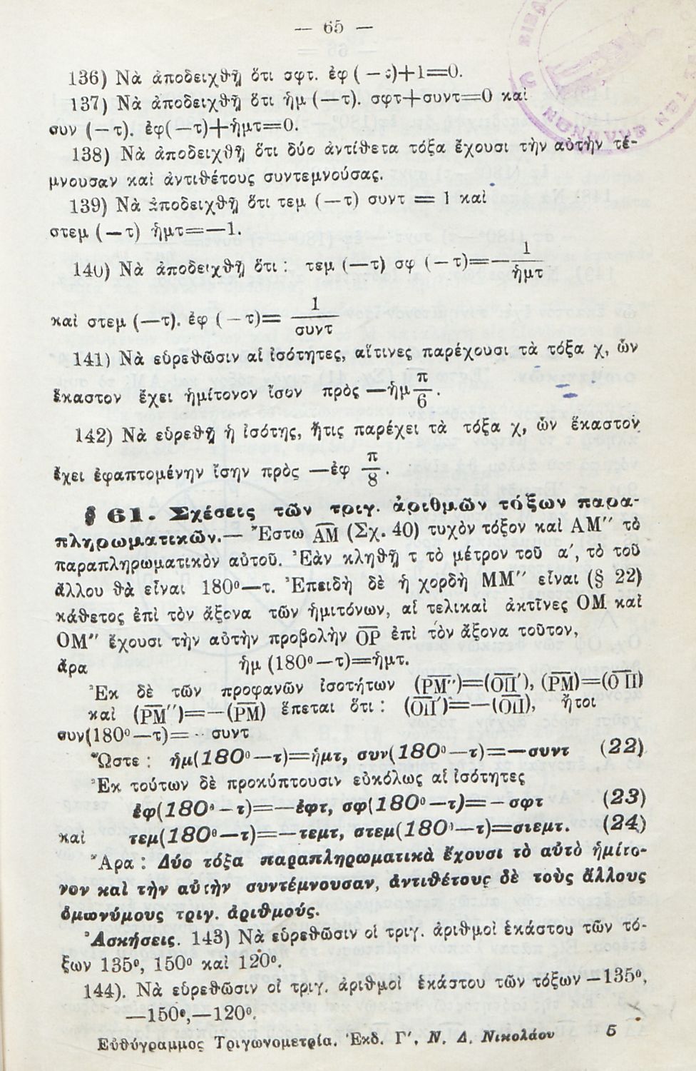 Ευθύγραμμος τριγωνομετρία προς χρήσιν των μαθητών των Πρακτικών Λυκείων, των σπουδαστών των μαθηματικών, φυσικής, χημείας και των μαθητών των Στρατιωτικών Σχολών