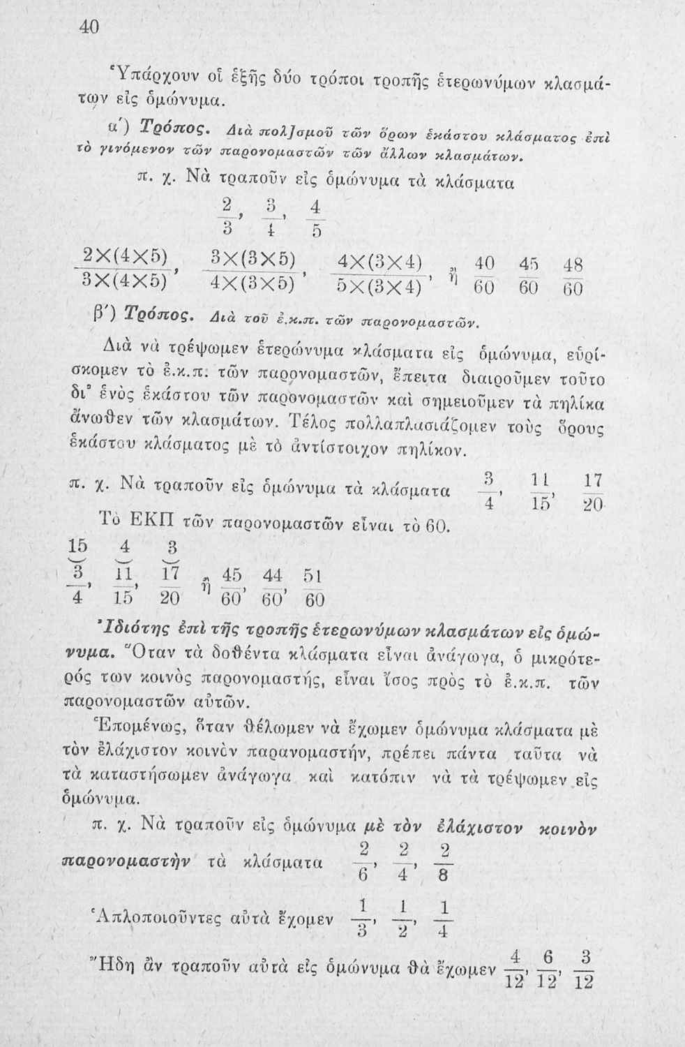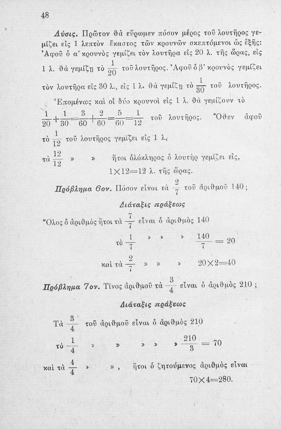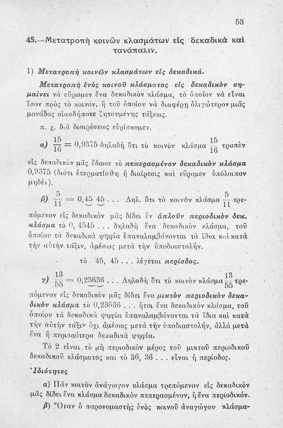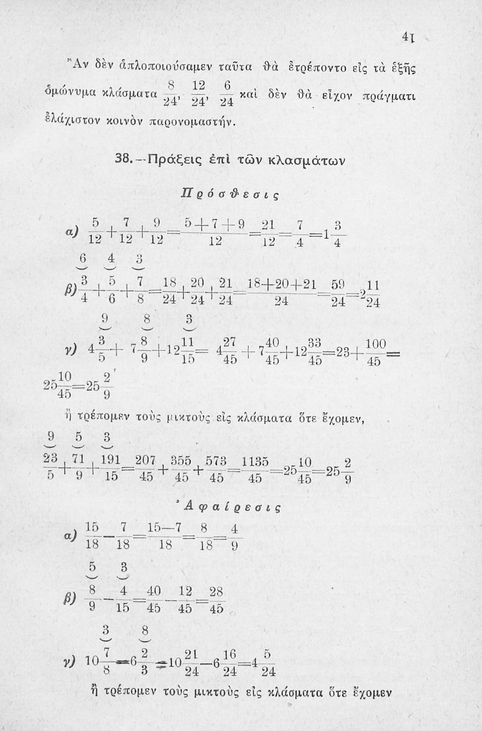 Βαθμίδα εκπαίδευσης: Δευτεροβάθμια Μάθημα: Μαθηματικά Γλώσσα: Καθαρεύουσα Παρουσίαση περιεχομένου: Μαθητικό βοήθημα Αριθμητικής για τους μαθητές και υποψήφιους Ανωτέρων Σχολών. Το βιβλίο αναλύει βασικές έννοιες θεωρίας αριθμών, ακέραιων, κλασματικών αριθμών δεκαδικών, μονάδες μέτρησης. Το δεύτερο μέρος του βιβλίου περιέχει ασκήσεις και προβλήματα. |