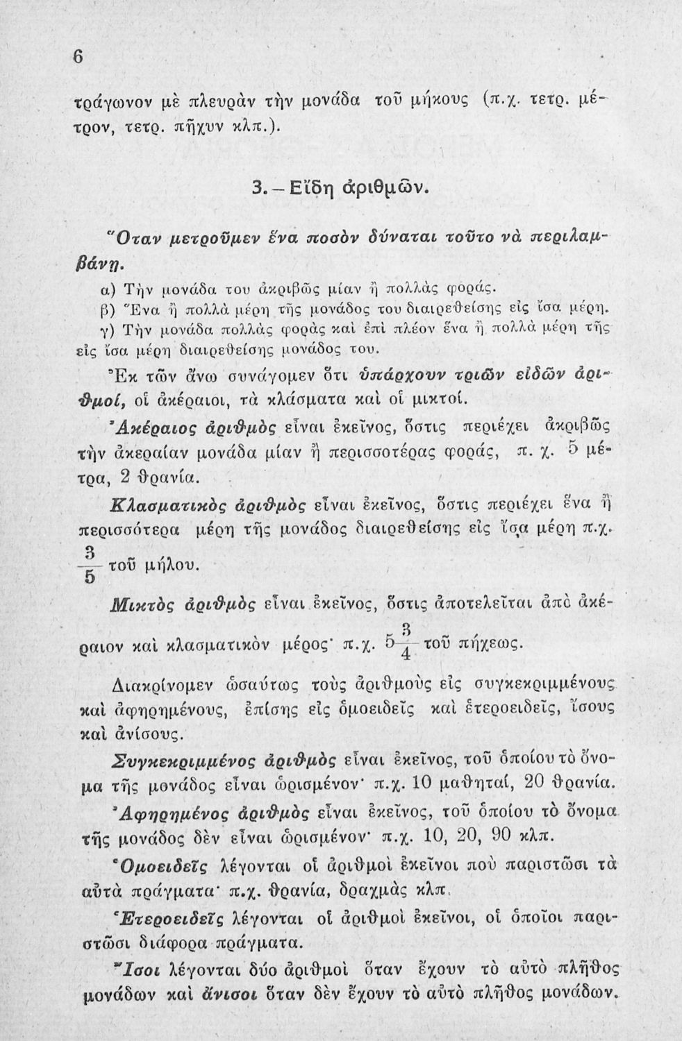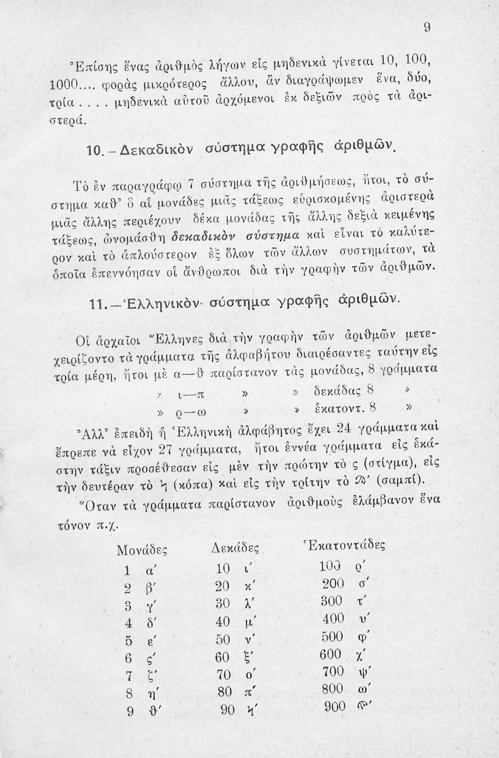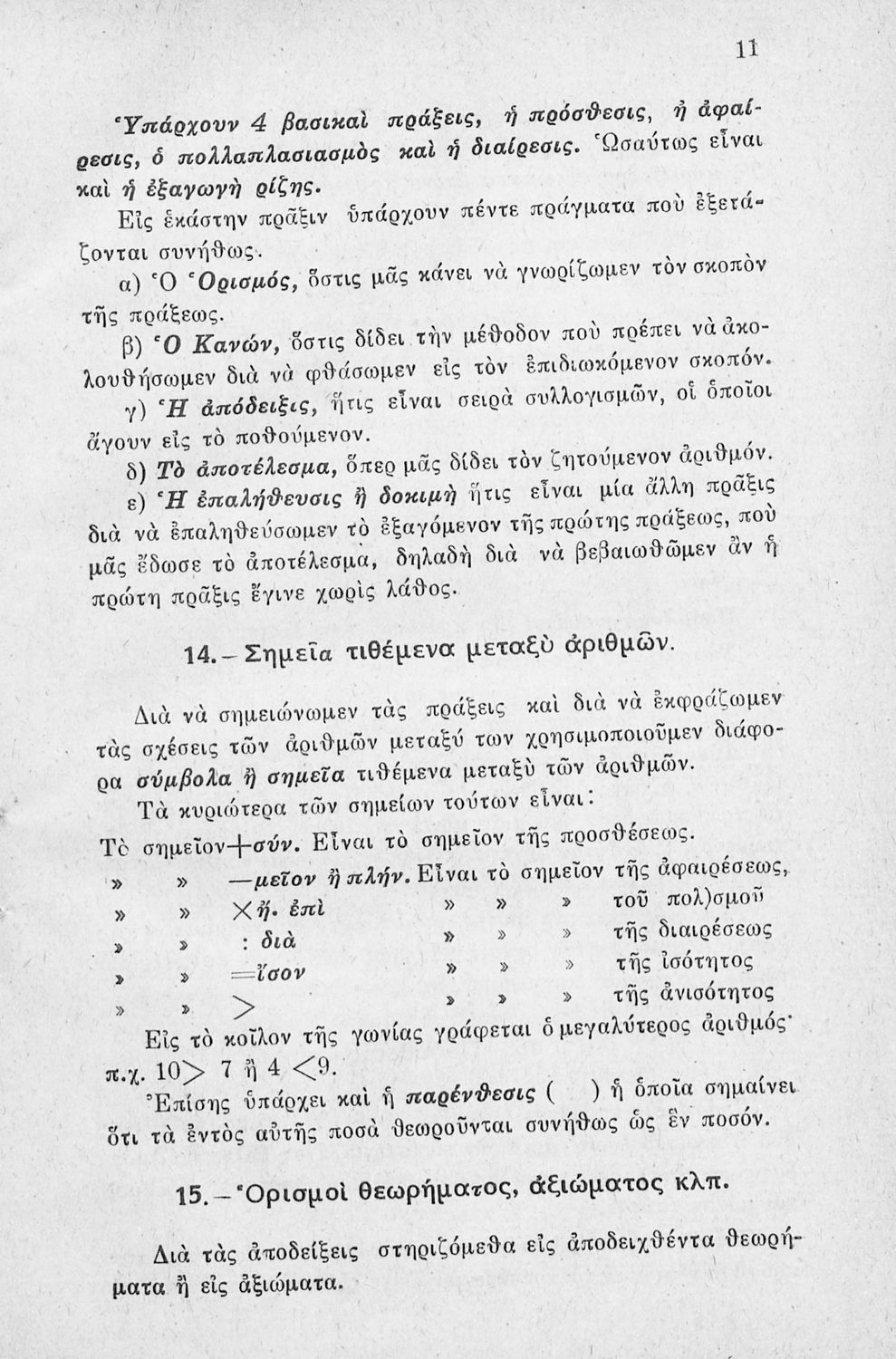 Βαθμίδα εκπαίδευσης: Δευτεροβάθμια Μάθημα: Μαθηματικά Γλώσσα: Καθαρεύουσα Παρουσίαση περιεχομένου: Μαθητικό βοήθημα Αριθμητικής για τους μαθητές και υποψήφιους Ανωτέρων Σχολών. Το βιβλίο αναλύει βασικές έννοιες θεωρίας αριθμών, ακέραιων, κλασματικών αριθμών δεκαδικών, μονάδες μέτρησης. Το δεύτερο μέρος του βιβλίου περιέχει ασκήσεις και προβλήματα. |