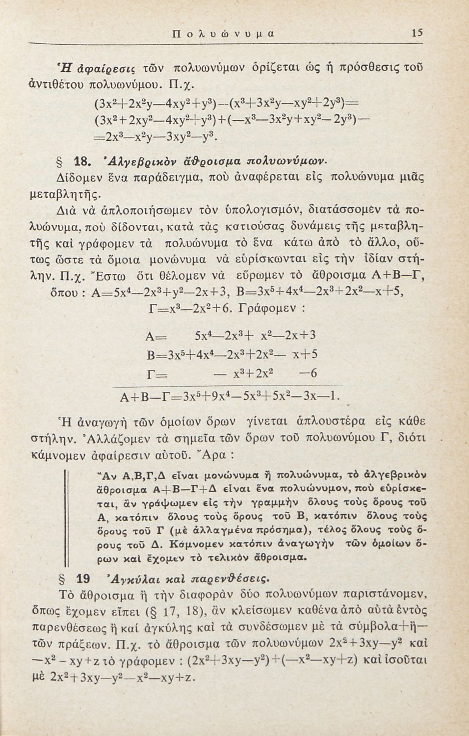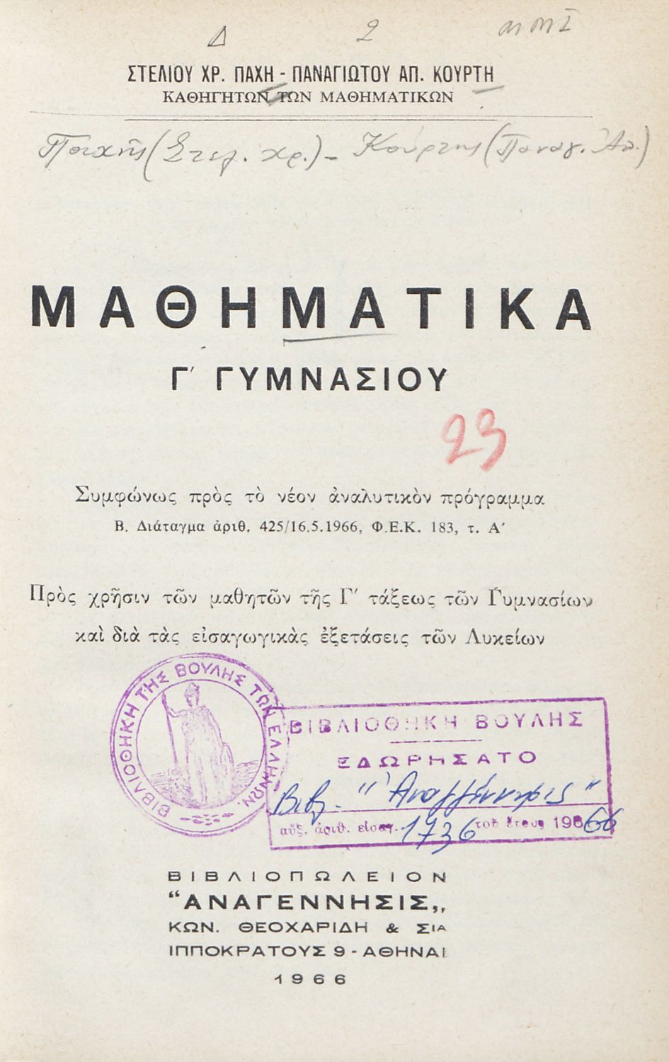 Βαθμίδα εκπαίδευσης: Δευτεροβάθμια Τάξη: Γ' Γυμνασίου Μάθημα: Μαθηματικά Γλώσσα: Απλή καθαρεύουσα Παρουσίαση περιεχομένου: Μαθητικό βοήθημα Μαθηματικών για τους μαθητές της Γ' Γυμνασίου και τους υποψήφιους Λυκείου που πραγματεύεται βασικές έννοιες άλγεβρας και γεωμετρίας. |