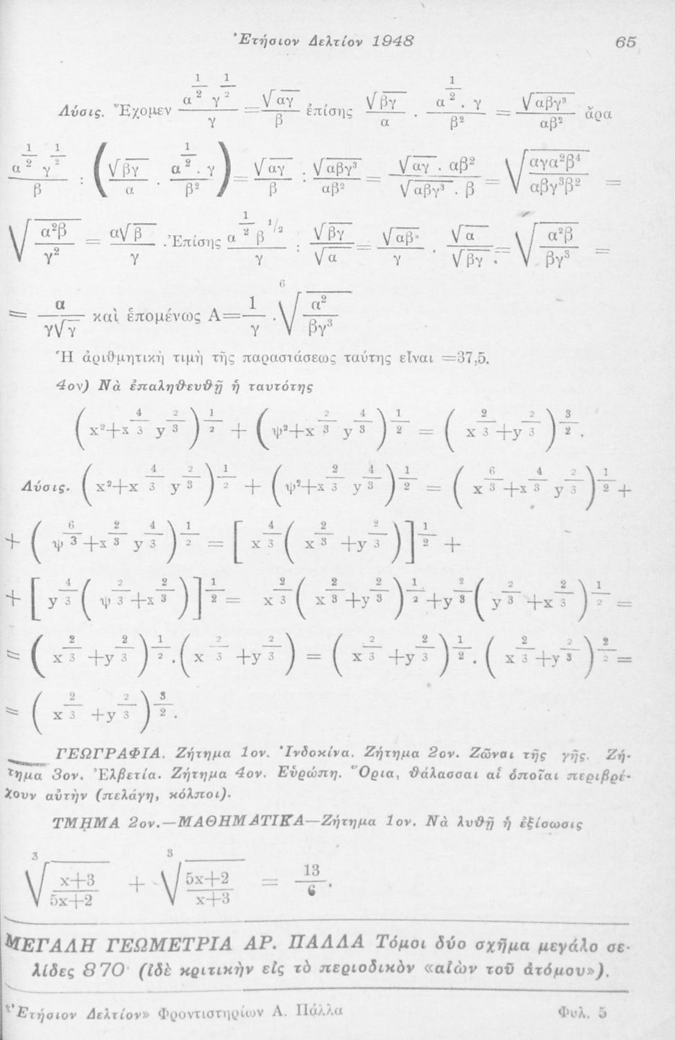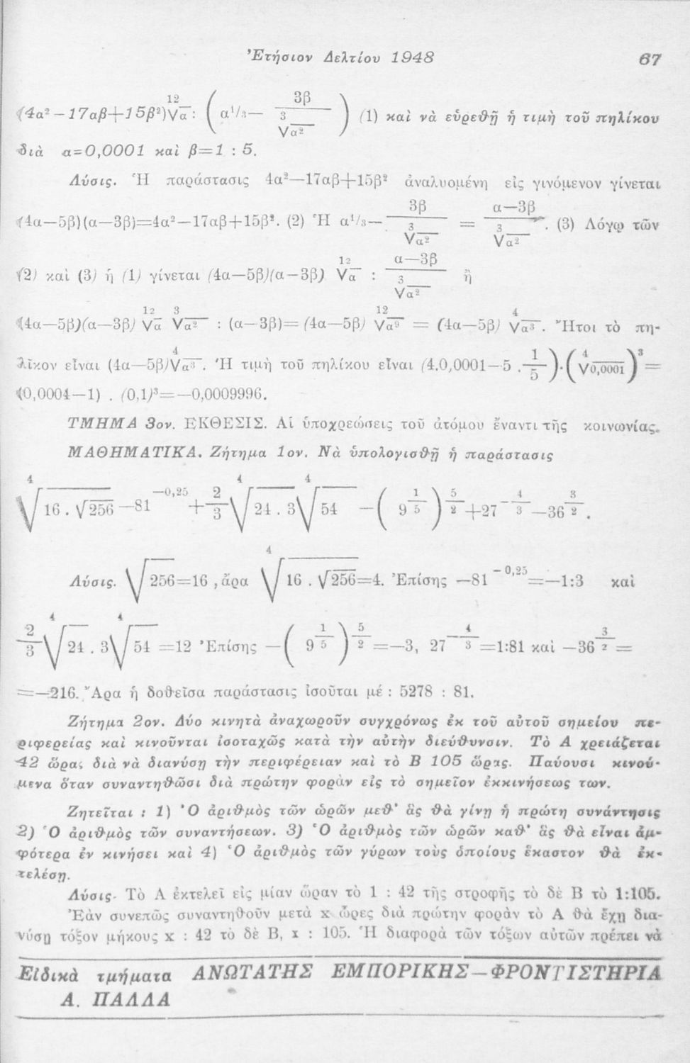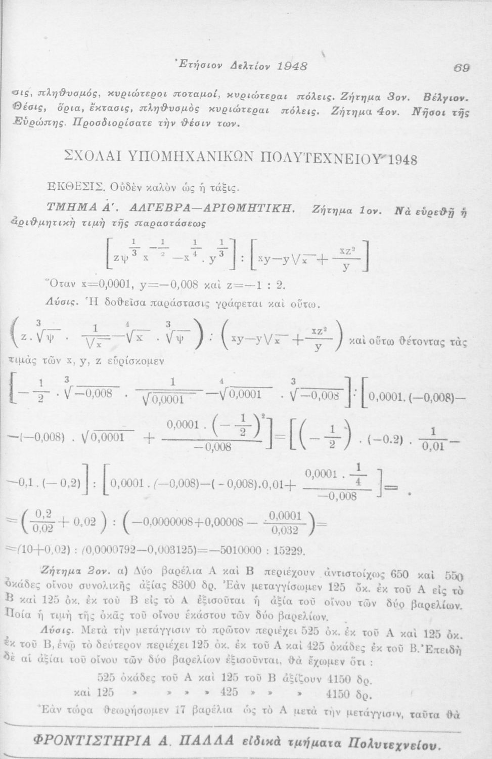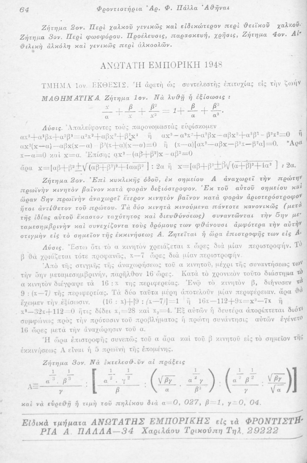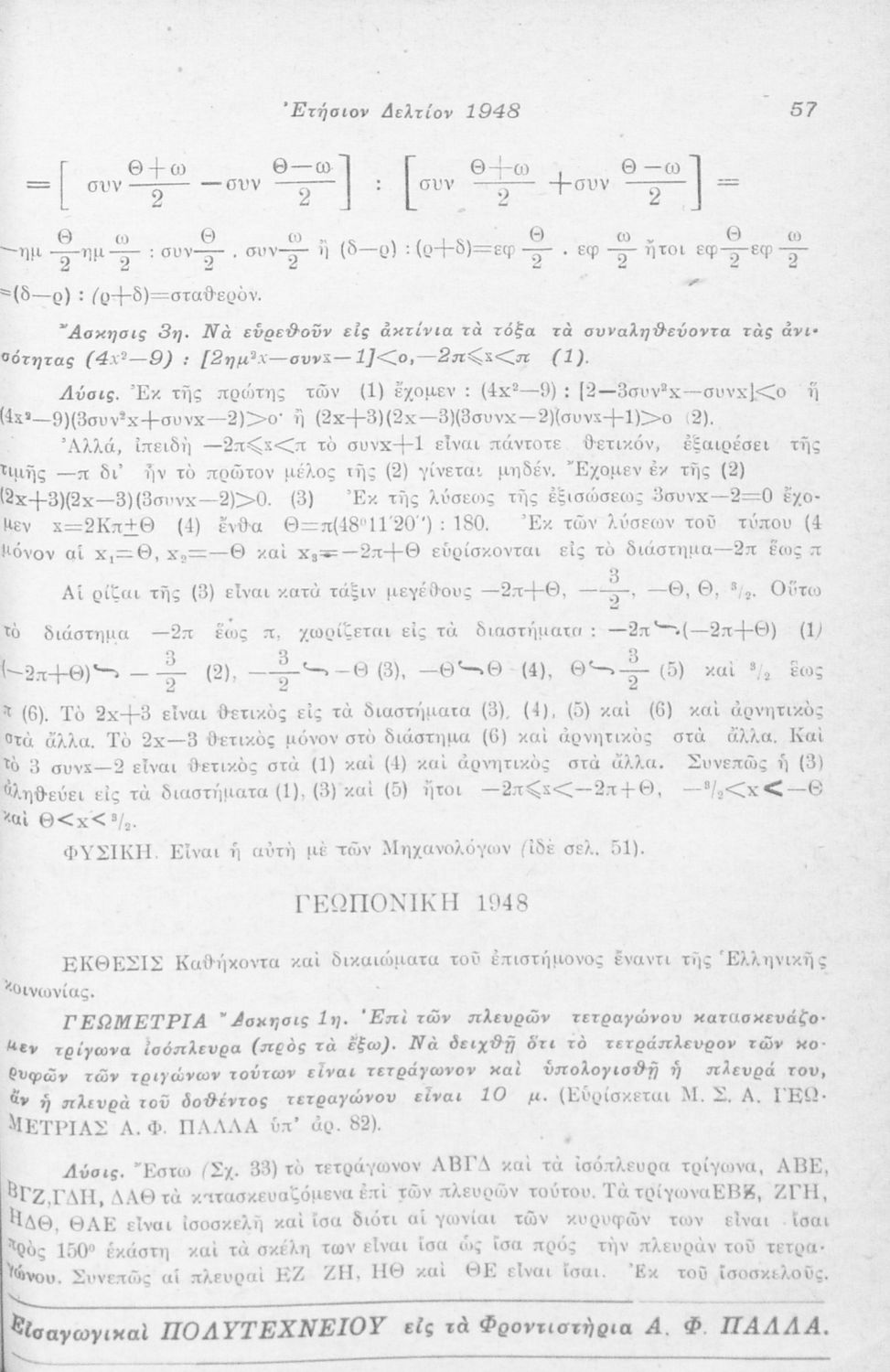 Θέματα δοθέντα εις τας εισαγωγικάς εξετάσεις των ανωτάτων και ανωτέρων Σχολών του Κράτους το έτος 1948 μετά των λύσεων αυτών.