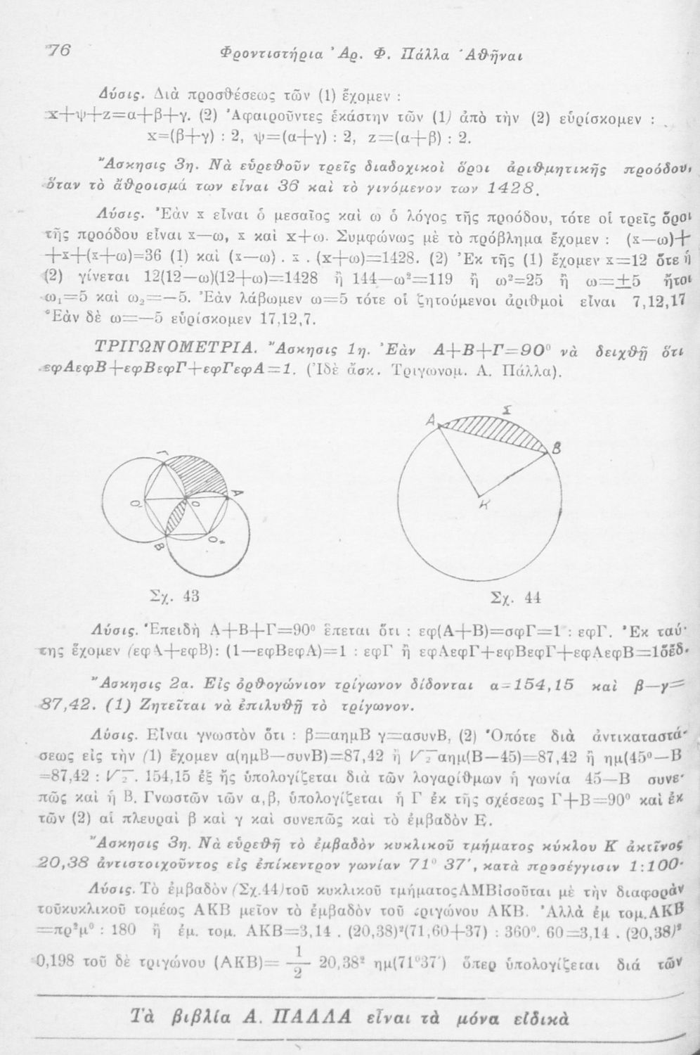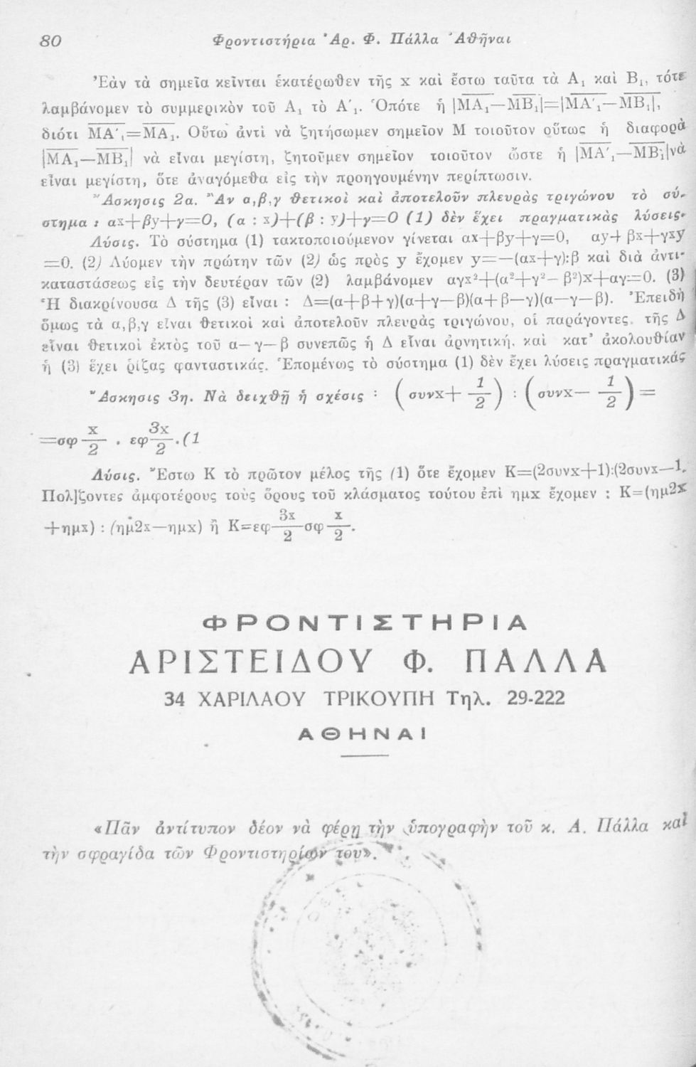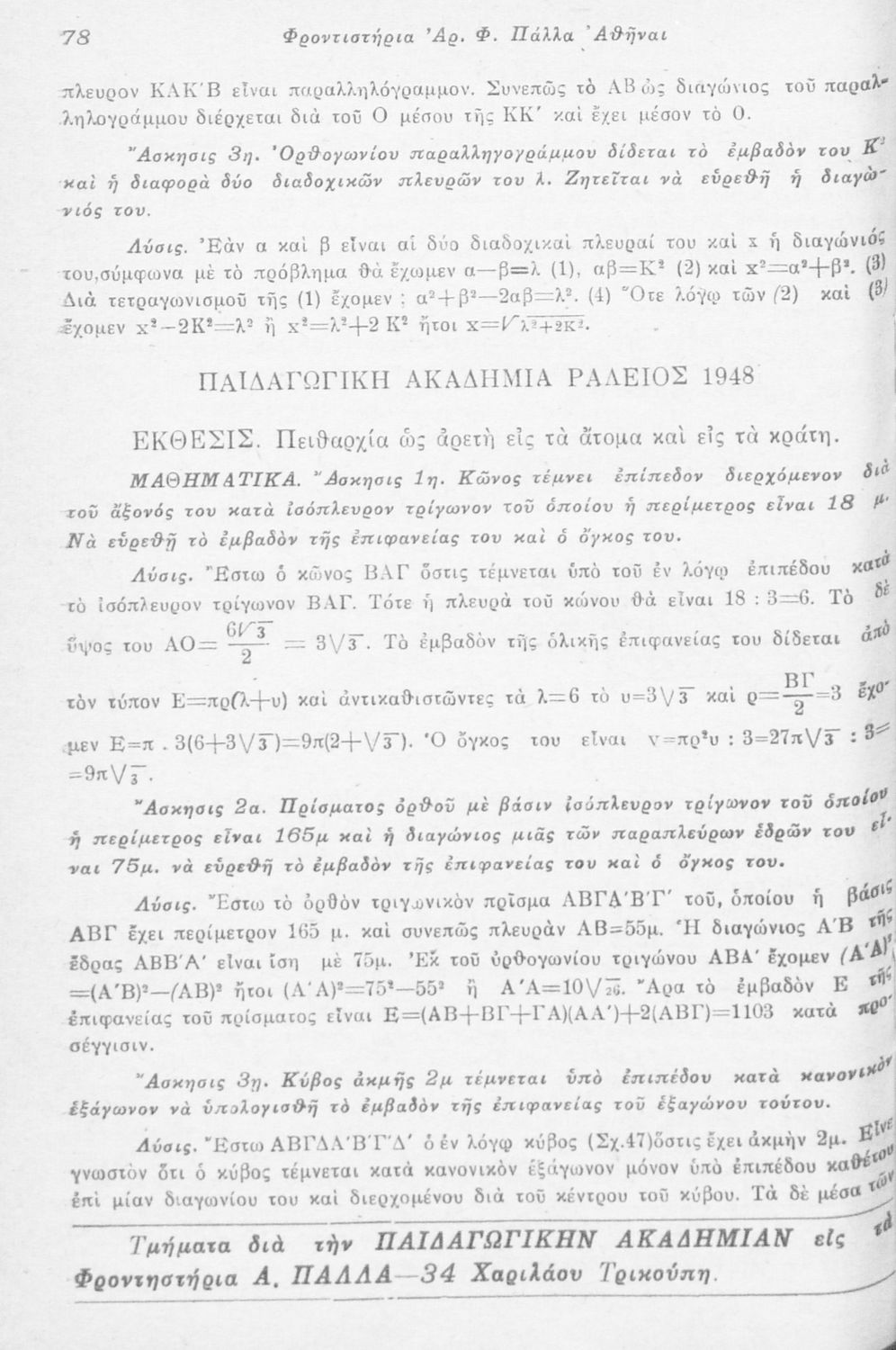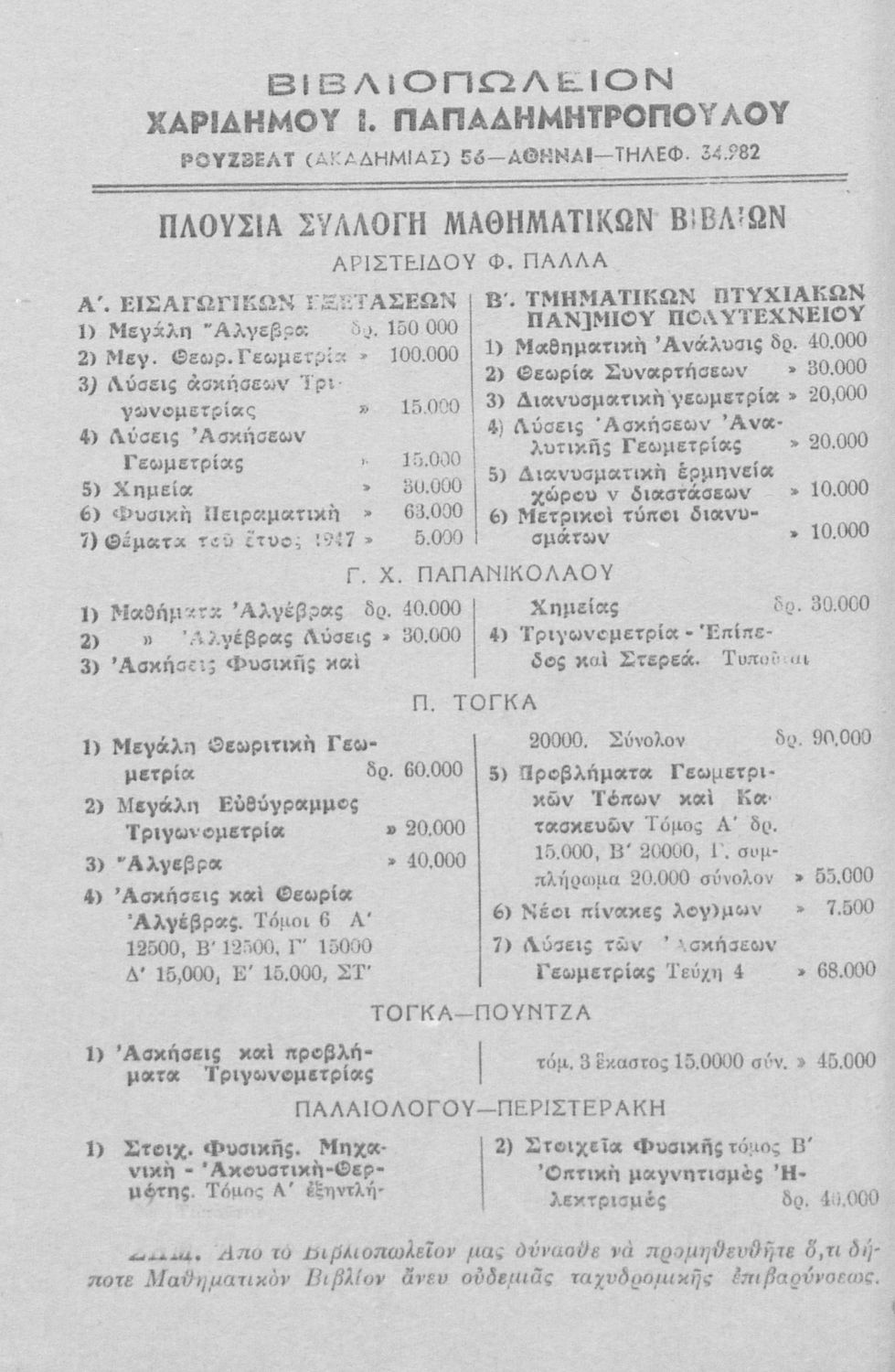 Κωδικός αναγνώρισης: 03-20632550 Τίτλος: Θέματα δοθέντα εις τας εισαγωγικάς εξετάσεις των ανωτάτων και ανωτέρων Σχολών του Κράτους το έτος 1948 μετά των λύσεων αυτών. Συγγραφέας: Αρισ. Φ. Πάλλας Μέγεθος και υπόστρωμα: Μαθητικό βοήθημα, σκληρό εξώφυλλο, 80 σελίδες. Σχήματα, σχεδιαγράμματα (ασπρόμαυρα). |