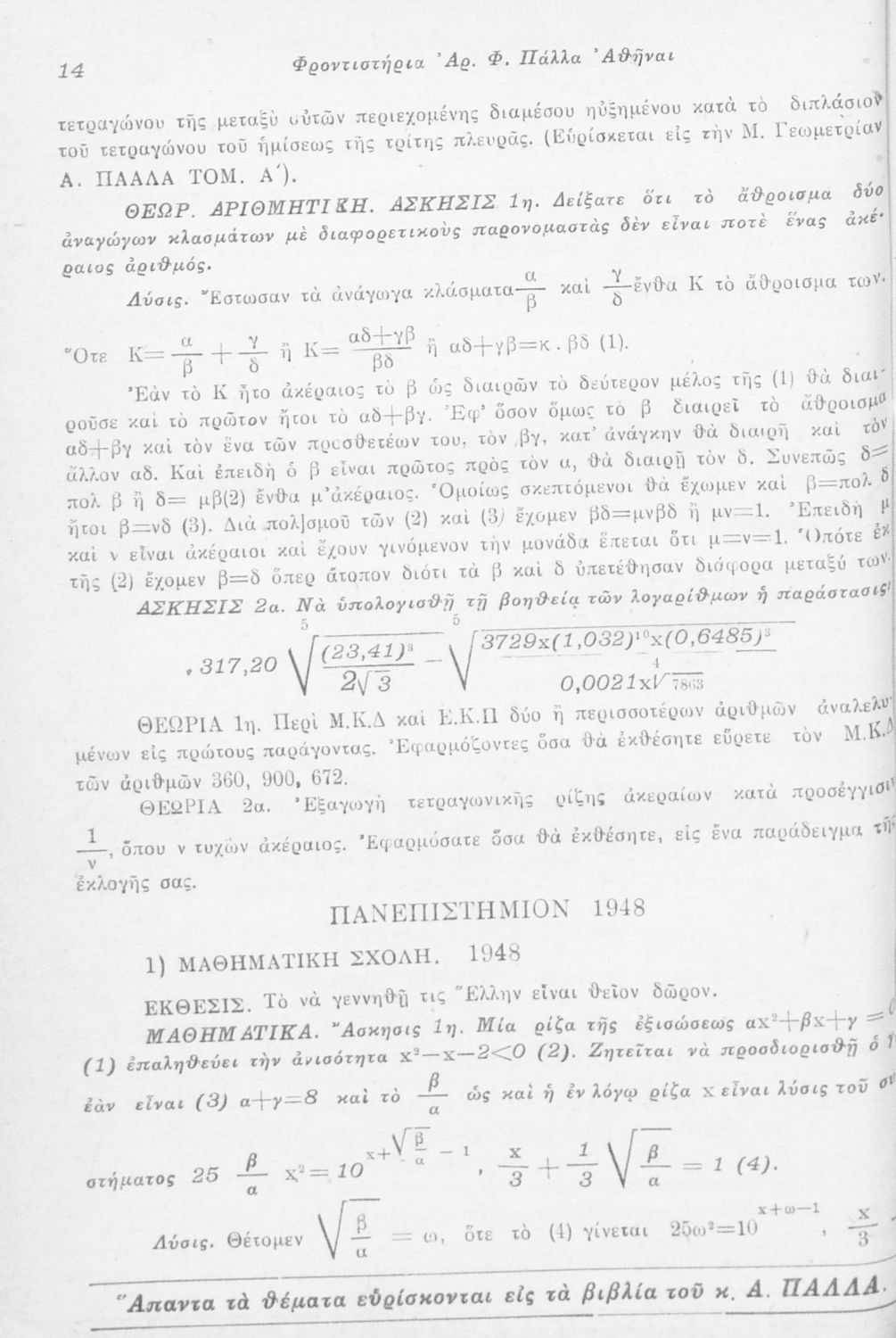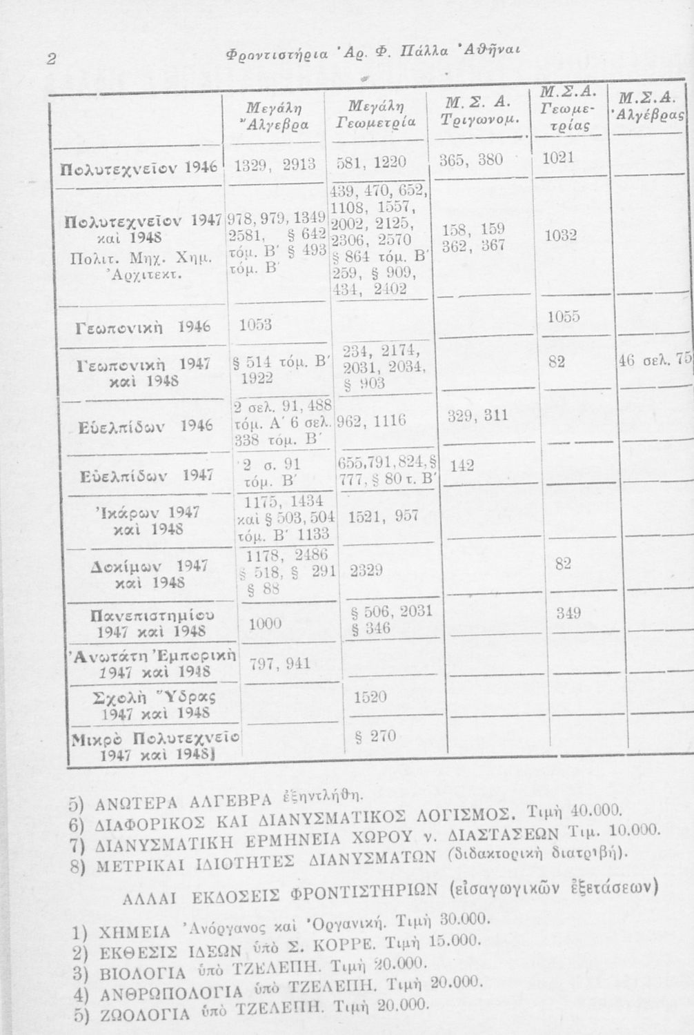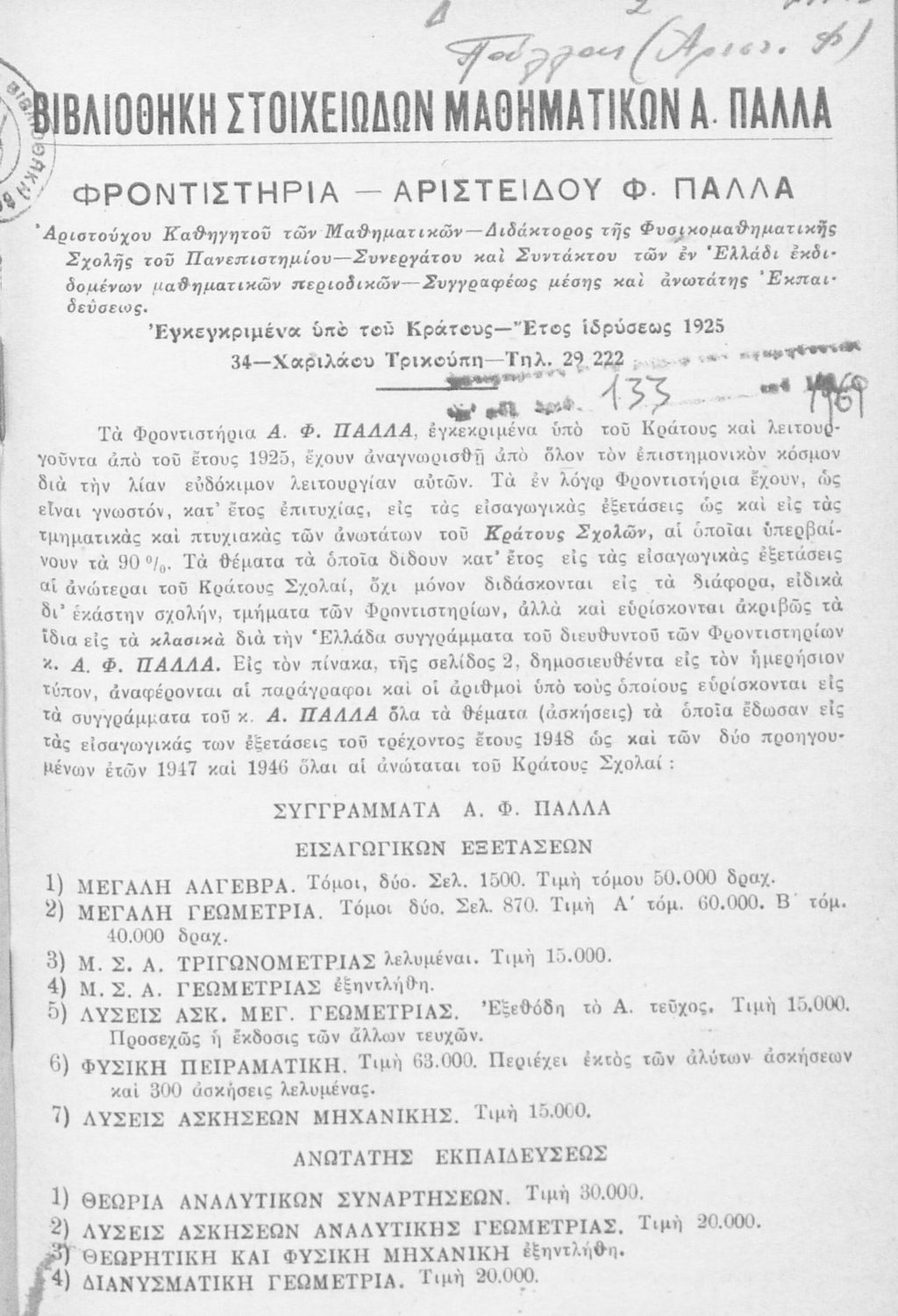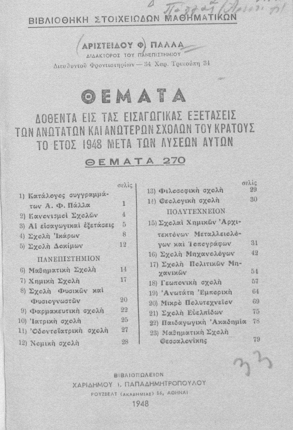 Κωδικός αναγνώρισης: 03-20632550 Τίτλος: Θέματα δοθέντα εις τας εισαγωγικάς εξετάσεις των ανωτάτων και ανωτέρων Σχολών του Κράτους το έτος 1948 μετά των λύσεων αυτών. Συγγραφέας: Αρισ. Φ. Πάλλας Μέγεθος και υπόστρωμα: Μαθητικό βοήθημα, σκληρό εξώφυλλο, 80 σελίδες. Σχήματα, σχεδιαγράμματα (ασπρόμαυρα). |