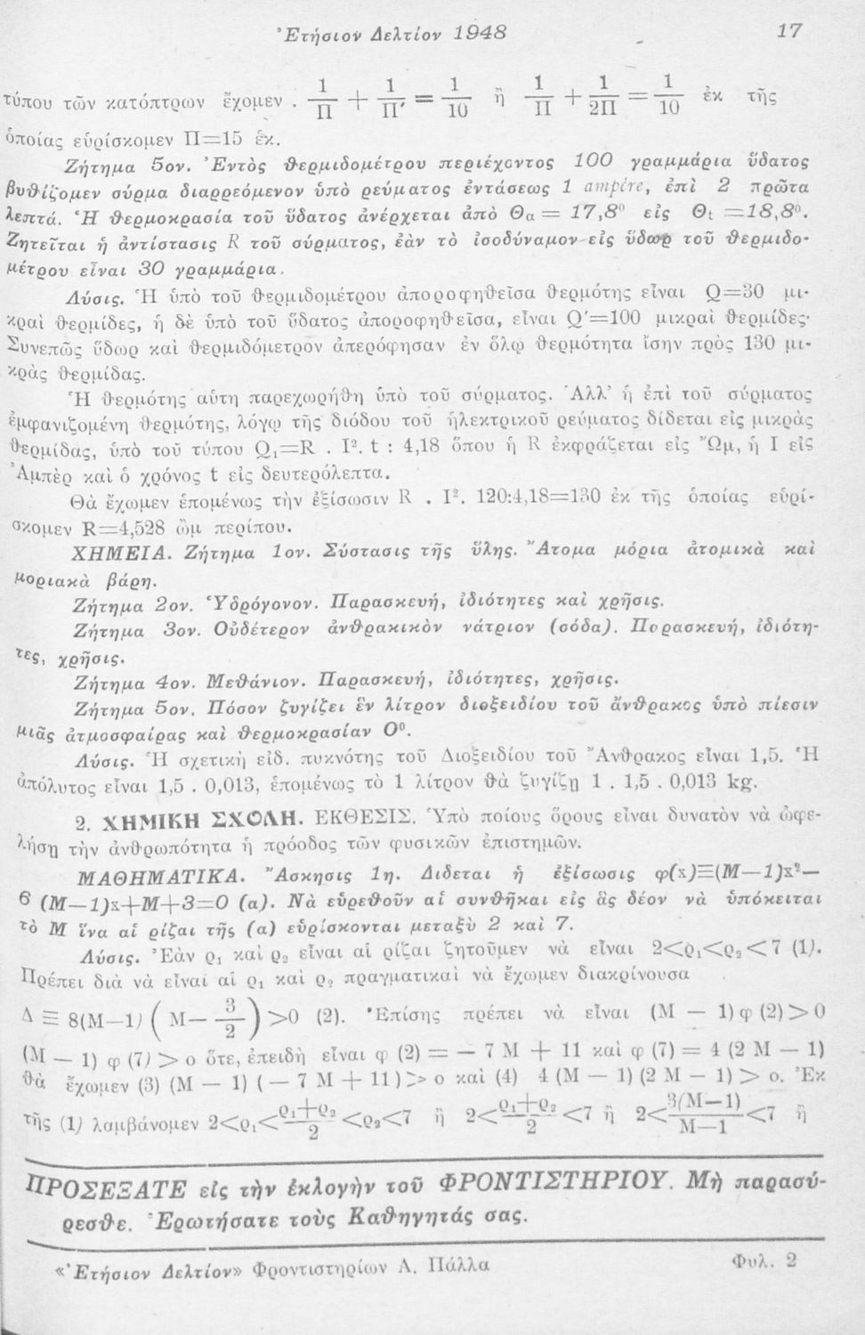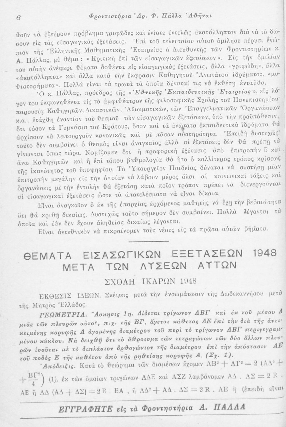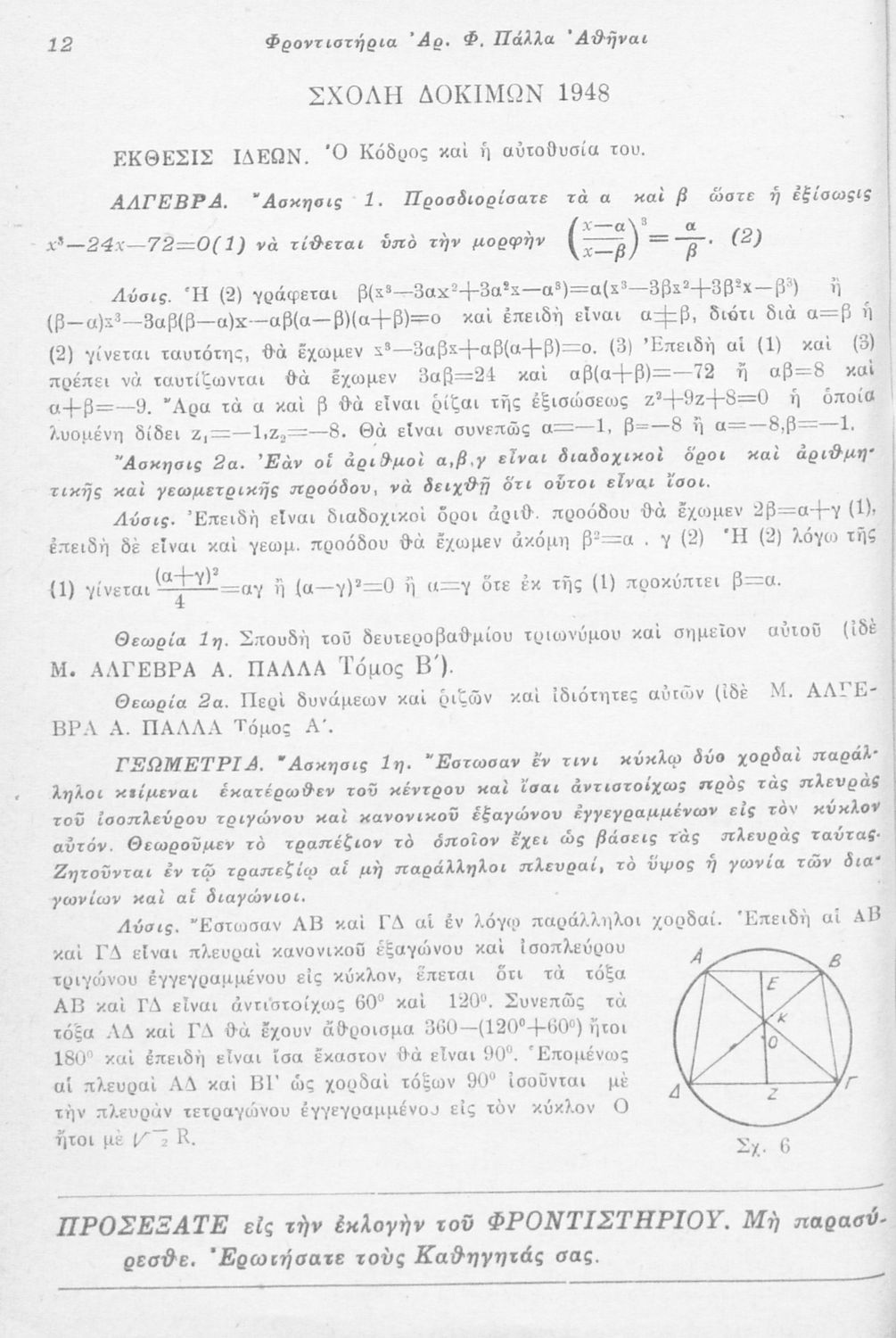 Κωδικός αναγνώρισης: 03-20632550 Τίτλος: Θέματα δοθέντα εις τας εισαγωγικάς εξετάσεις των ανωτάτων και ανωτέρων Σχολών του Κράτους το έτος 1948 μετά των λύσεων αυτών. Συγγραφέας: Αρισ. Φ. Πάλλας Μέγεθος και υπόστρωμα: Μαθητικό βοήθημα, σκληρό εξώφυλλο, 80 σελίδες. Σχήματα, σχεδιαγράμματα (ασπρόμαυρα). |