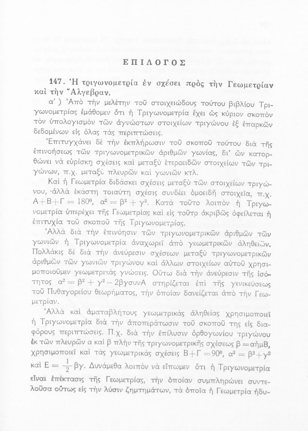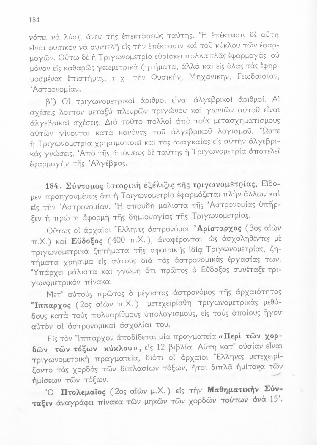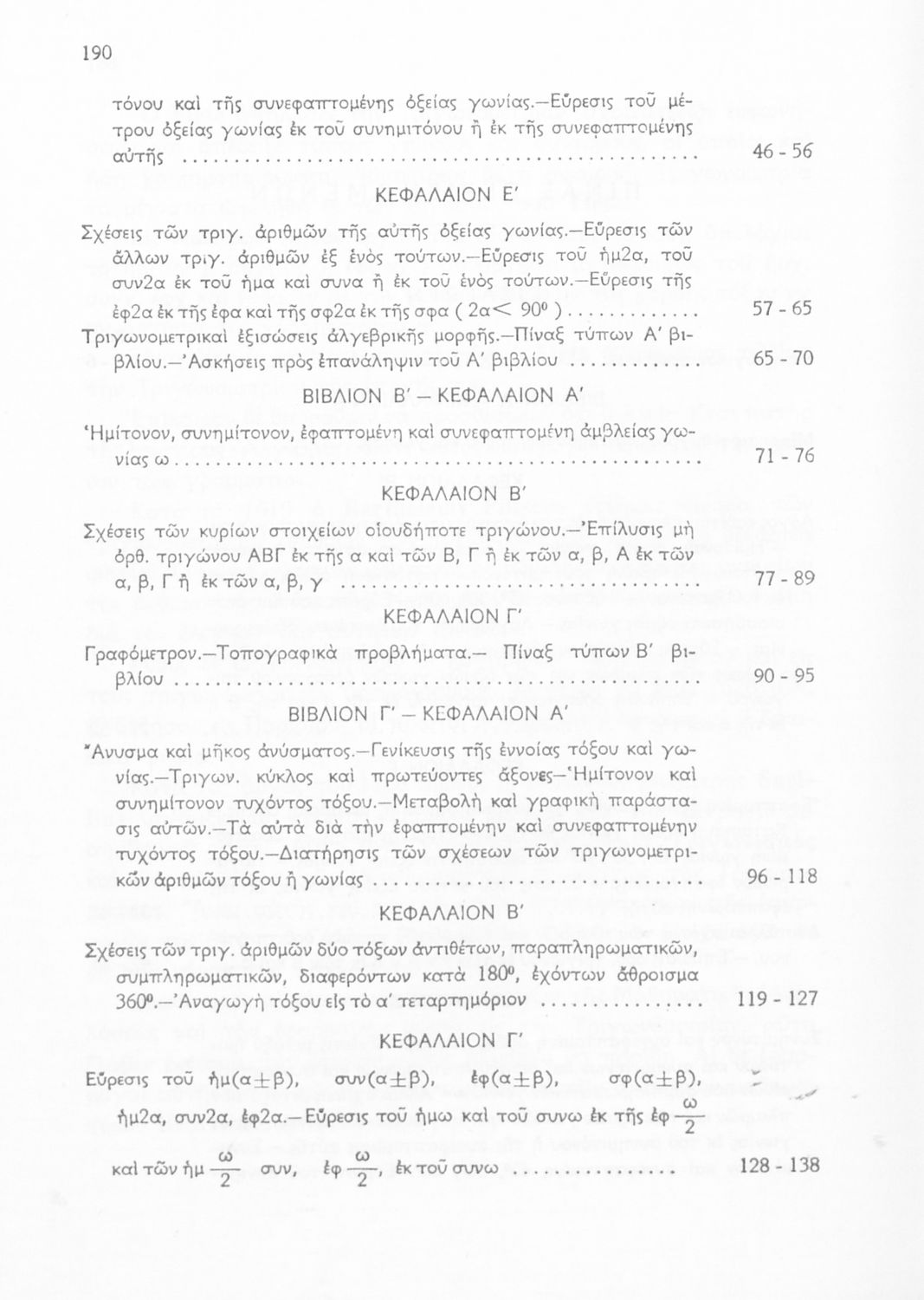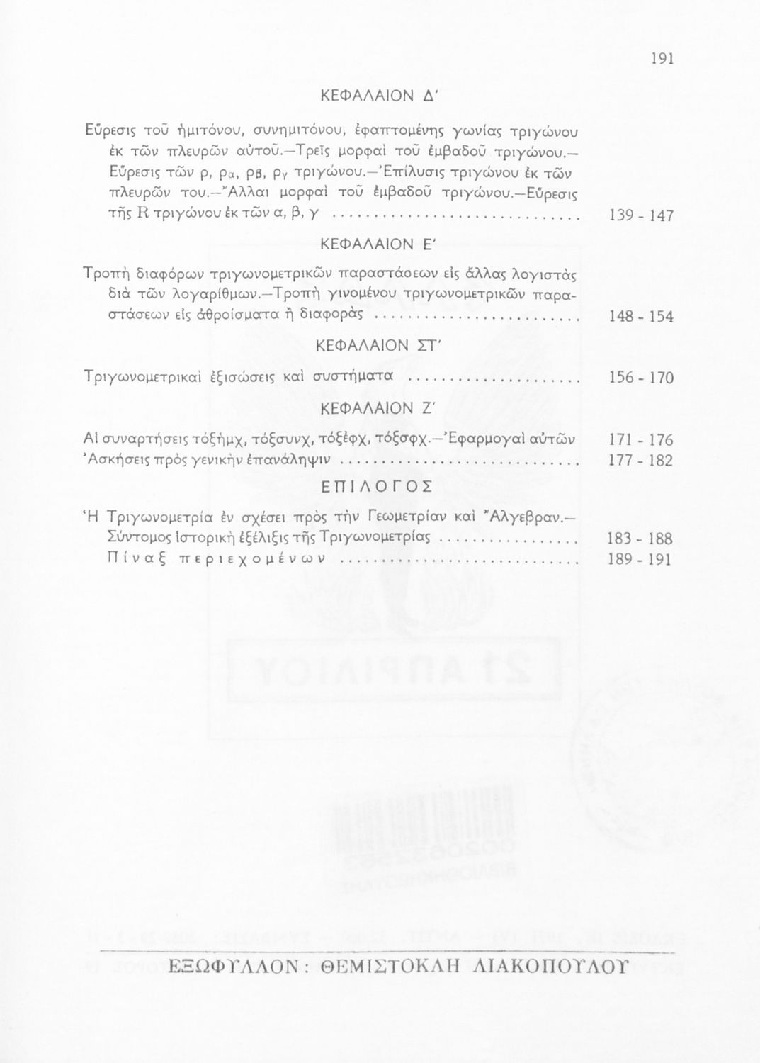 Βαθμίδα εκπαίδευσης: Δευτεροβάθμια Τάξη: Δ' Γυμνασίου Μάθημα: Τριγωνομετρία Γλώσσα: Καθαρεύουσα Παρουσίαση περιεχομένου: Μαθητικό βοήθημα Τριγωνομετρίας της Δ΄ Γυμνασίου. Το βιβλίο περιέχει ασκήσεις υπολογισμού των μεταξύ των διαφόρων στοιχείων των τριγώνων. |