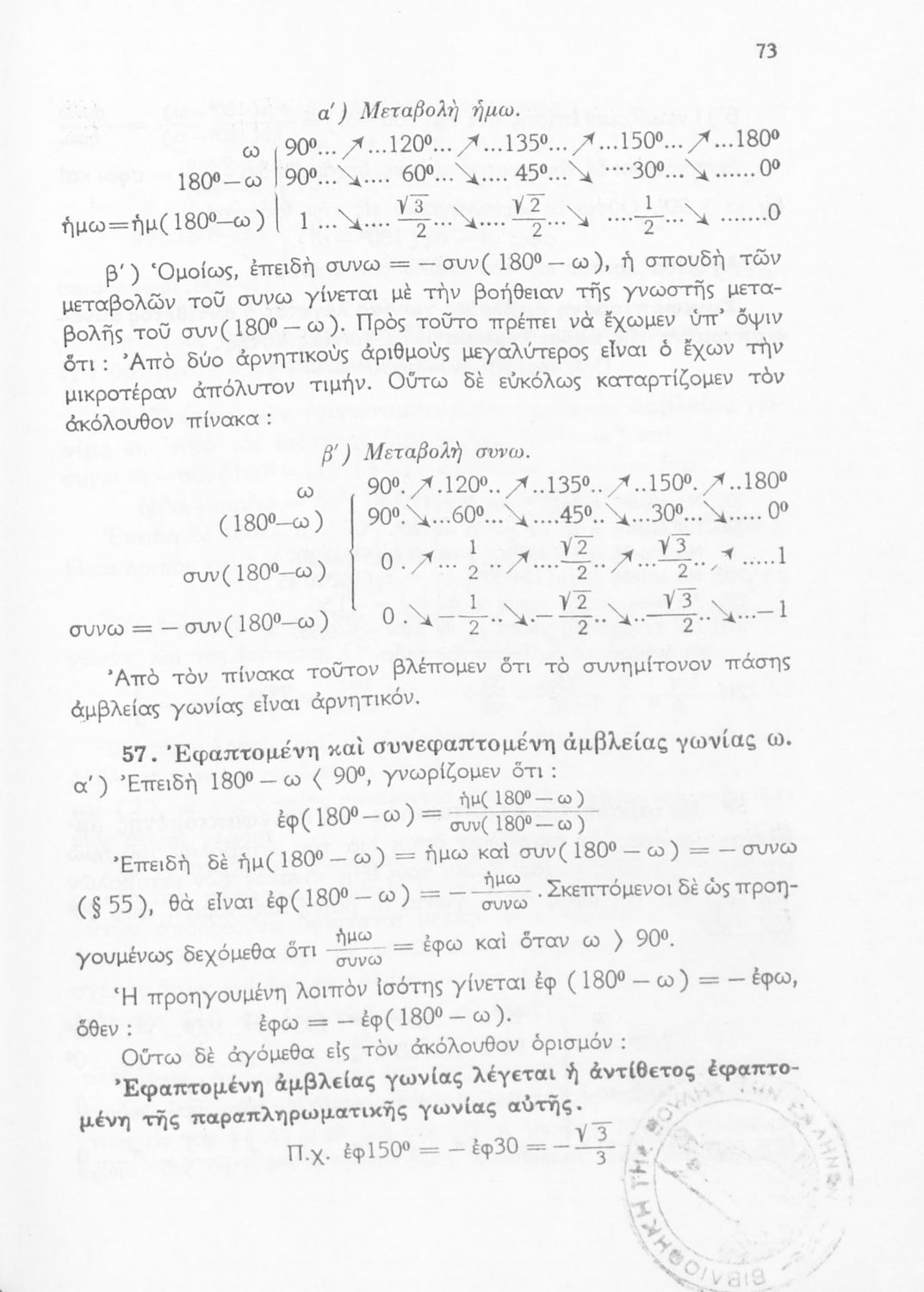 Βαθμίδα εκπαίδευσης: Δευτεροβάθμια Τάξη: Δ' Γυμνασίου Μάθημα: Τριγωνομετρία Γλώσσα: Καθαρεύουσα Παρουσίαση περιεχομένου: Μαθητικό βοήθημα Τριγωνομετρίας της Δ΄ Γυμνασίου. Το βιβλίο περιέχει ασκήσεις υπολογισμού των μεταξύ των διαφόρων στοιχείων των τριγώνων. |