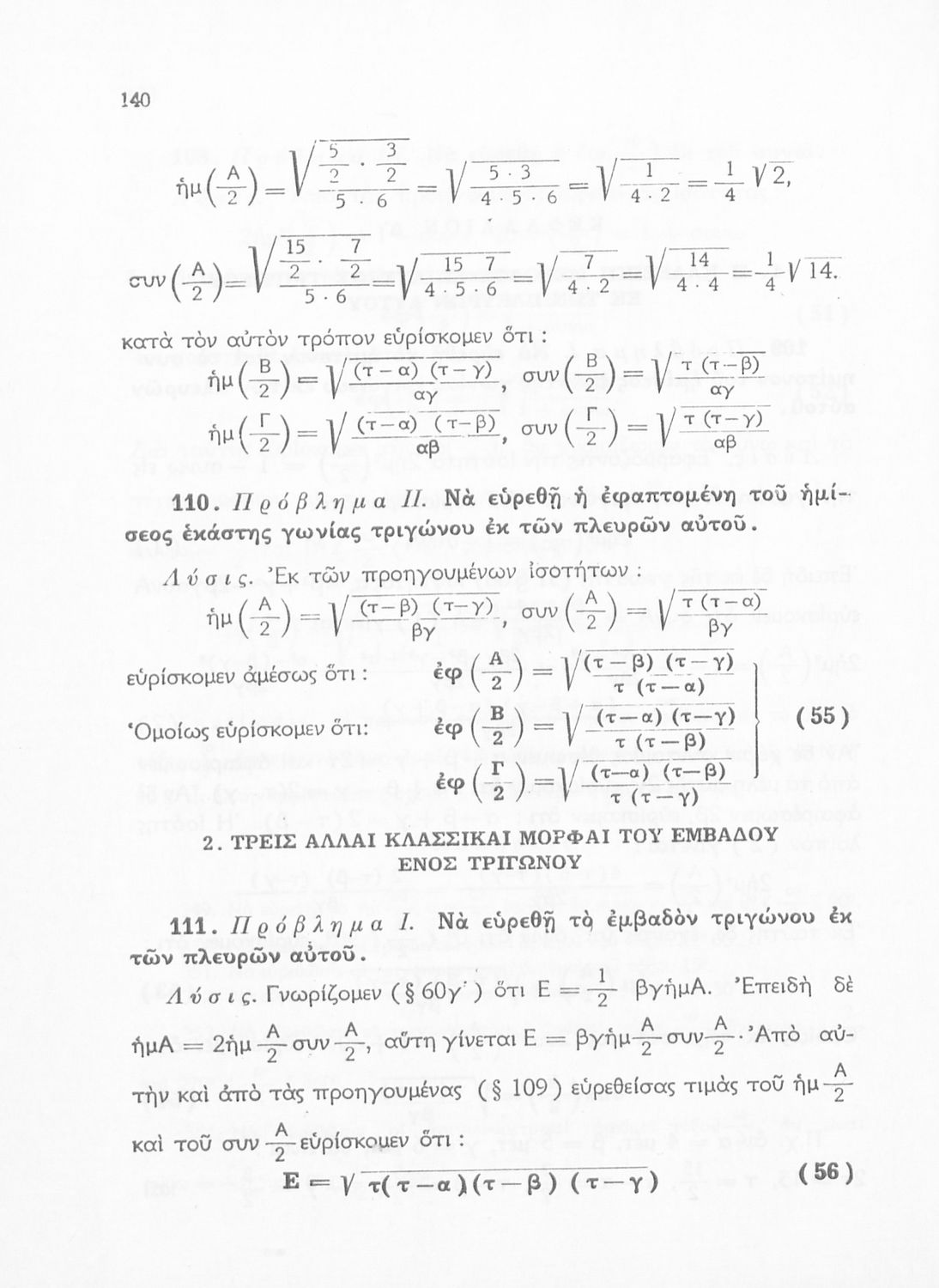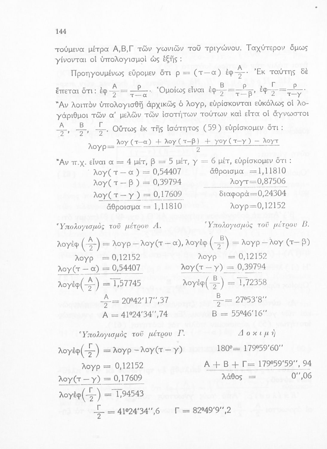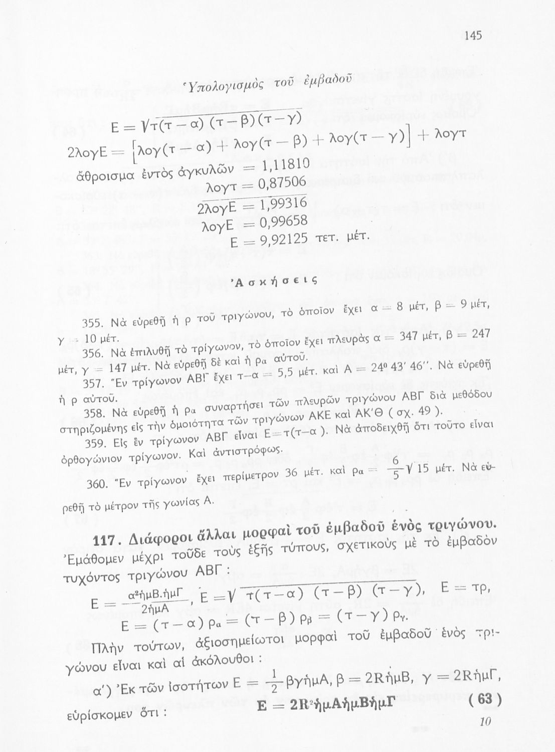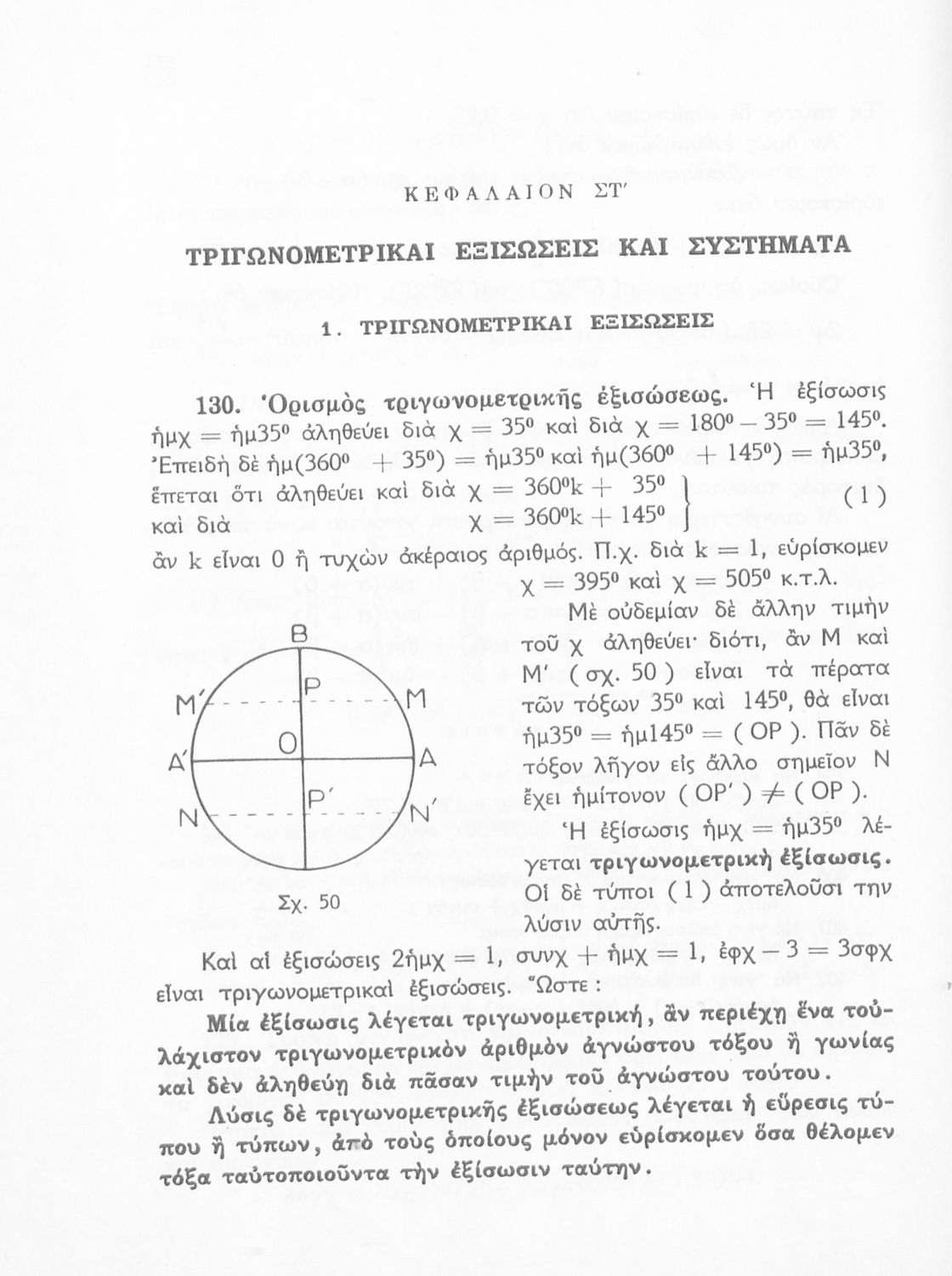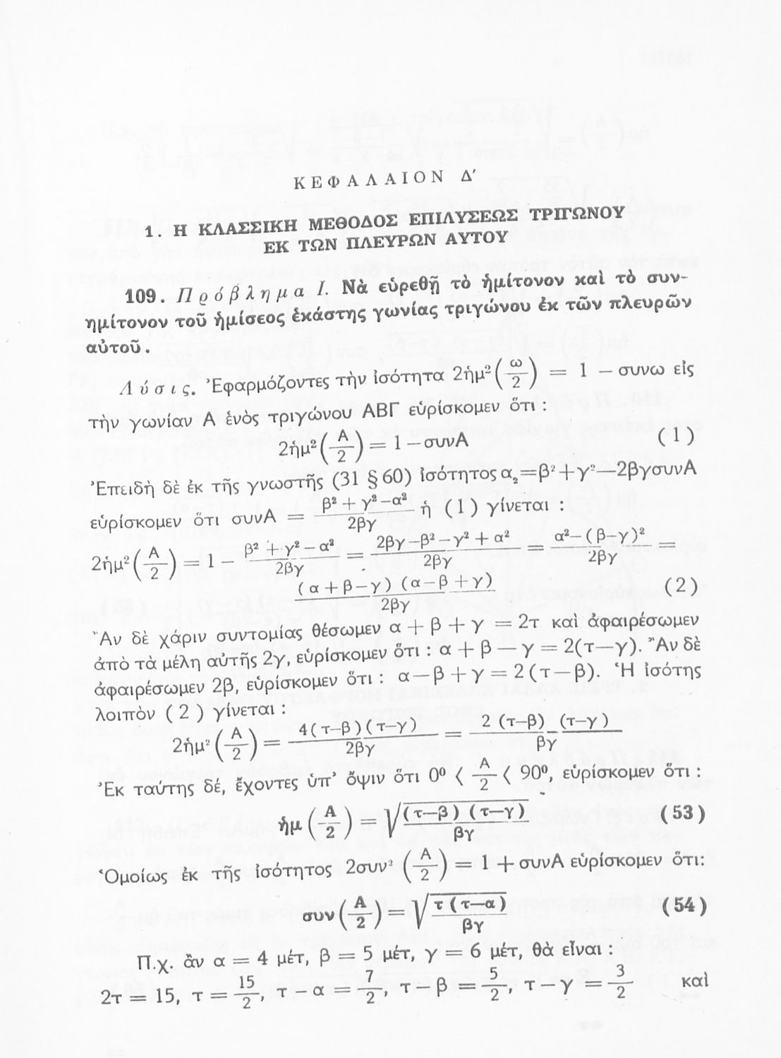 Βαθμίδα εκπαίδευσης: Δευτεροβάθμια Τάξη: Η' Γυμνασίου Μάθημα: Μαθηματικά Γλώσσα: Καθαρεύουσα Παρουσίαση περιεχομένου: Σχολικό εγχειρίδιο Τριγωνομετρίας της ΣΤ΄ Γυμνασίου. Το βιβλίο περιέχει ασκήσεις τριγωνομετρίας. Εισάγει τους μαθητές στα διαφορετικά είδη τριγώνων, τις ιδιότητες και τα χαρακτηριστικά τους καθώς και στον τρόπο υπολογισμού διαφόρων στοιχείων τους όπως το εμβαδόν και η περιφέρεια. |