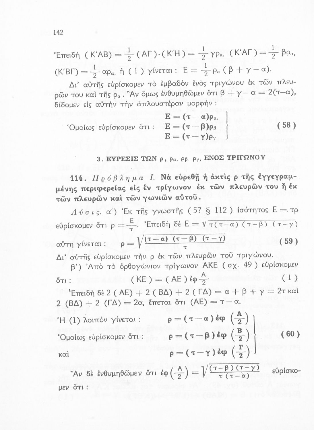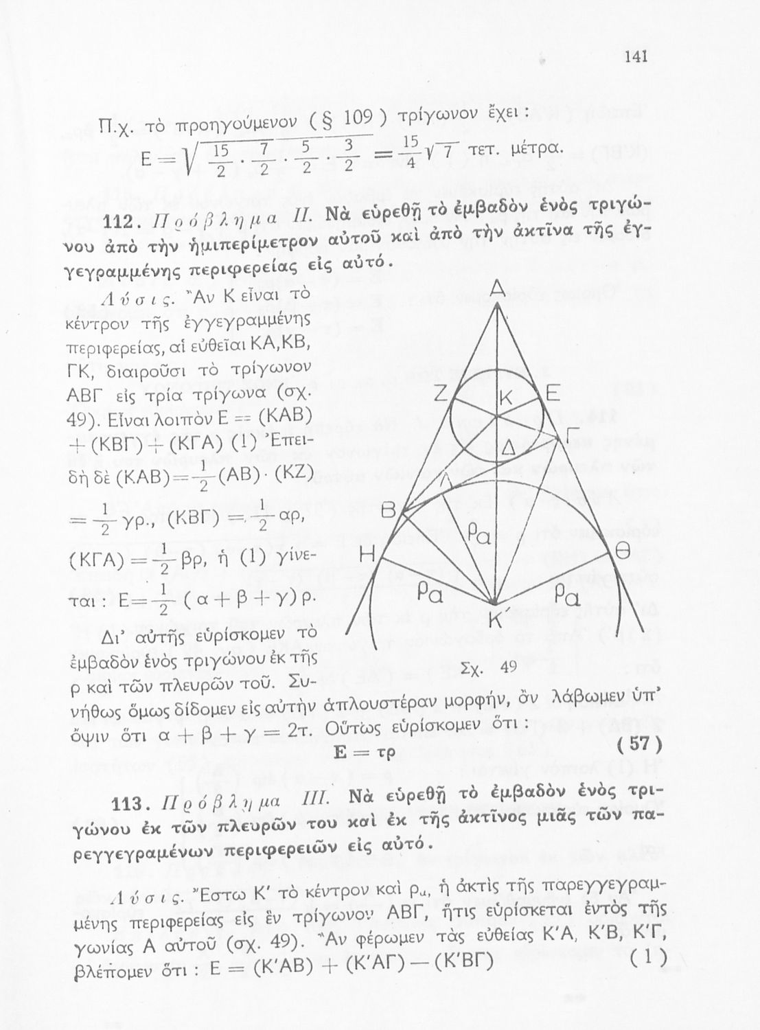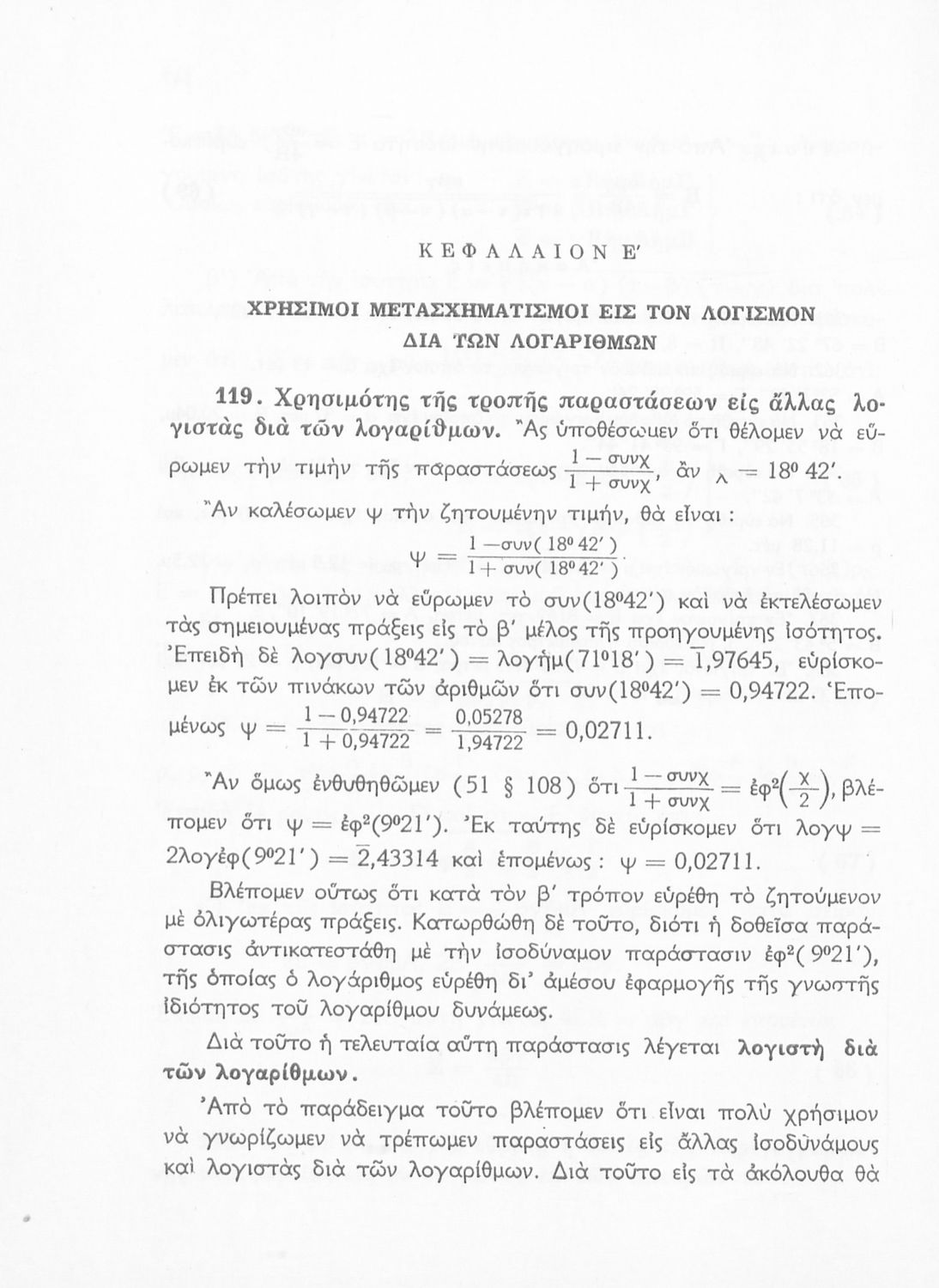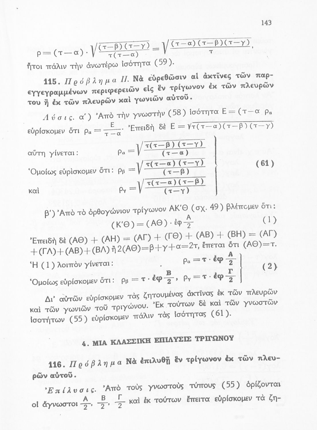 Βαθμίδα εκπαίδευσης: Δευτεροβάθμια Τάξη: Η' Γυμνασίου Μάθημα: Μαθηματικά Γλώσσα: Καθαρεύουσα Παρουσίαση περιεχομένου: Σχολικό εγχειρίδιο Τριγωνομετρίας της ΣΤ΄ Γυμνασίου. Το βιβλίο περιέχει ασκήσεις τριγωνομετρίας. Εισάγει τους μαθητές στα διαφορετικά είδη τριγώνων, τις ιδιότητες και τα χαρακτηριστικά τους καθώς και στον τρόπο υπολογισμού διαφόρων στοιχείων τους όπως το εμβαδόν και η περιφέρεια. |