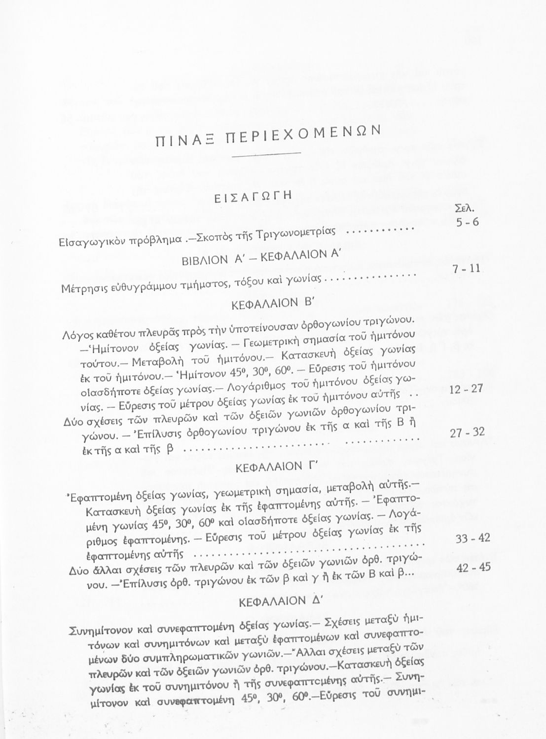 Σχολικό εγχειρίδιο Τριγωνομετρίας της Η' Γυμνασίου. Το βιβλίο περιέχει ασκήσεις τριγωνομετρίας. Εισάγει τους μαθητές στα διαφορετικά είδη τριγώνων, τις ιδιότητες και τα χαρακτηριστικά τους καθώς και στον τρόπο
