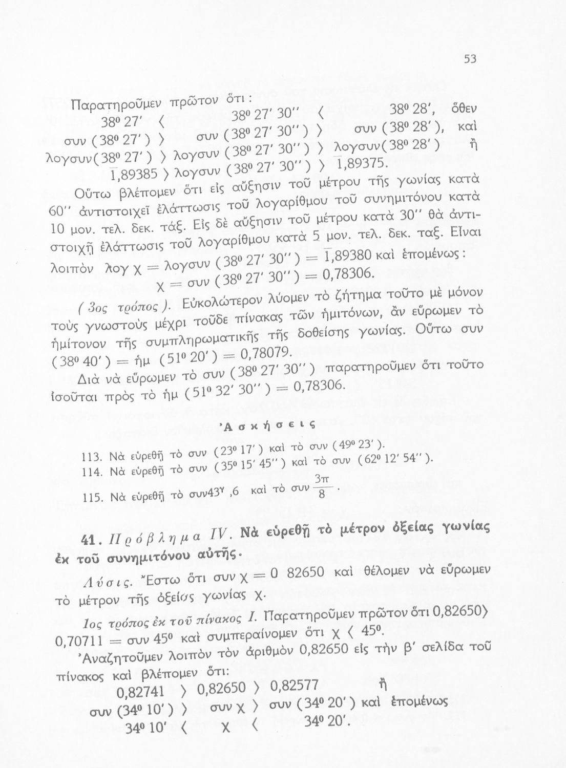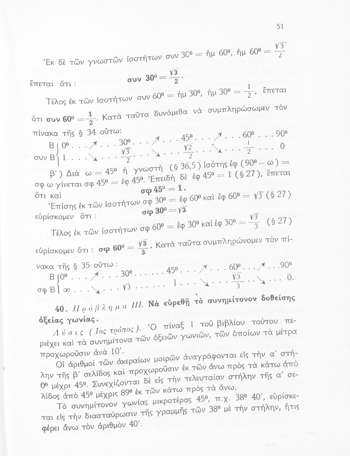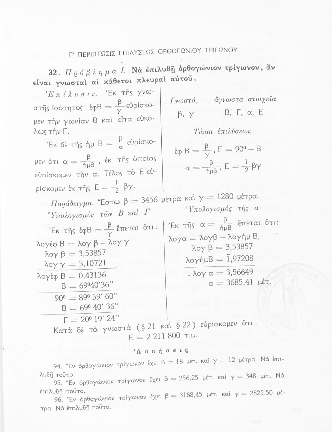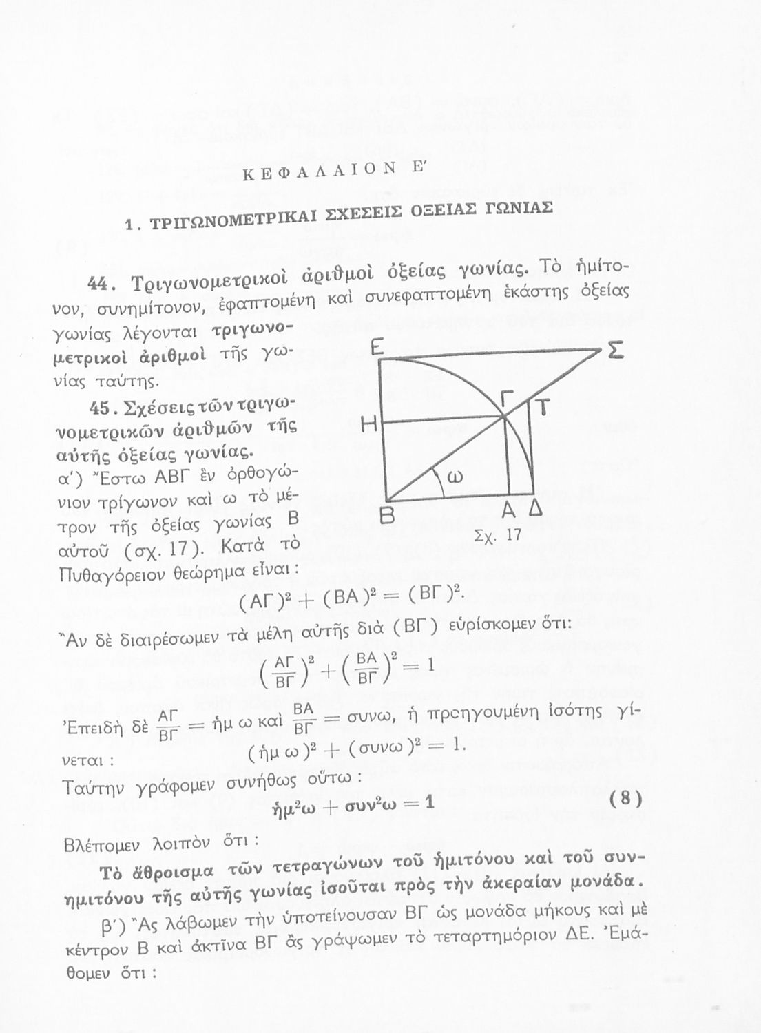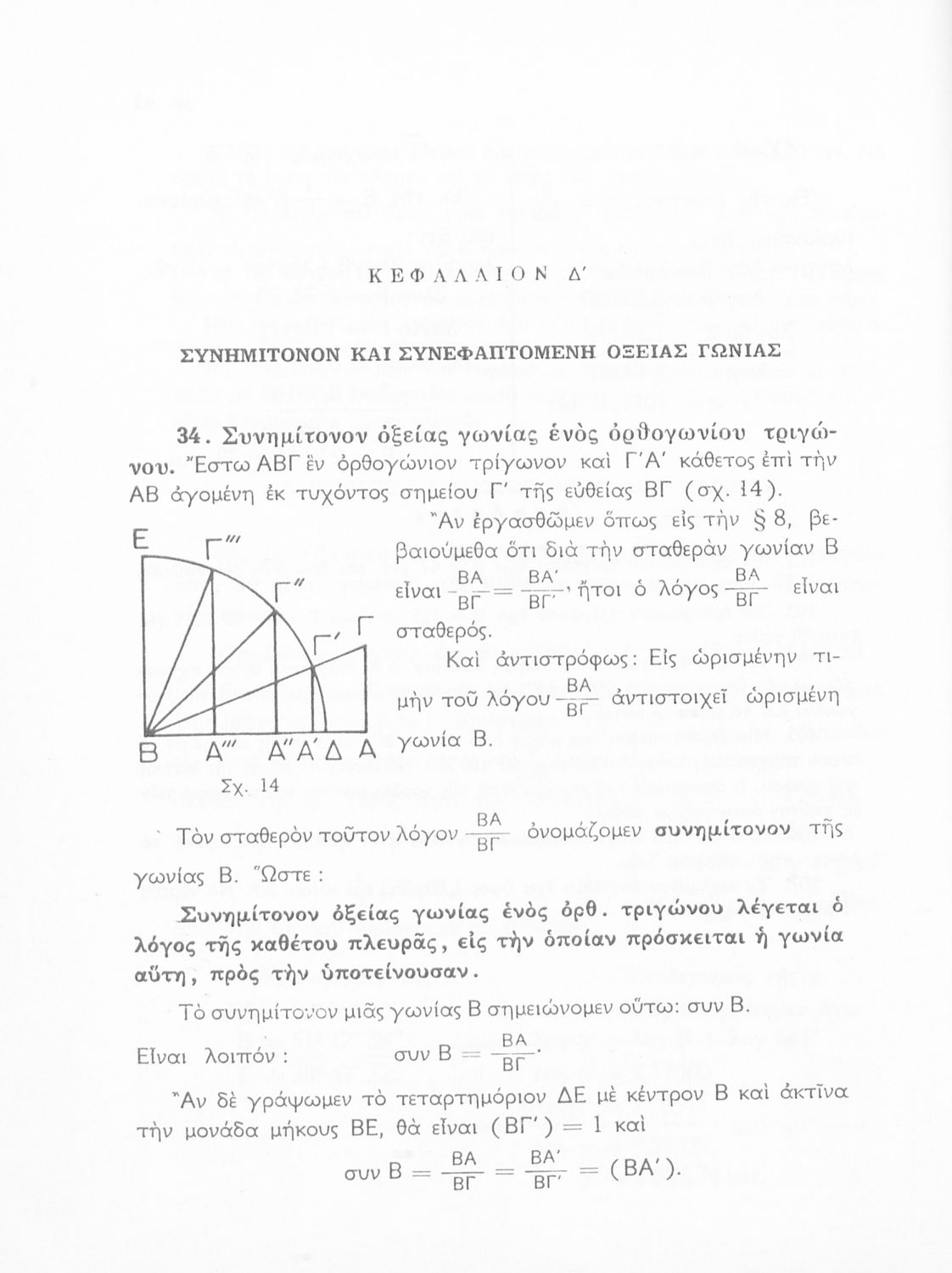 Βαθμίδα εκπαίδευσης: Δευτεροβάθμια Τάξη: Η' Γυμνασίου Μάθημα: Μαθηματικά Γλώσσα: Καθαρεύουσα Παρουσίαση περιεχομένου: Σχολικό εγχειρίδιο Τριγωνομετρίας της ΣΤ΄ Γυμνασίου. Το βιβλίο περιέχει ασκήσεις τριγωνομετρίας. Εισάγει τους μαθητές στα διαφορετικά είδη τριγώνων, τις ιδιότητες και τα χαρακτηριστικά τους καθώς και στον τρόπο υπολογισμού διαφόρων στοιχείων τους όπως το εμβαδόν και η περιφέρεια. |