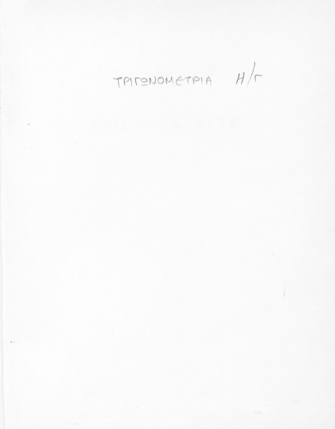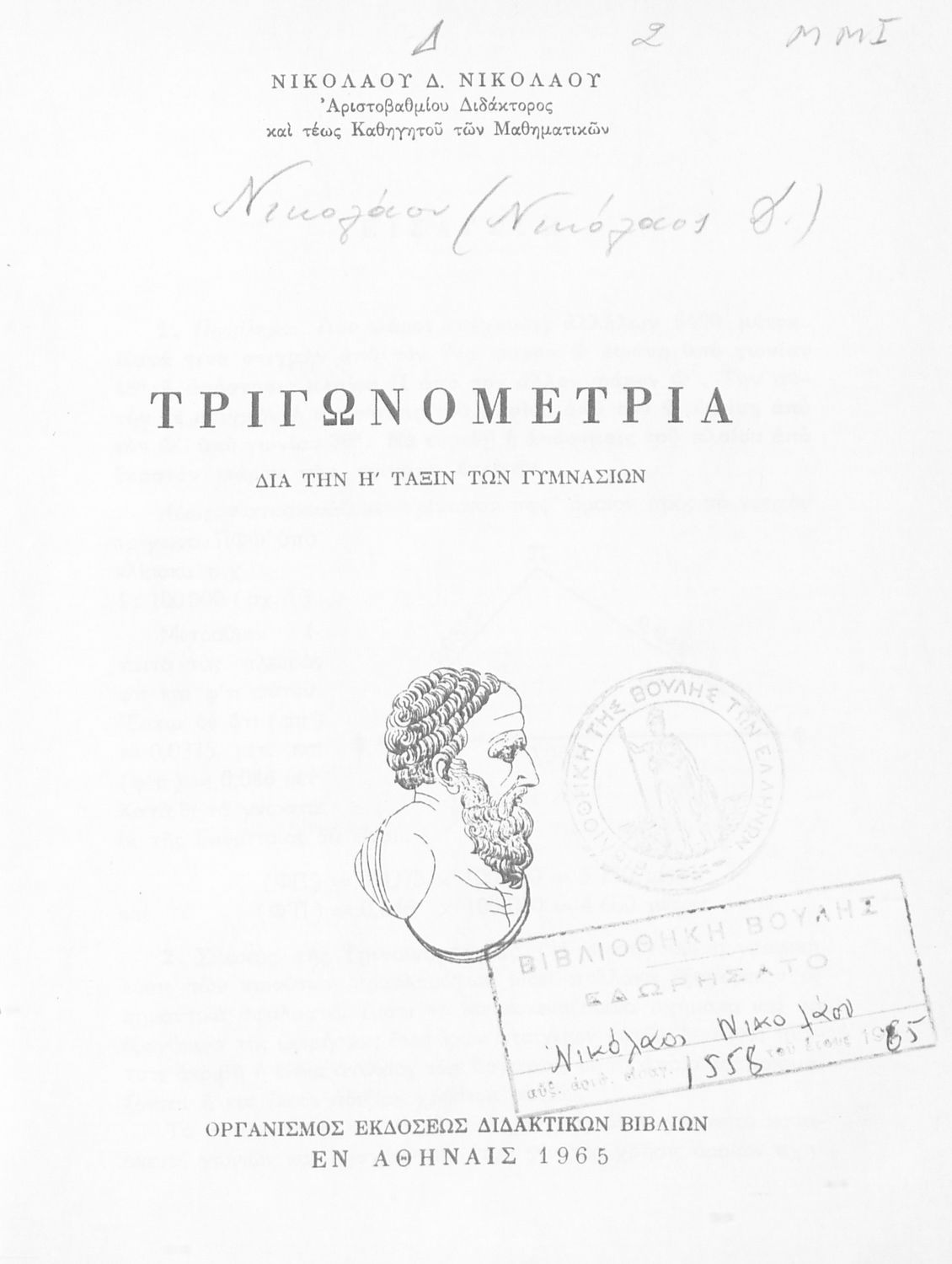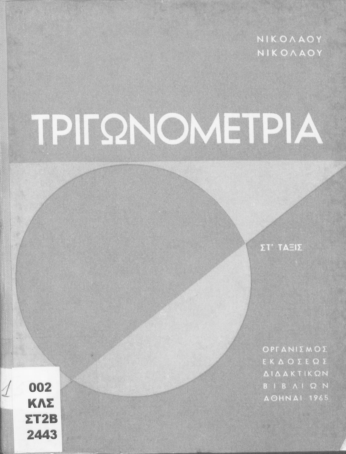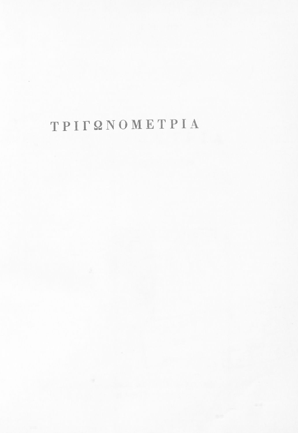 Βαθμίδα εκπαίδευσης: Δευτεροβάθμια Τάξη: Η' Γυμνασίου Μάθημα: Μαθηματικά Γλώσσα: Καθαρεύουσα Παρουσίαση περιεχομένου: Σχολικό εγχειρίδιο Τριγωνομετρίας της ΣΤ΄ Γυμνασίου. Το βιβλίο περιέχει ασκήσεις τριγωνομετρίας. Εισάγει τους μαθητές στα διαφορετικά είδη τριγώνων, τις ιδιότητες και τα χαρακτηριστικά τους καθώς και στον τρόπο υπολογισμού διαφόρων στοιχείων τους όπως το εμβαδόν και η περιφέρεια. |
