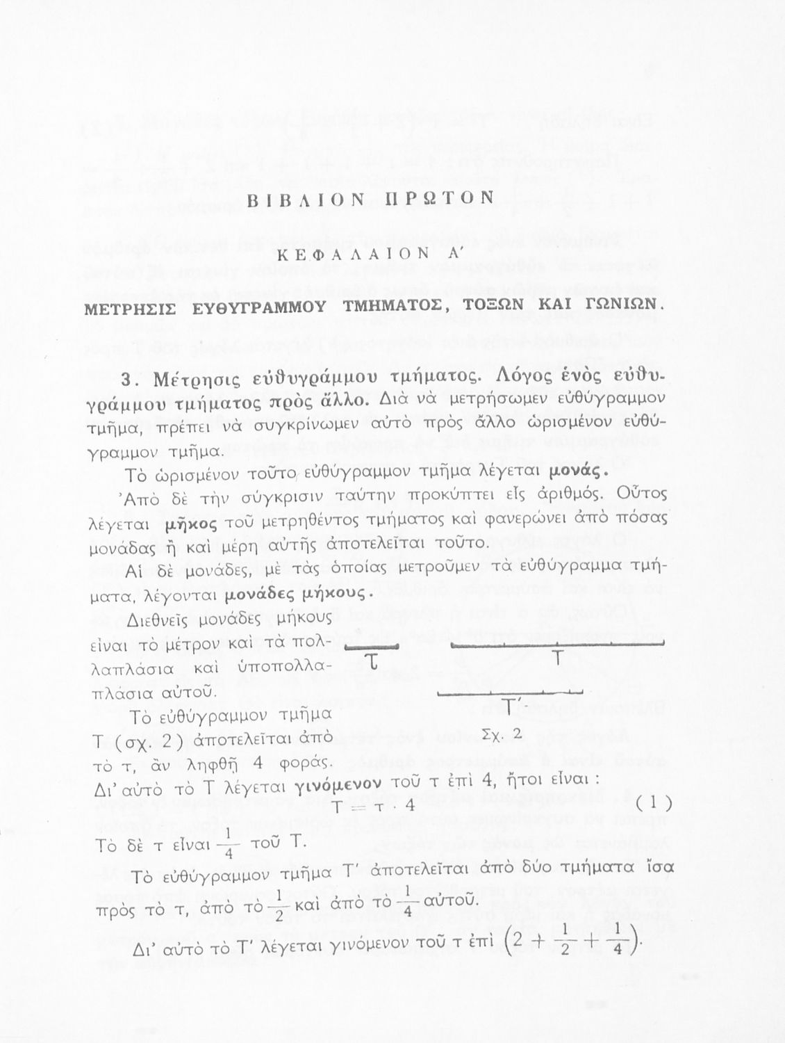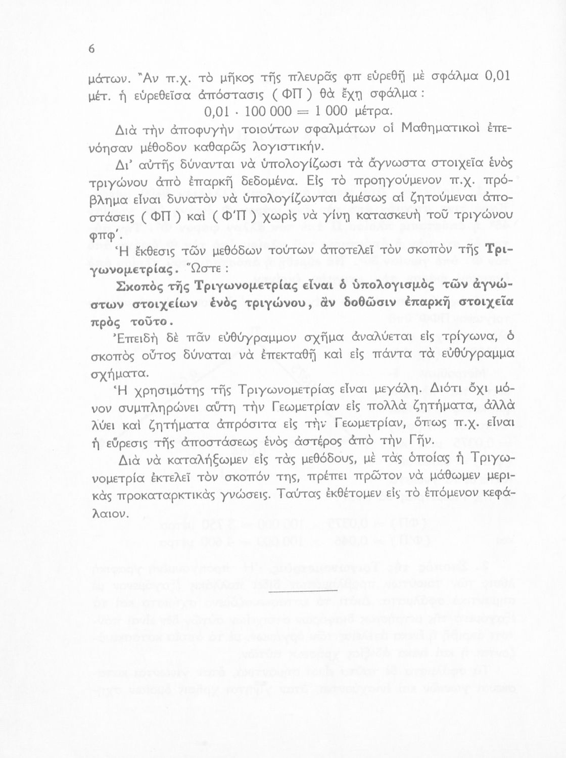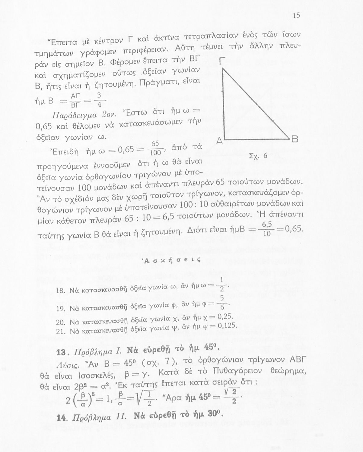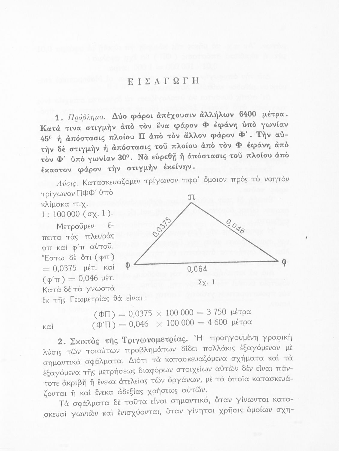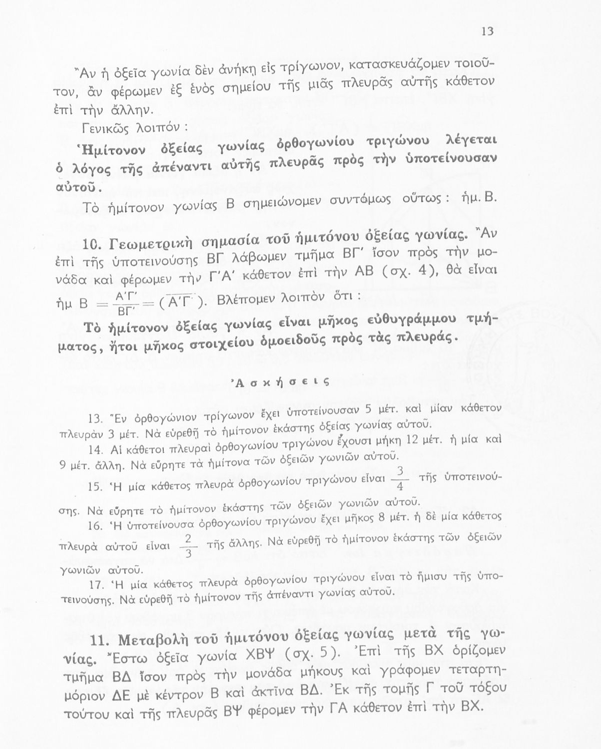 Βαθμίδα εκπαίδευσης: Δευτεροβάθμια Τάξη: Η' Γυμνασίου Μάθημα: Μαθηματικά Γλώσσα: Καθαρεύουσα Παρουσίαση περιεχομένου: Σχολικό εγχειρίδιο Τριγωνομετρίας της ΣΤ΄ Γυμνασίου. Το βιβλίο περιέχει ασκήσεις τριγωνομετρίας. Εισάγει τους μαθητές στα διαφορετικά είδη τριγώνων, τις ιδιότητες και τα χαρακτηριστικά τους καθώς και στον τρόπο υπολογισμού διαφόρων στοιχείων τους όπως το εμβαδόν και η περιφέρεια. |