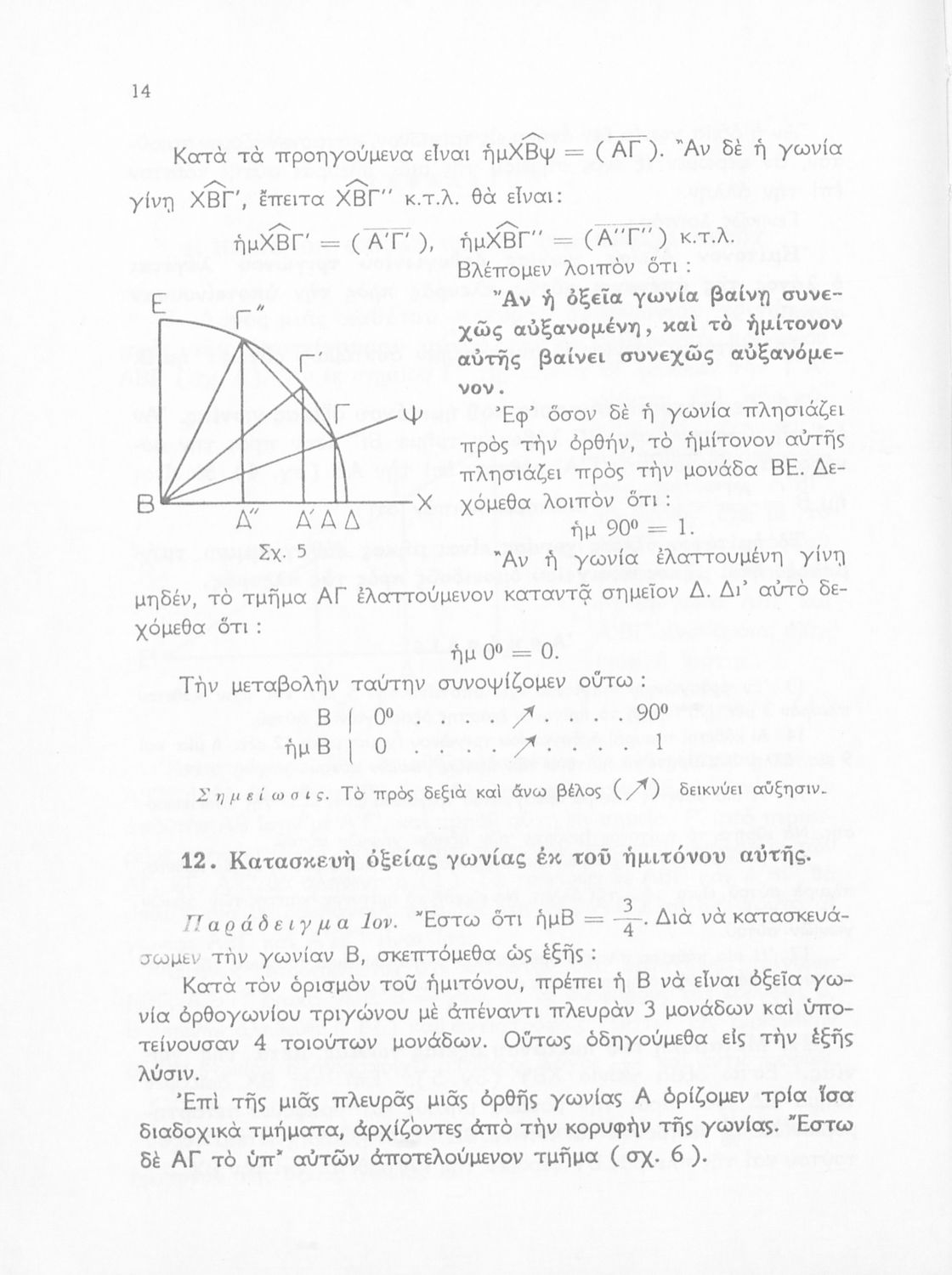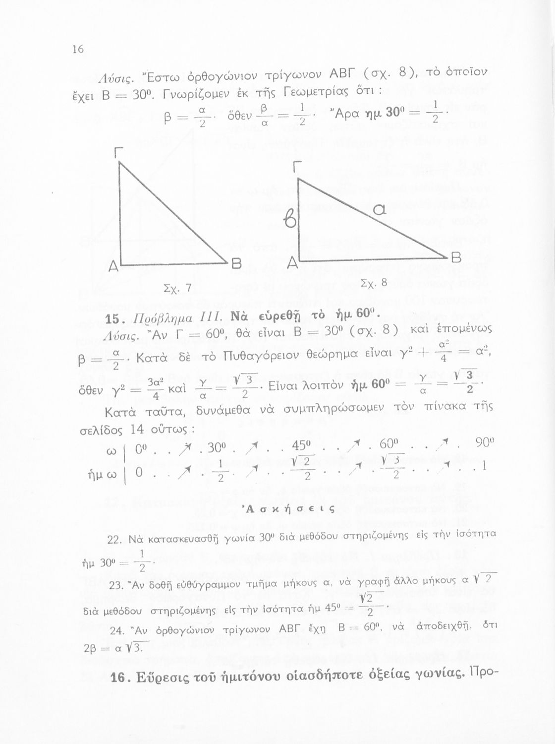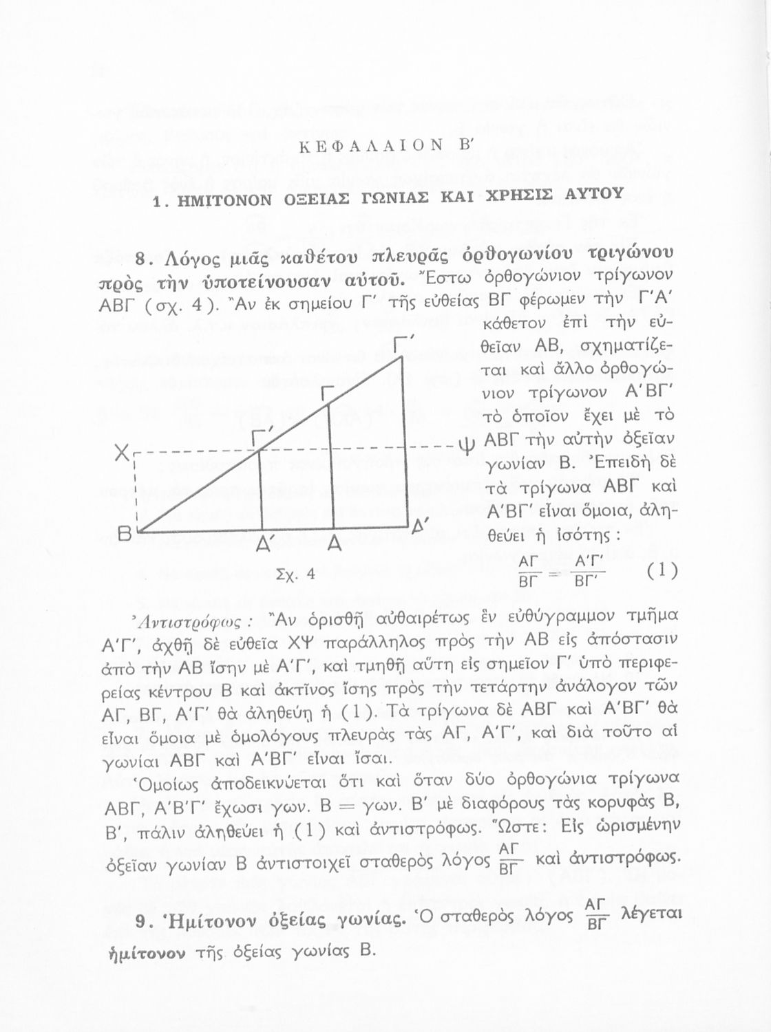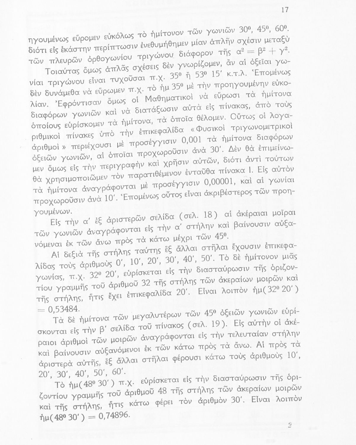 Βαθμίδα εκπαίδευσης: Δευτεροβάθμια Τάξη: Η' Γυμνασίου Μάθημα: Μαθηματικά Γλώσσα: Καθαρεύουσα Παρουσίαση περιεχομένου: Σχολικό εγχειρίδιο Τριγωνομετρίας της ΣΤ΄ Γυμνασίου. Το βιβλίο περιέχει ασκήσεις τριγωνομετρίας. Εισάγει τους μαθητές στα διαφορετικά είδη τριγώνων, τις ιδιότητες και τα χαρακτηριστικά τους καθώς και στον τρόπο υπολογισμού διαφόρων στοιχείων τους όπως το εμβαδόν και η περιφέρεια. |