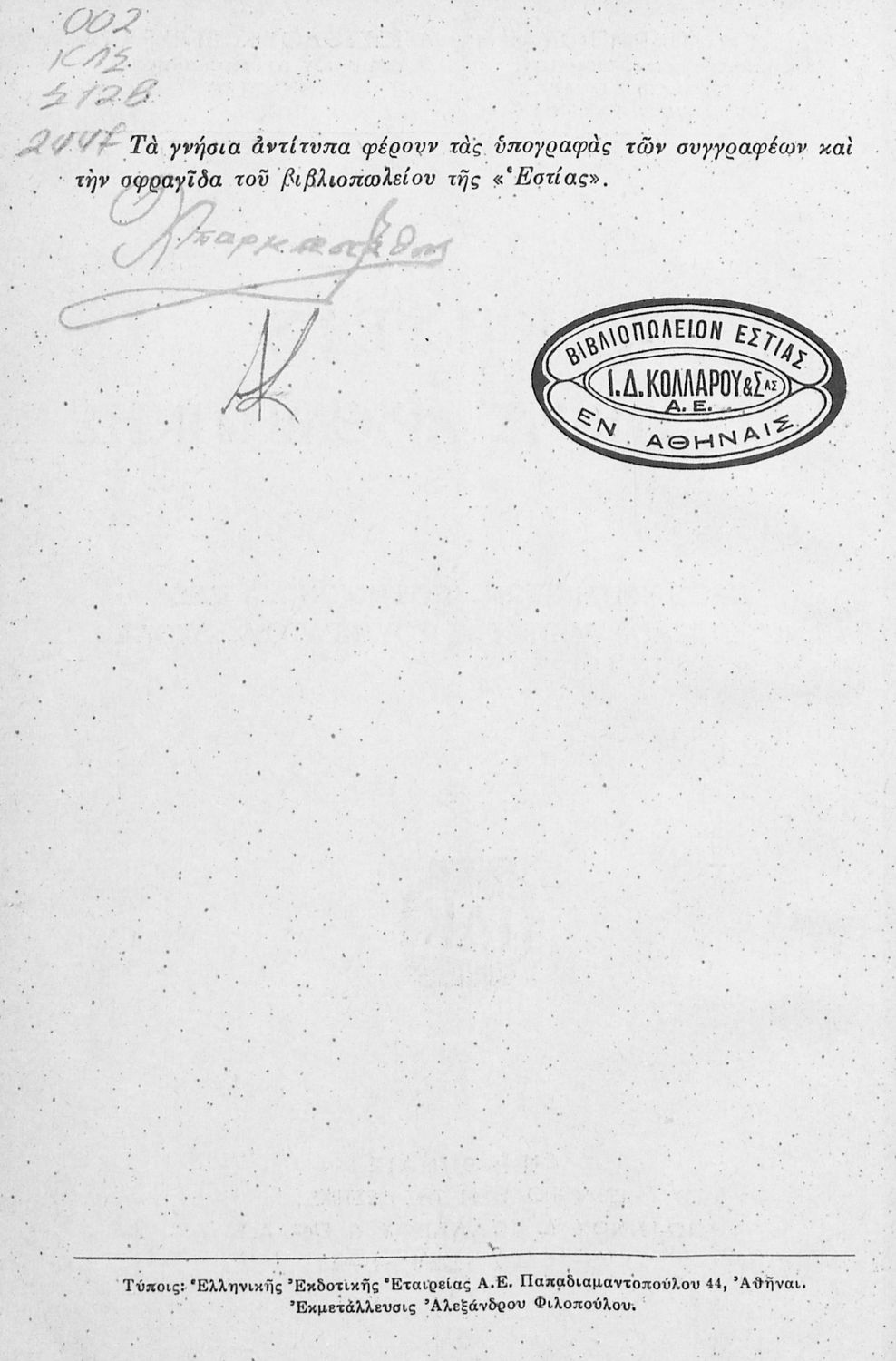 Εκδότης: Ιωάννης Δ. Κολλάρος, Βιβλιοπωλείο της "Εστίας" Έτος έκδοσης: 1953 Τόπος έκδοσης: Αθήνα |
