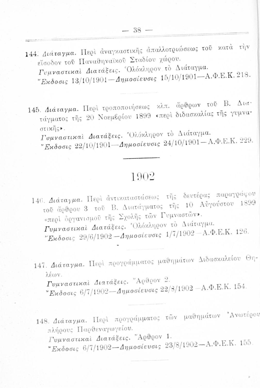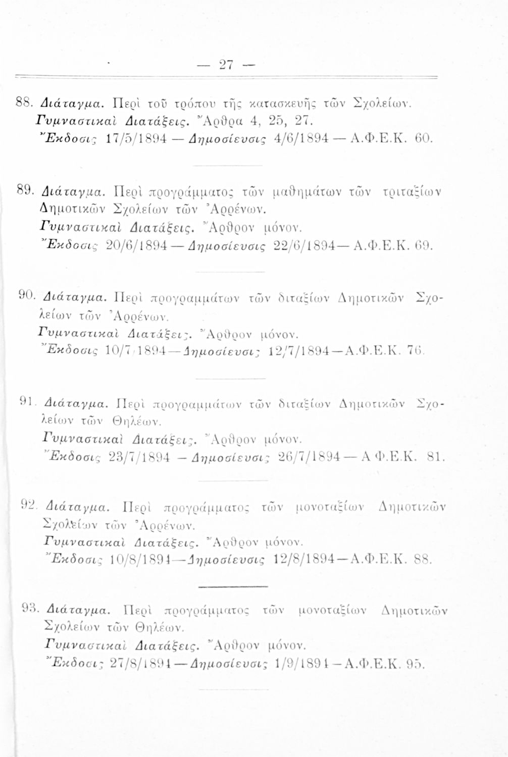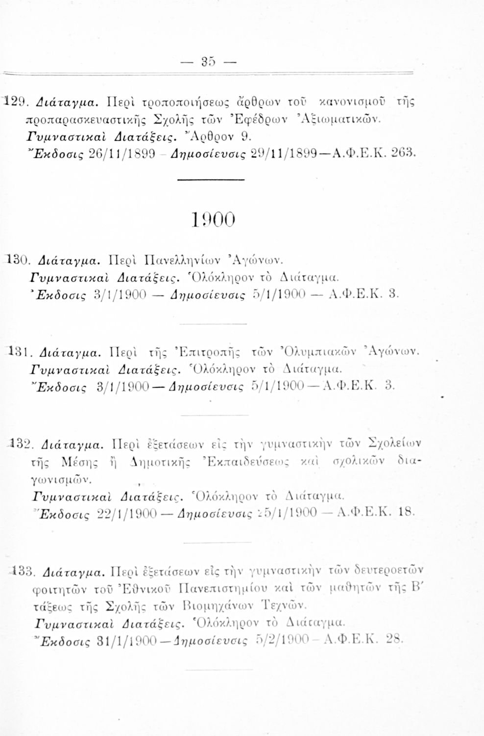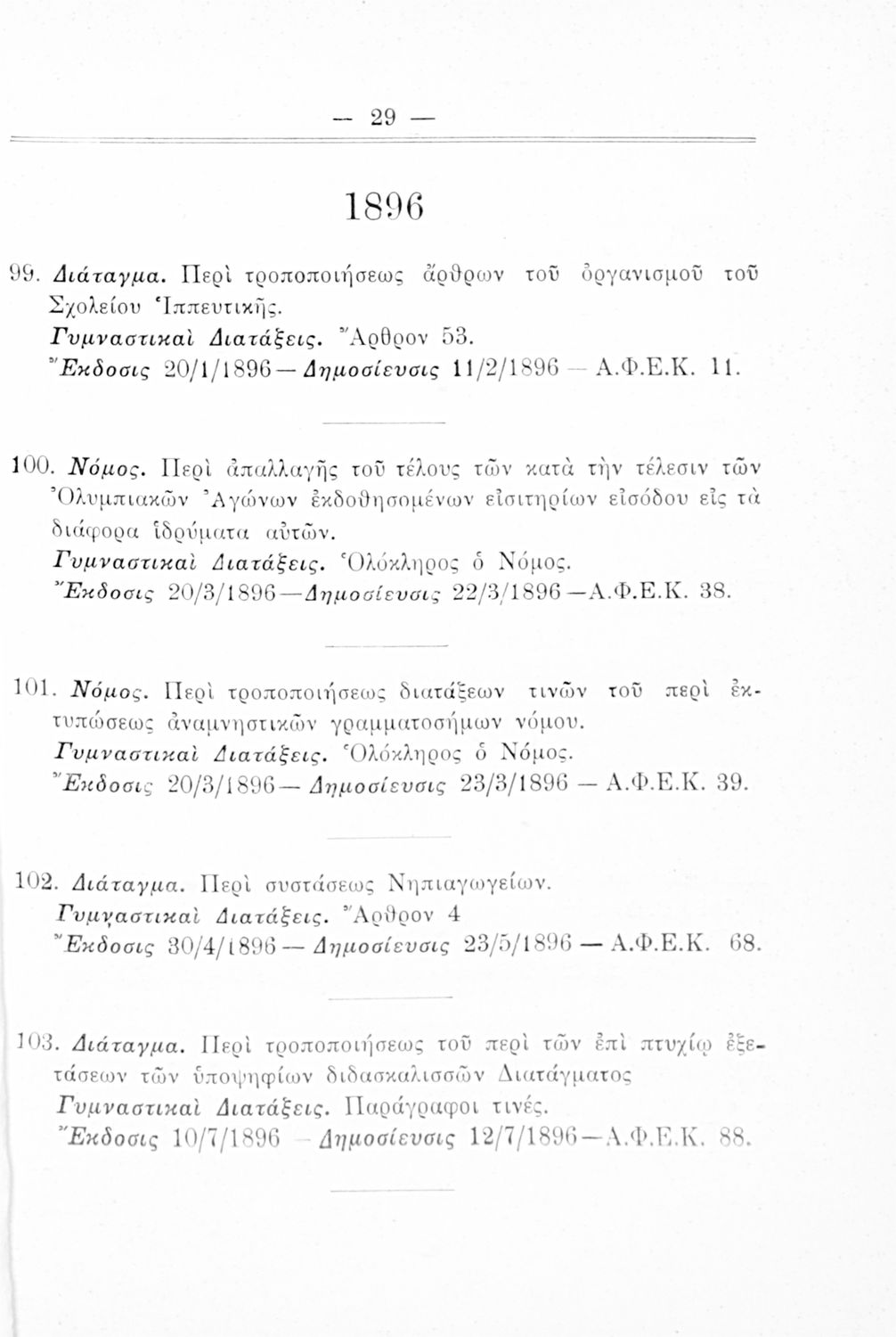 Παρουσίαση περιεχομένου: Καταγραφή νόμων, διαταγμάτων και γυμναστικών διατάξεων που αφορούν την περίοδο 1834-1933.