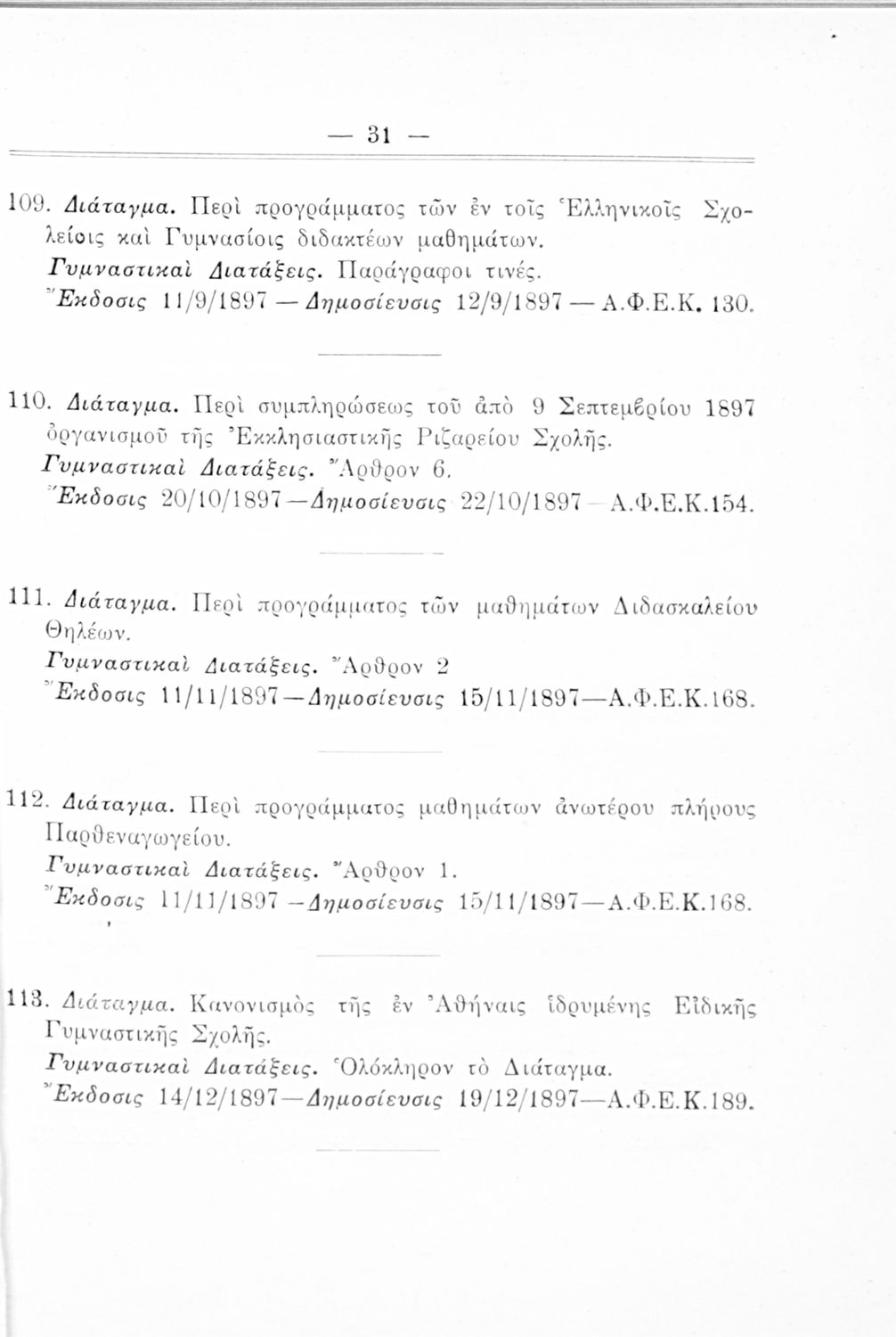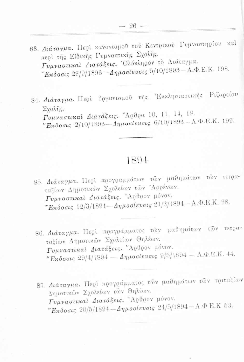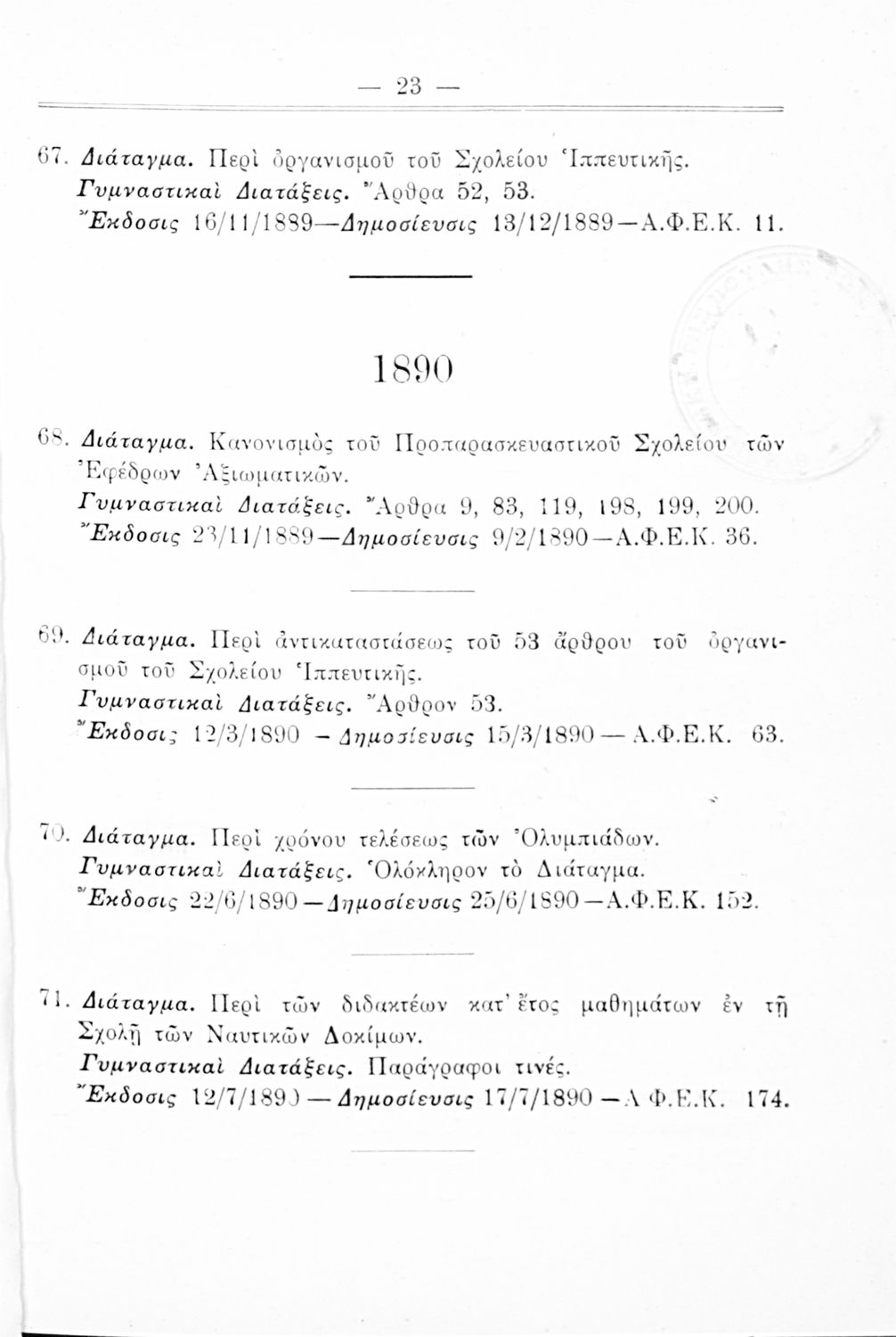 Παρουσίαση περιεχομένου: Καταγραφή νόμων, διαταγμάτων και γυμναστικών διατάξεων που αφορούν την περίοδο 1834-1933.