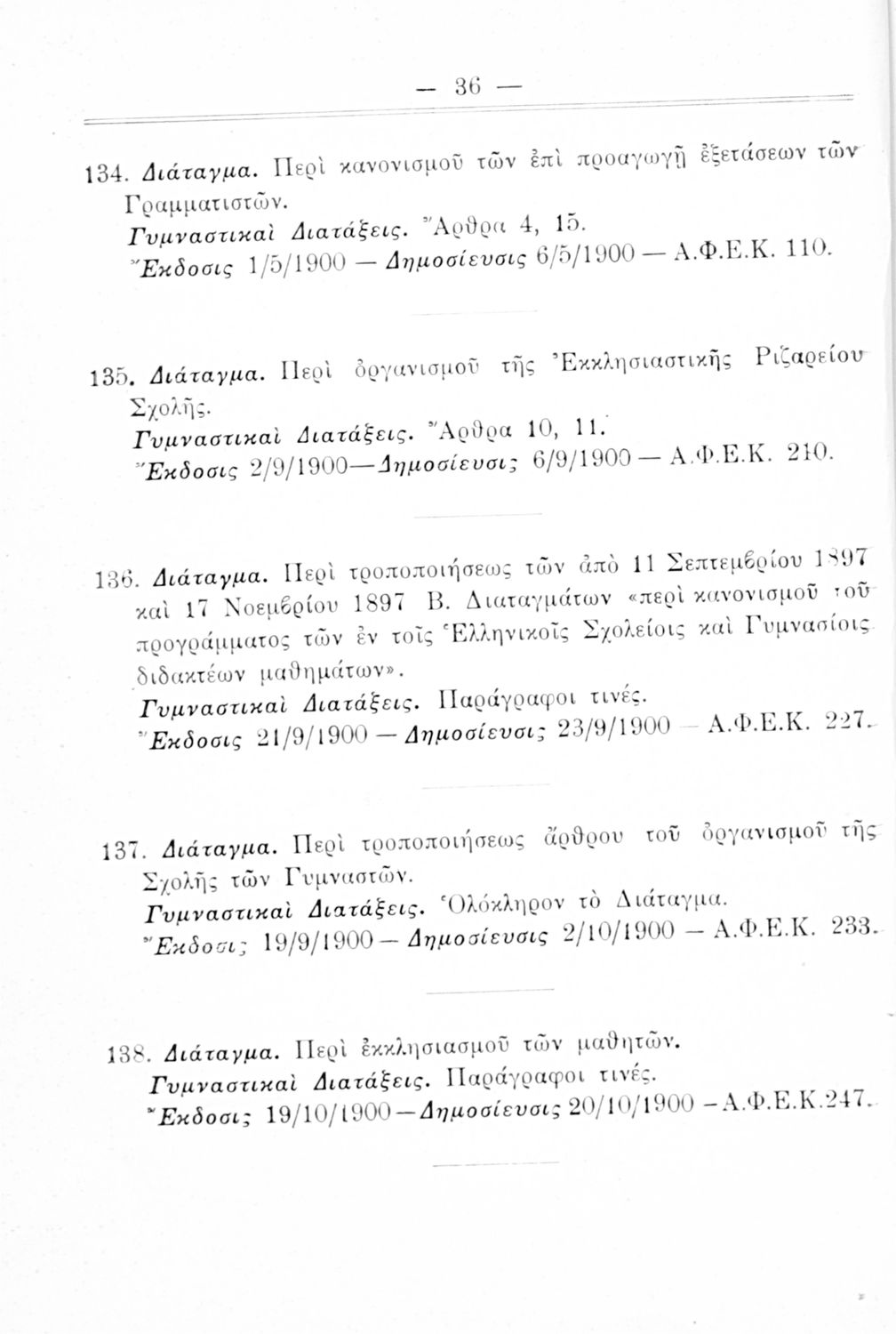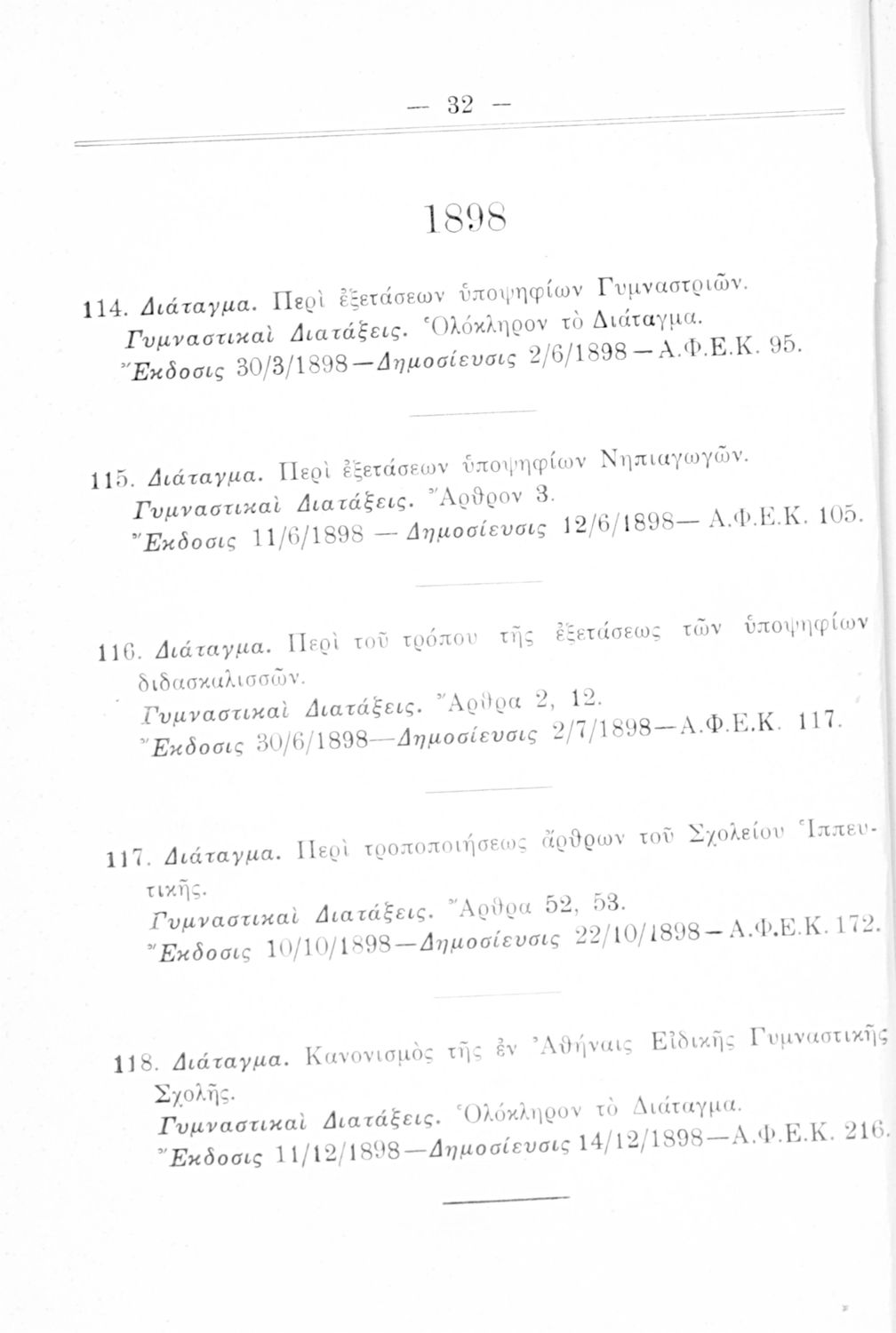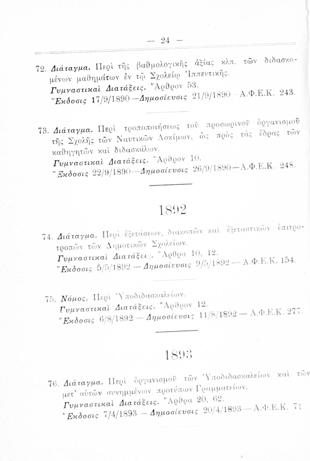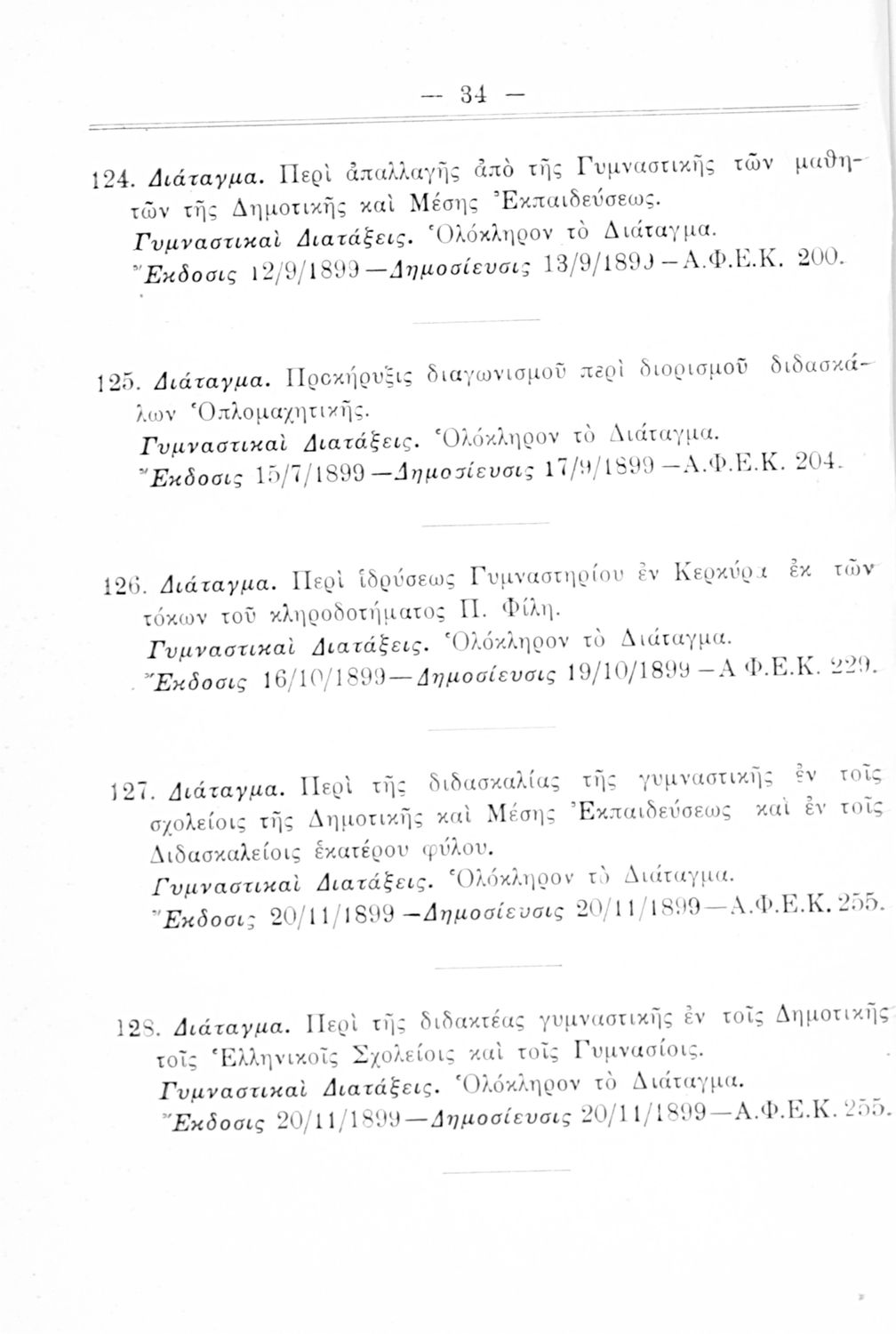 Καταγραφή νόμων, διαταγμάτων και γυμναστικών διατάξεων που αφορούν την περίοδο 1834-1933.
