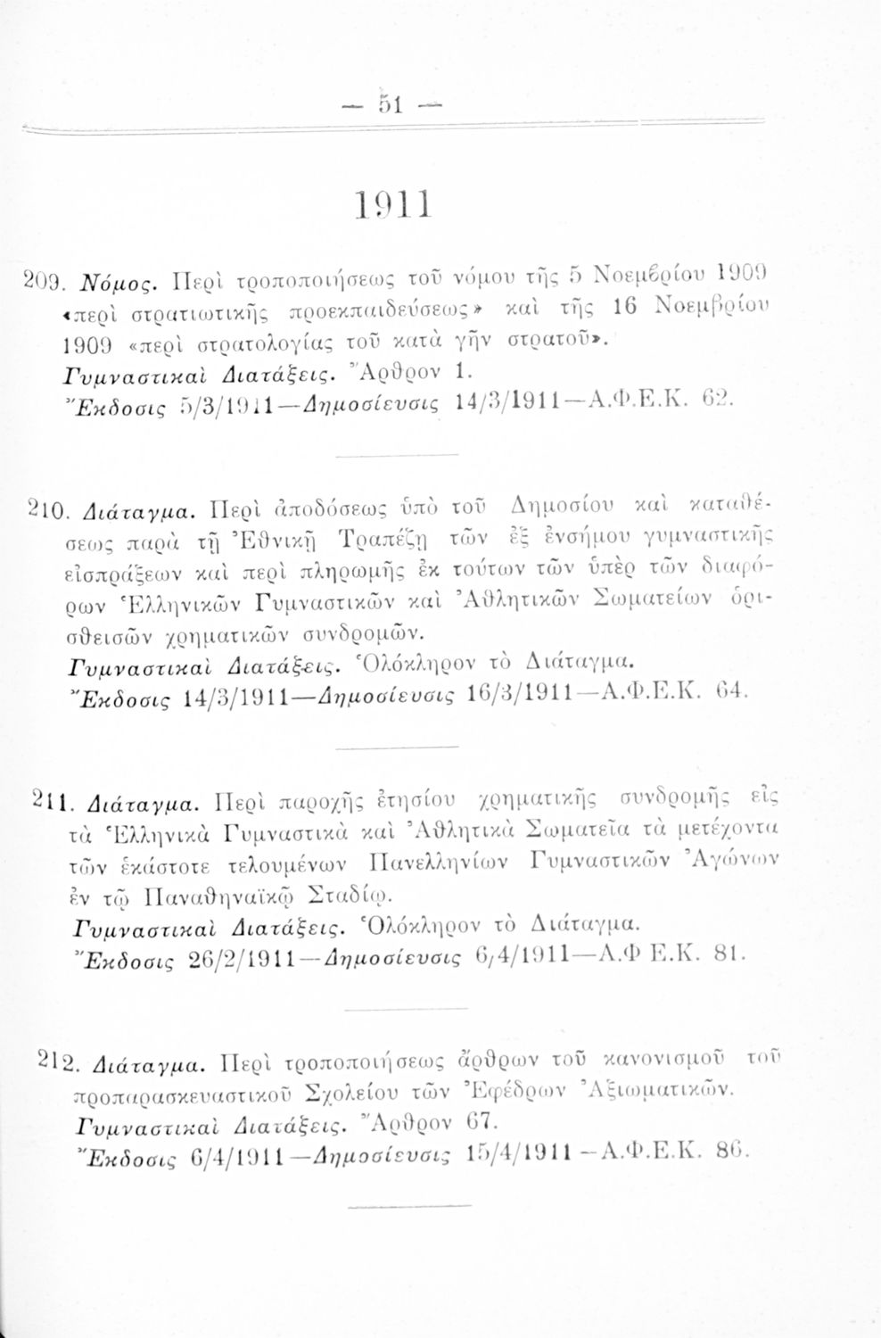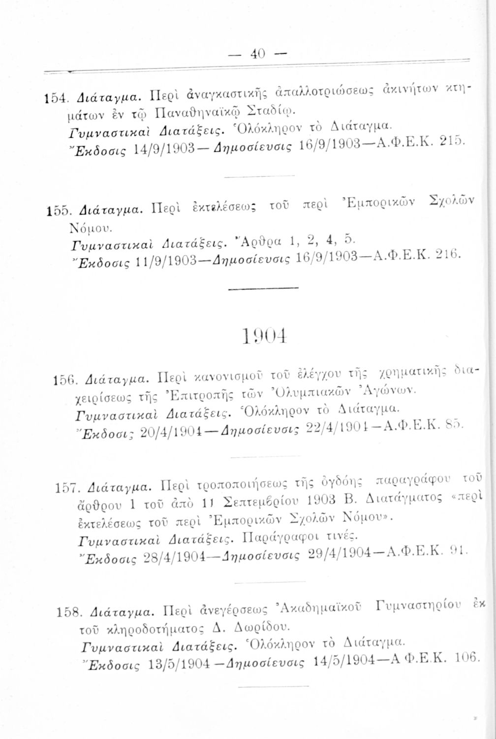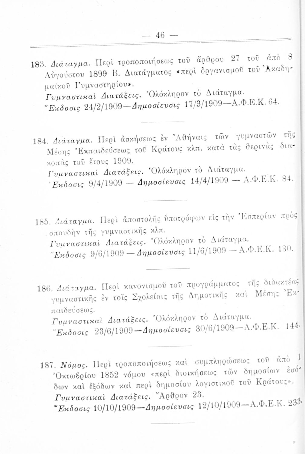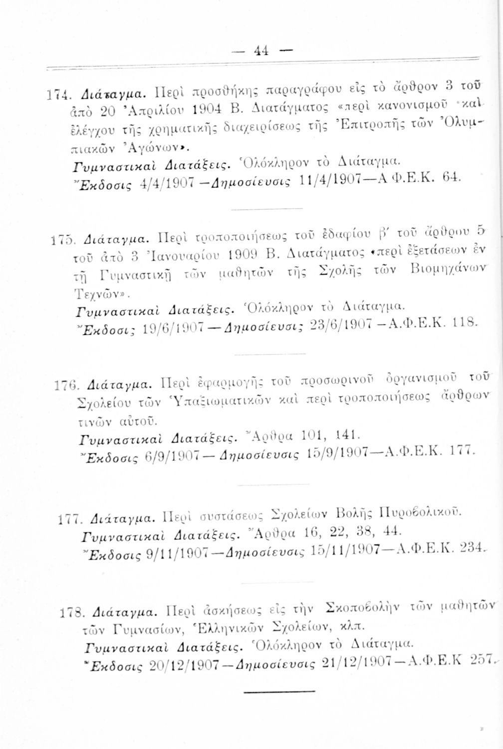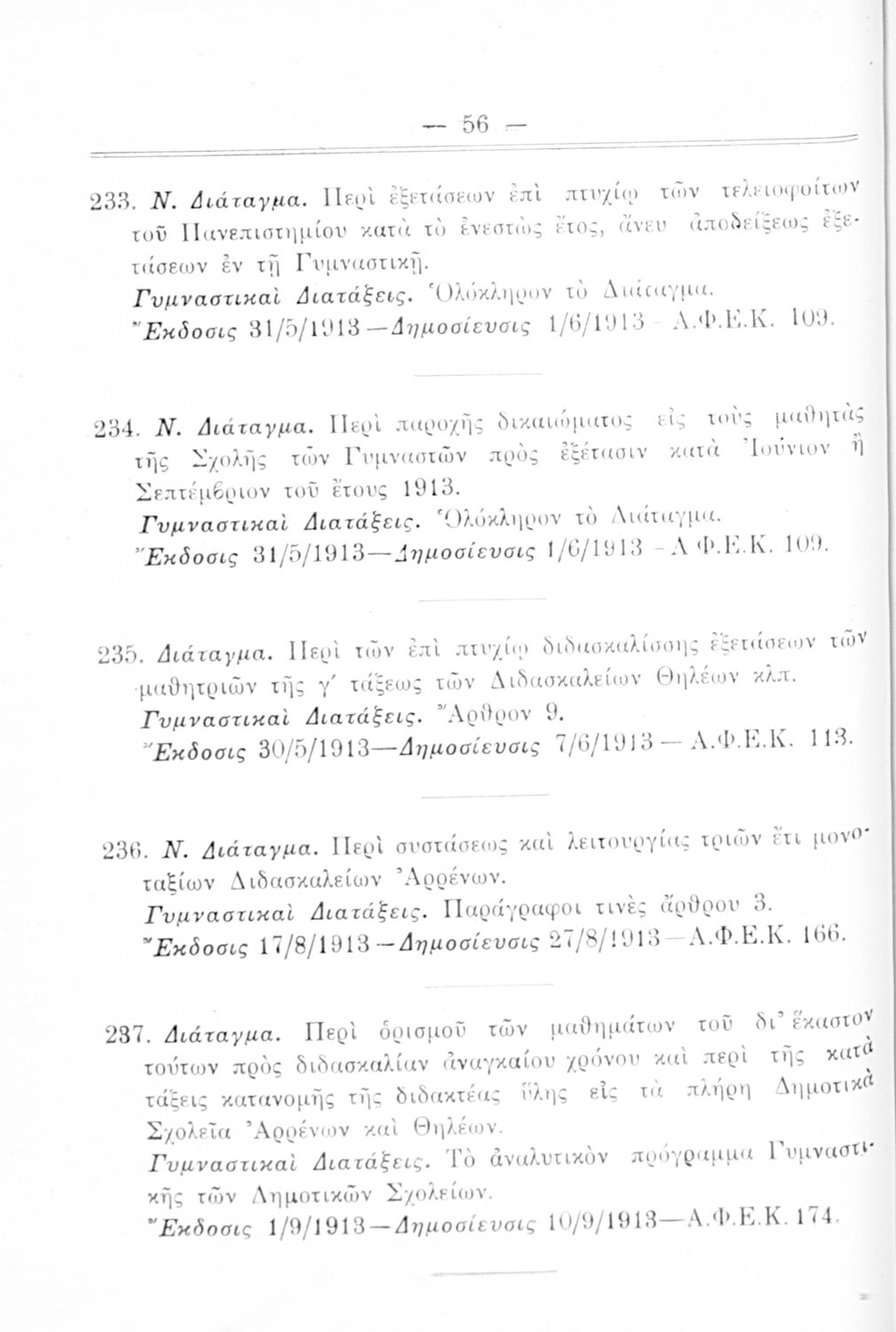Παρουσίαση περιεχομένου: Καταγραφή νόμων, διαταγμάτων και γυμναστικών διατάξεων που αφορούν την περίοδο 1834-1933.