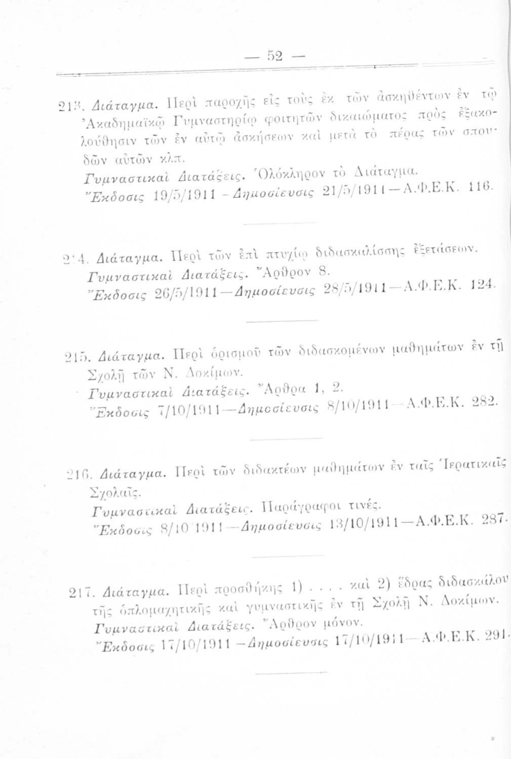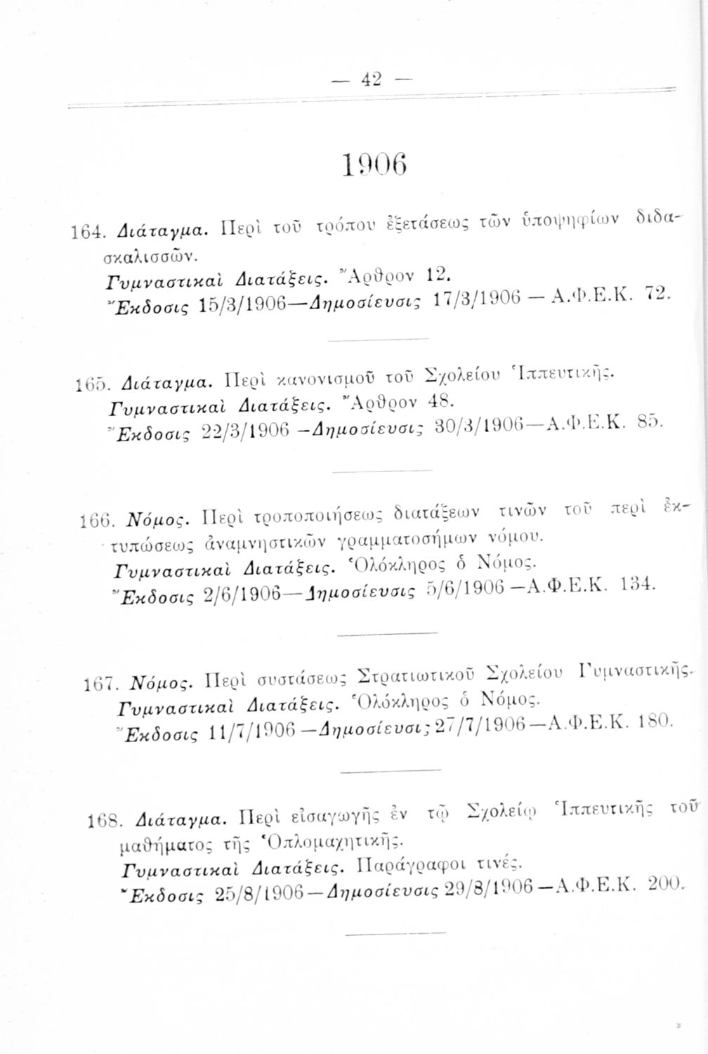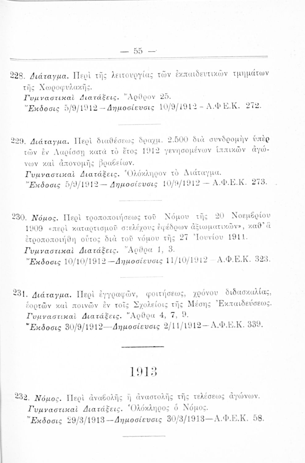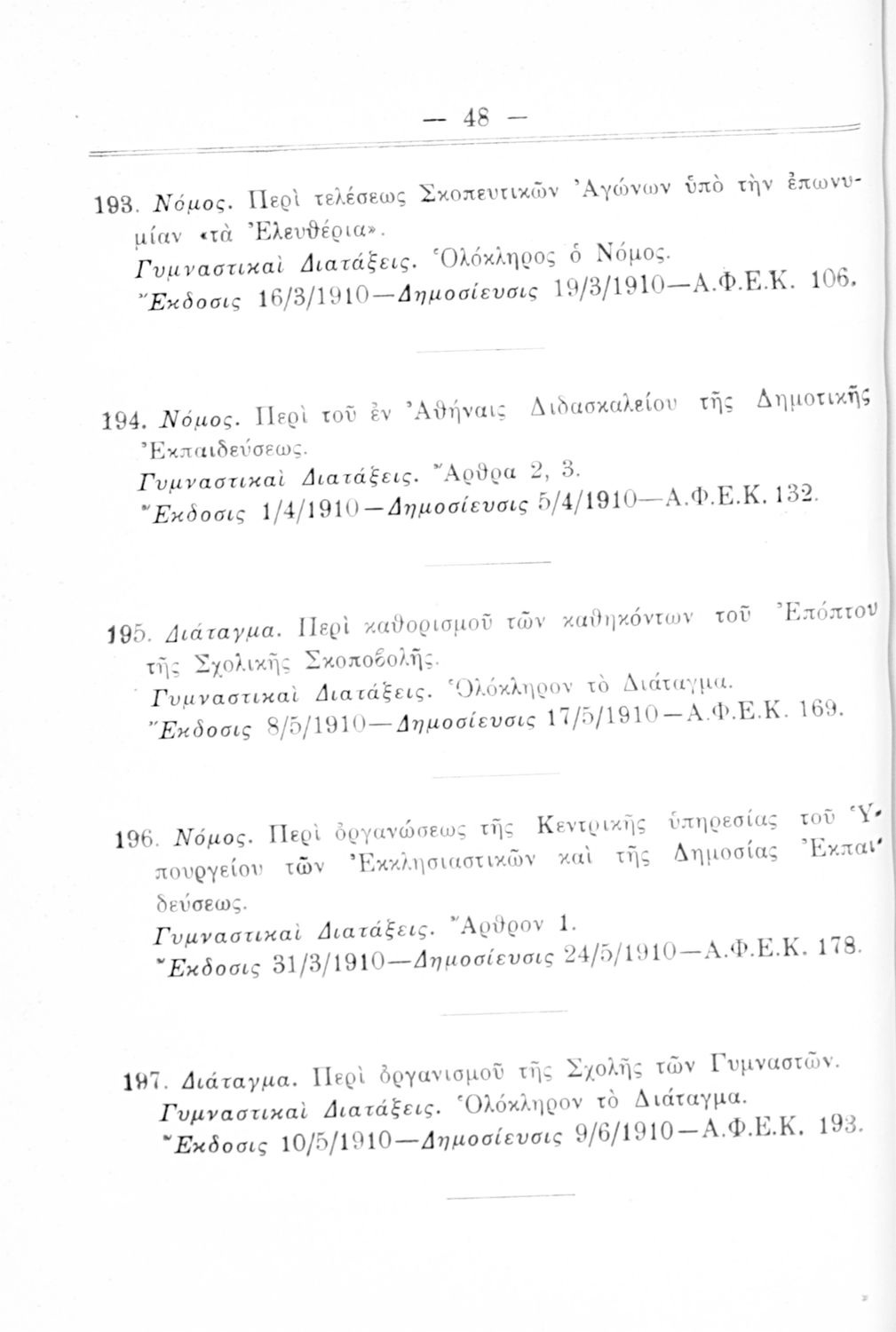 Παρουσίαση περιεχομένου: Καταγραφή νόμων, διαταγμάτων και γυμναστικών διατάξεων που αφορούν την περίοδο 1834-1933.