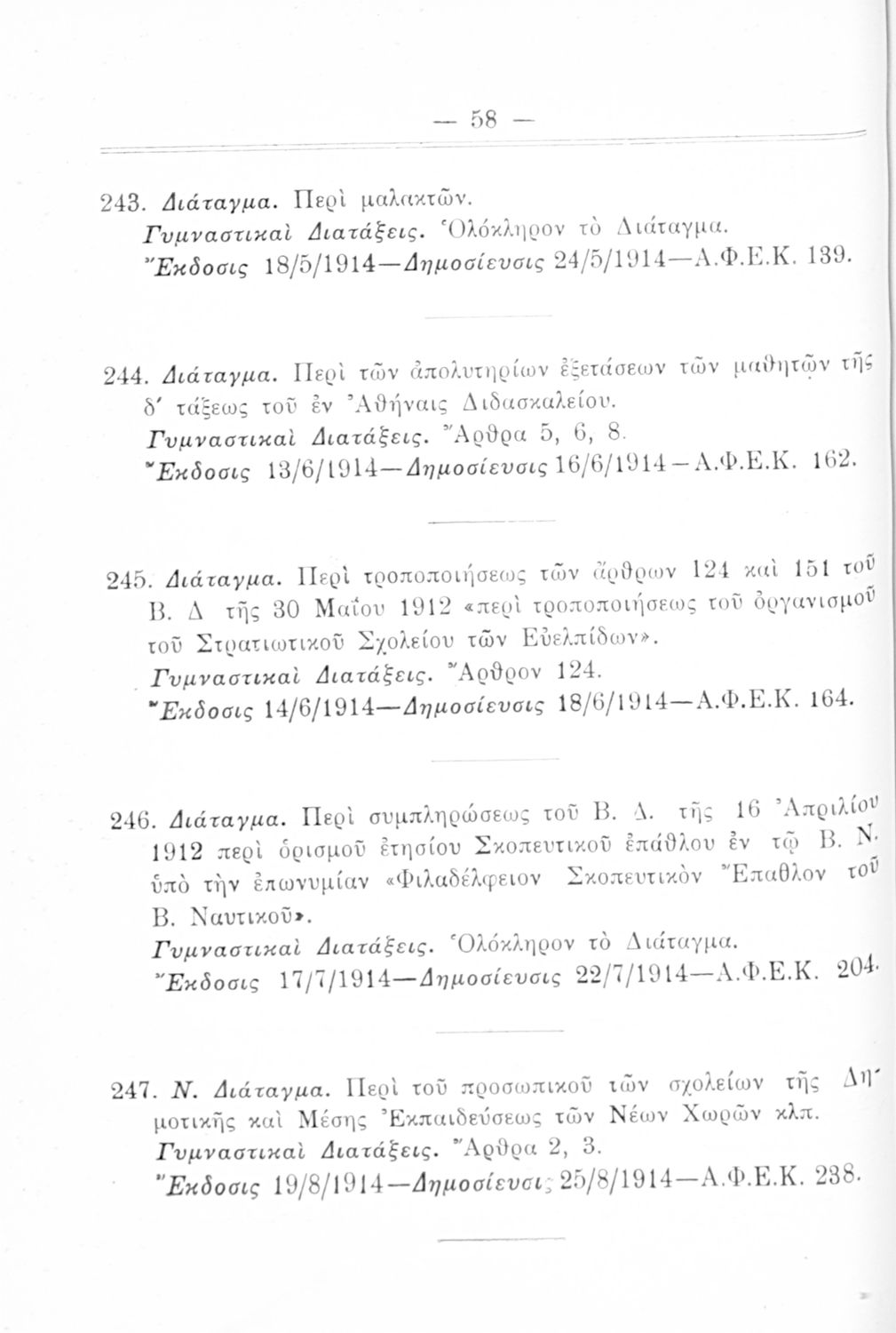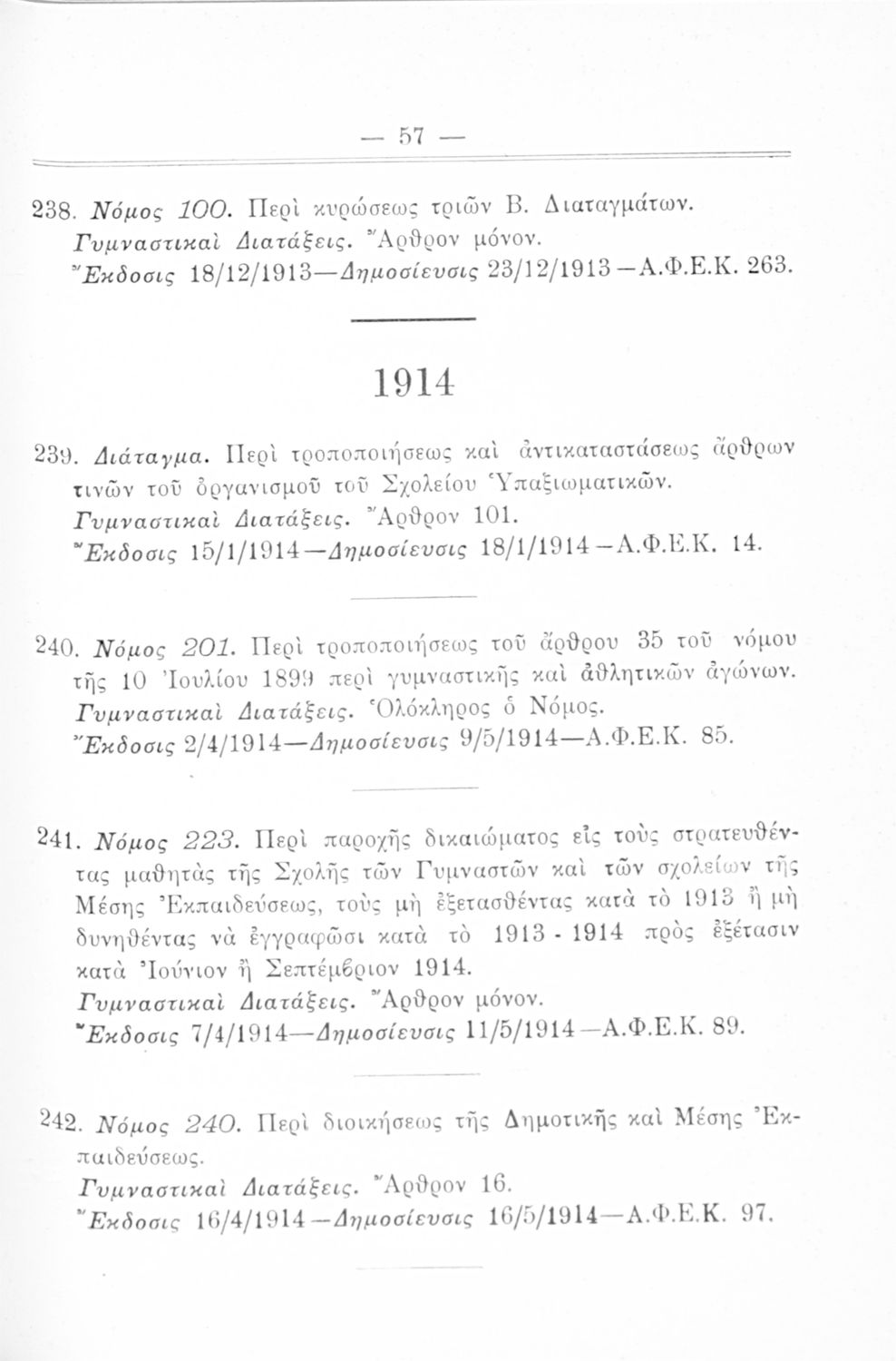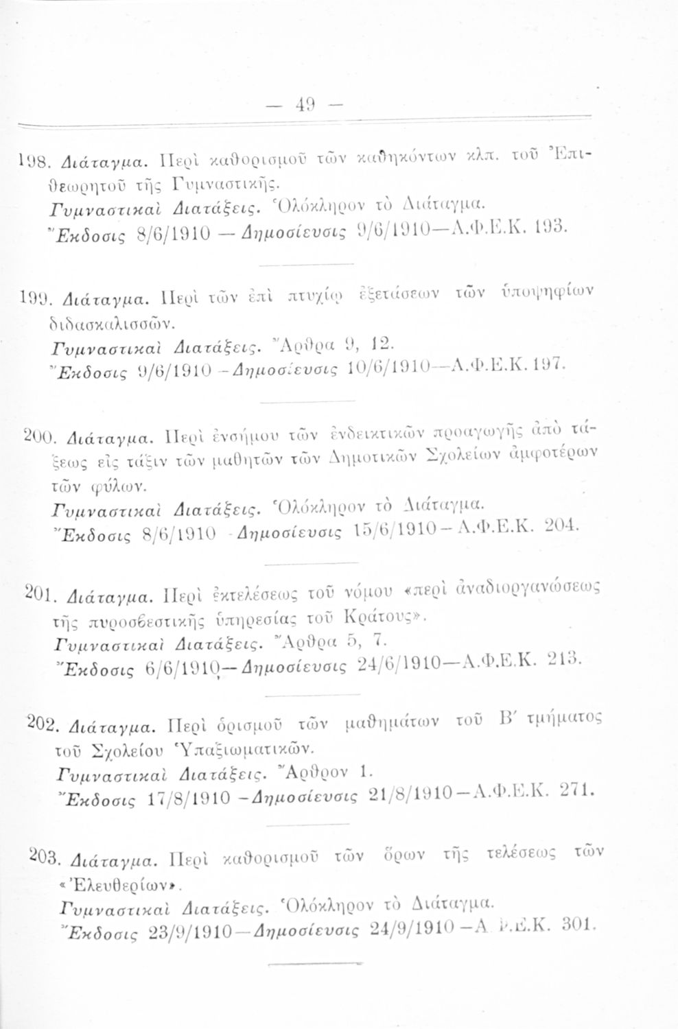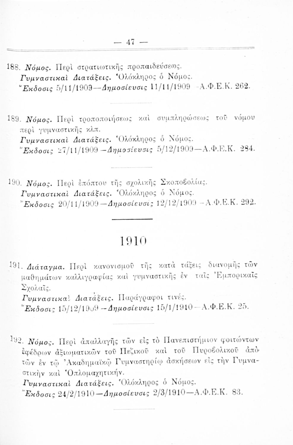 Καταγραφή νόμων, διαταγμάτων και γυμναστικών διατάξεων που αφορούν την περίοδο 1834-1933.