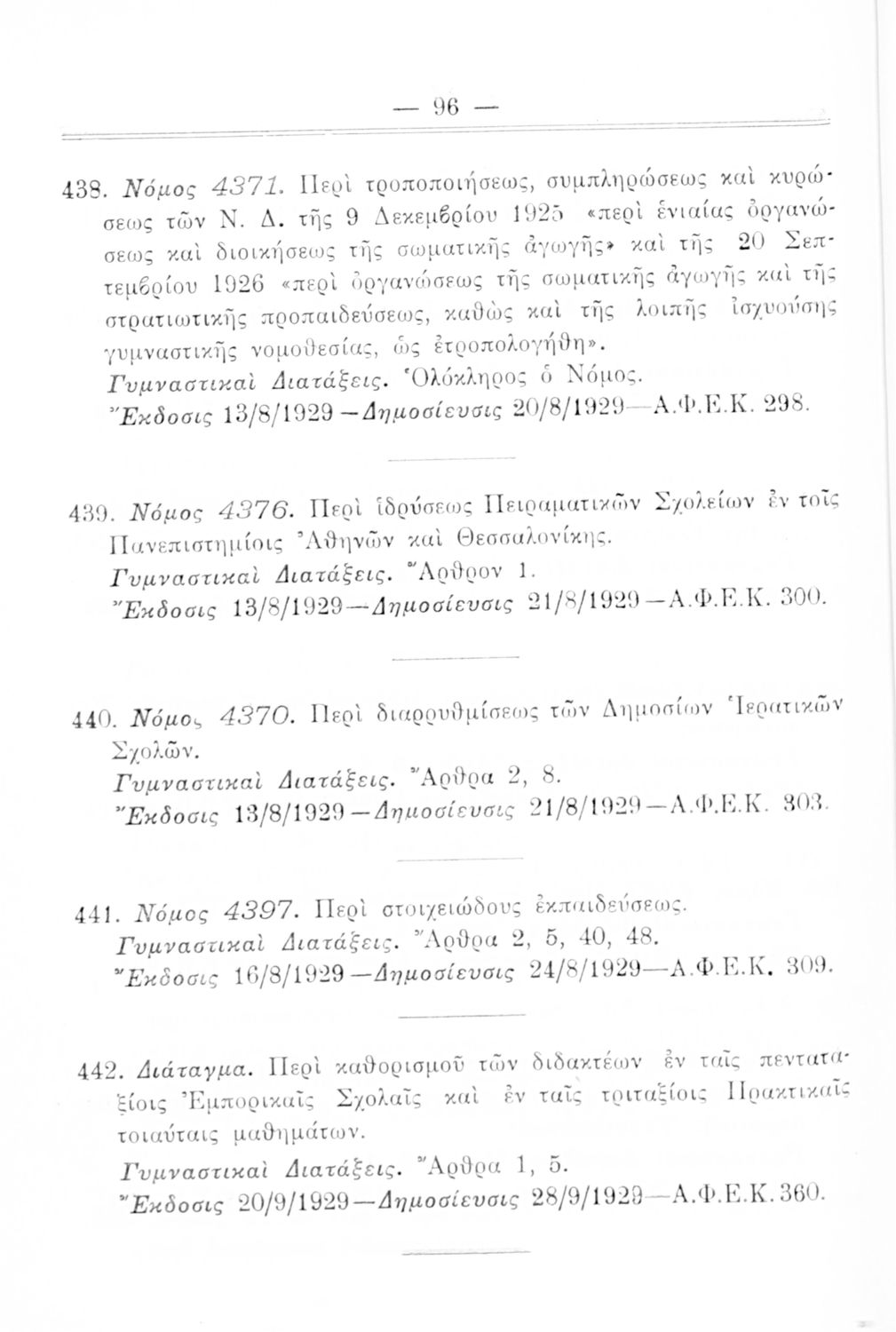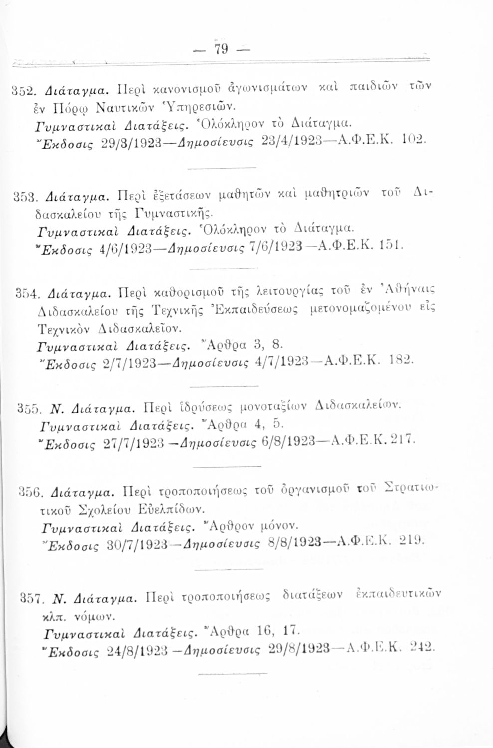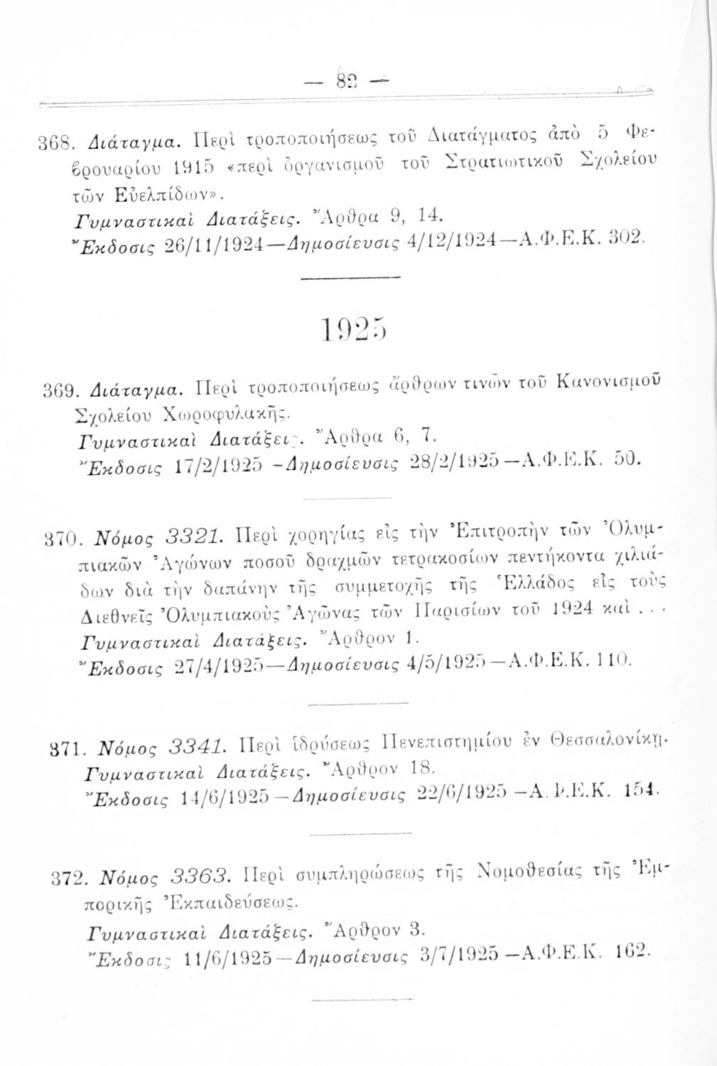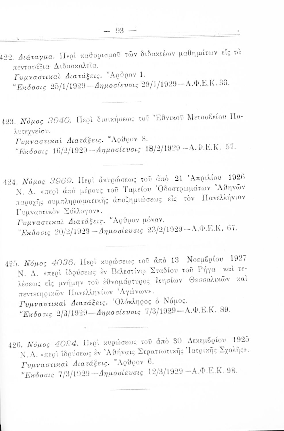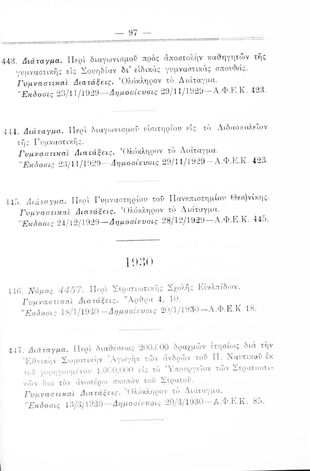 Παρουσίαση περιεχομένου: Καταγραφή νόμων, διαταγμάτων και γυμναστικών διατάξεων που αφορούν την περίοδο 1834-1933.