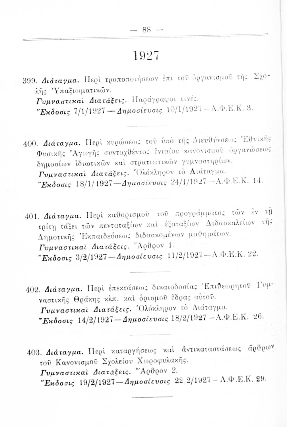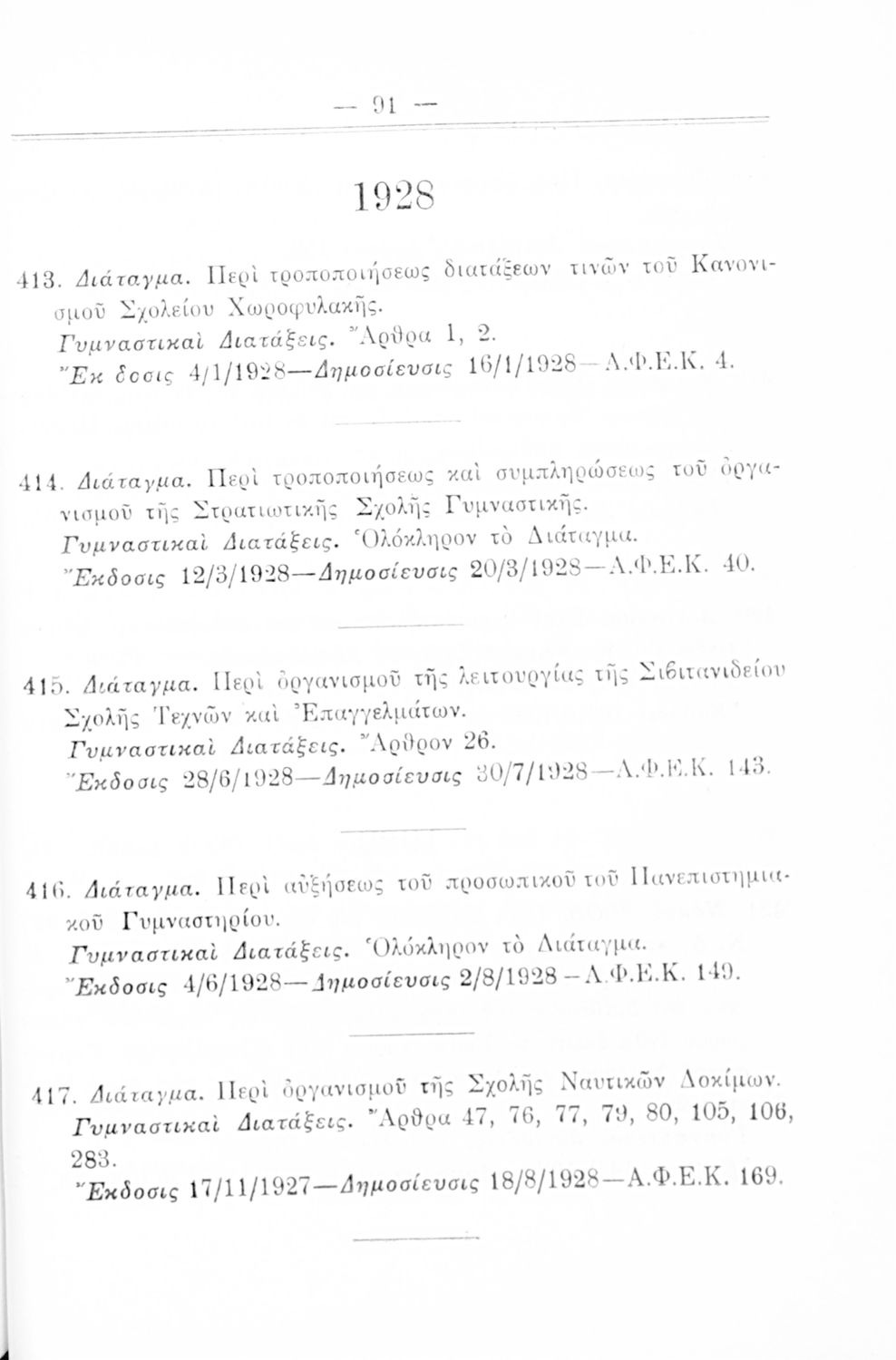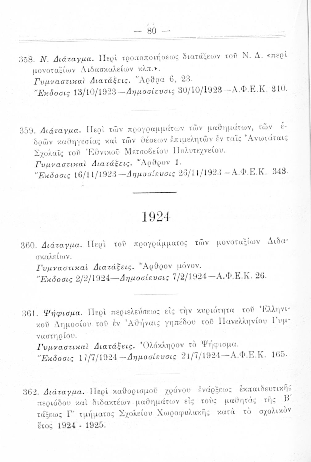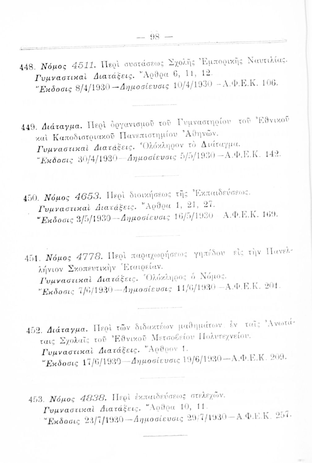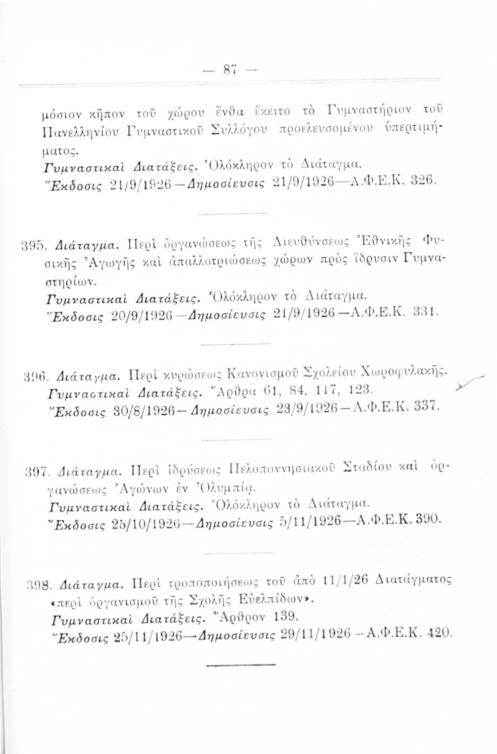 Παρουσίαση περιεχομένου: Καταγραφή νόμων, διαταγμάτων και γυμναστικών διατάξεων που αφορούν την περίοδο 1834-1933.