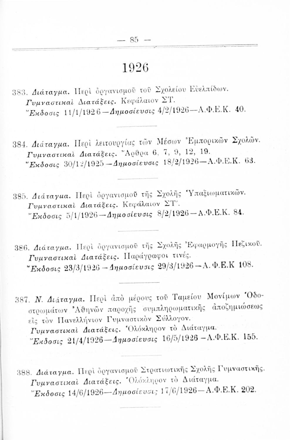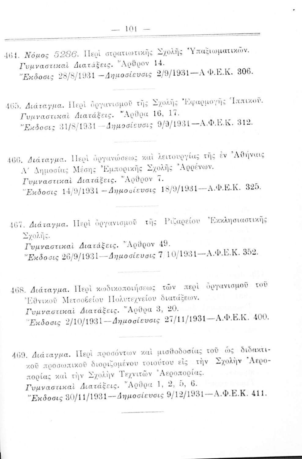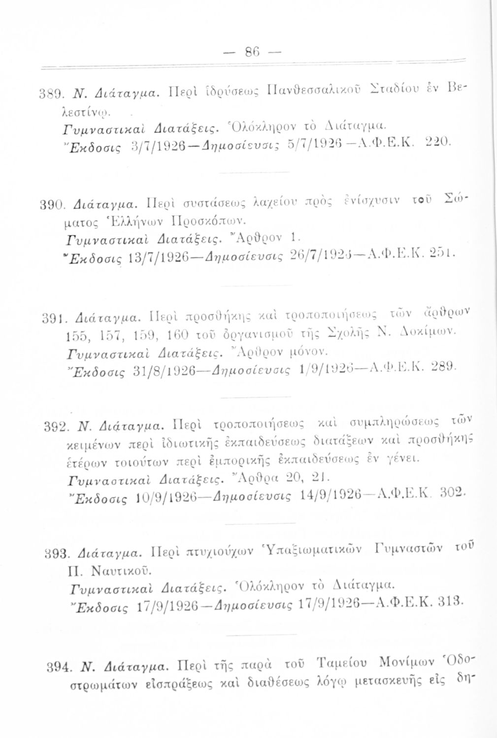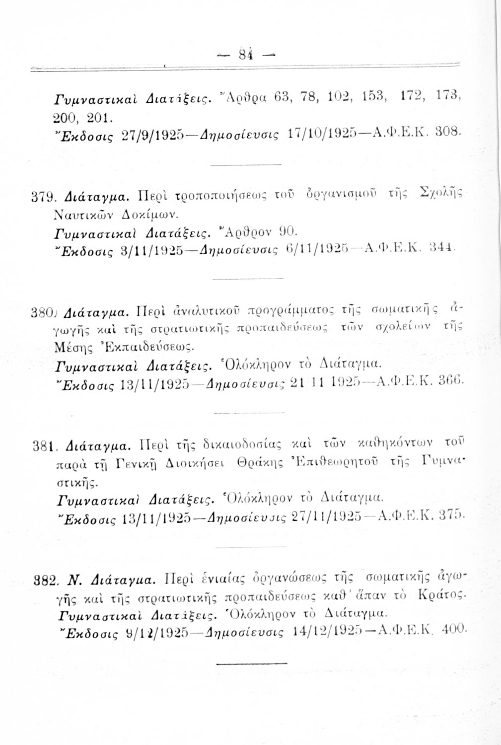 Καταγραφή νόμων, διαταγμάτων και γυμναστικών διατάξεων που αφορούν την περίοδο 1834-1933.