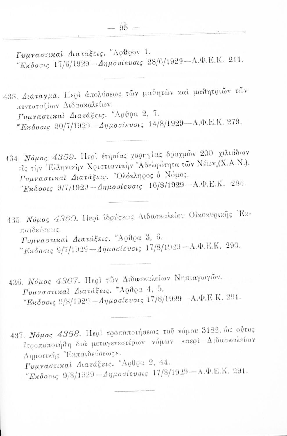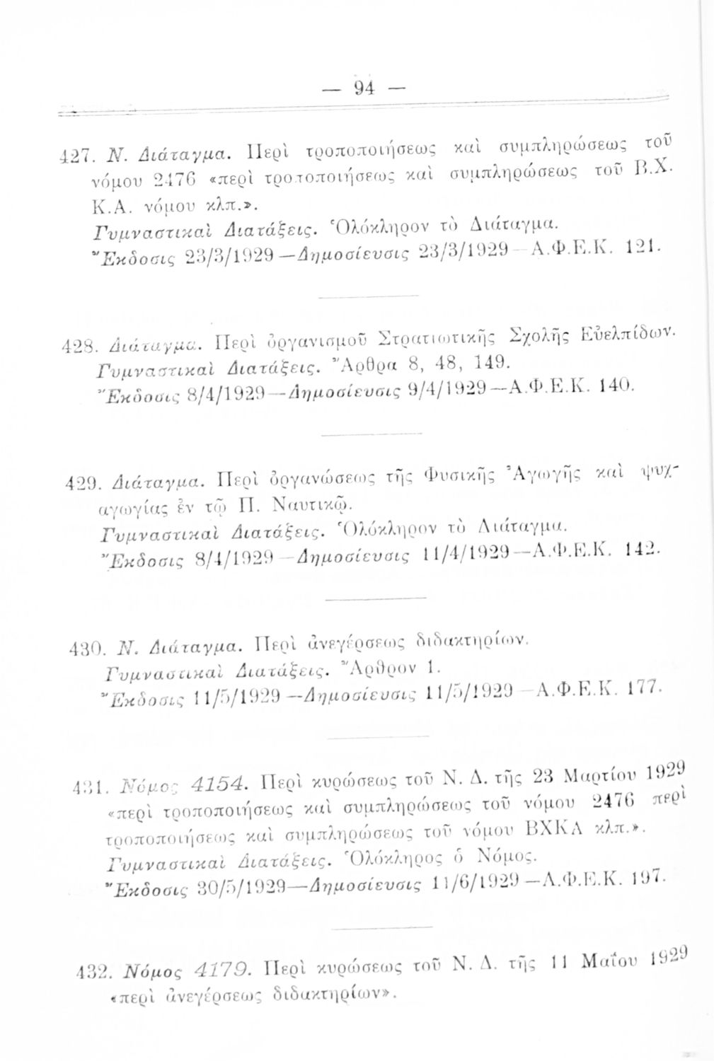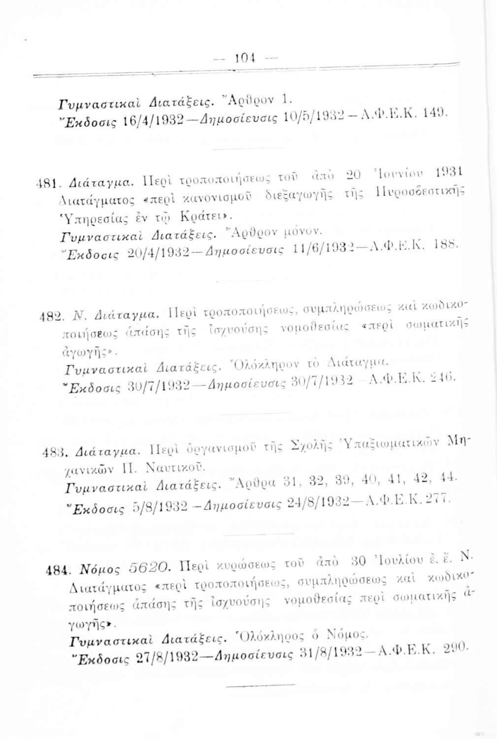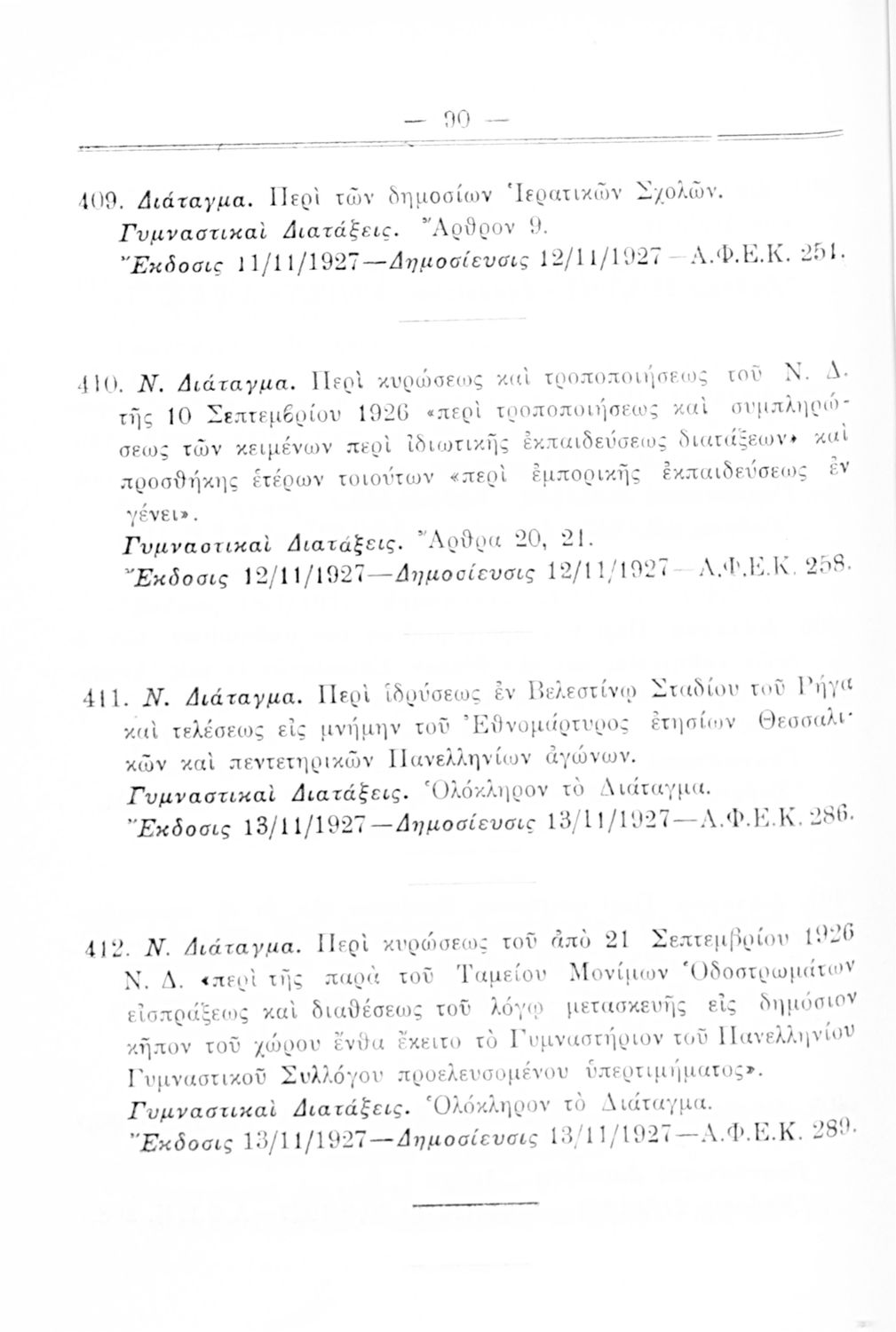 Καταγραφή νόμων, διαταγμάτων και γυμναστικών διατάξεων που αφορούν την περίοδο 1834-1933.