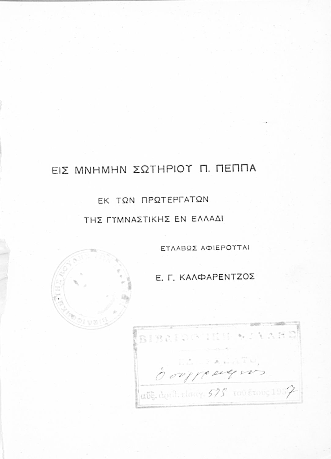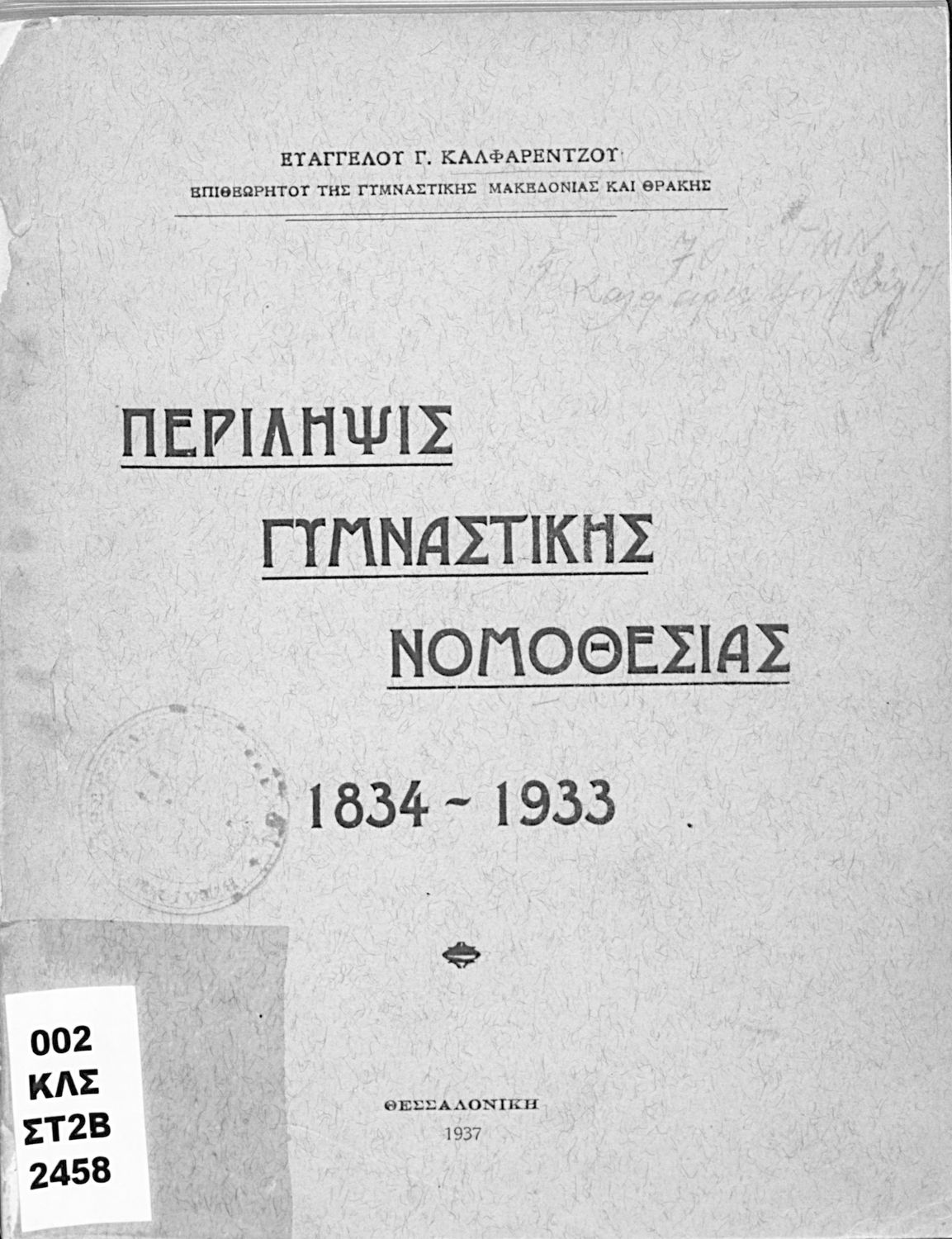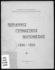 Κωδικός αναγνώρισης: 03-20632578 Τίτλος: Περίληψις γυμναστικής νομοθεσίας 1834-1933 Συγγραφέας: Ευάγγελος Δ. Καλφαρέντζος Μέγεθος και υπόστρωμα: Αναλυτικό πρόγραμμα, 119 σελίδες. |