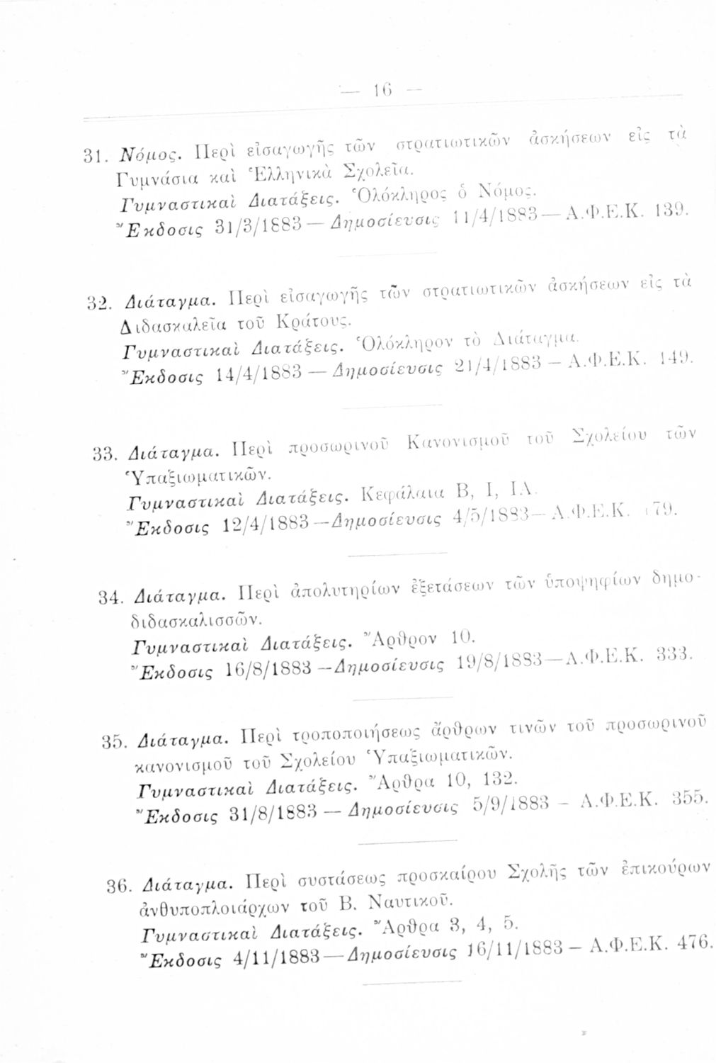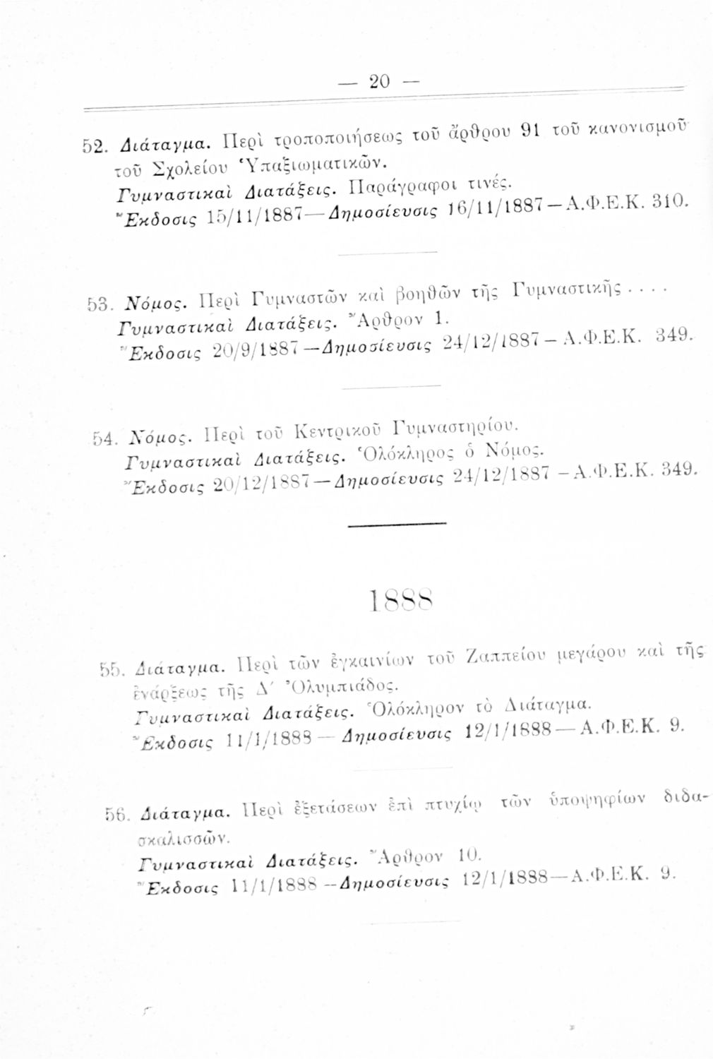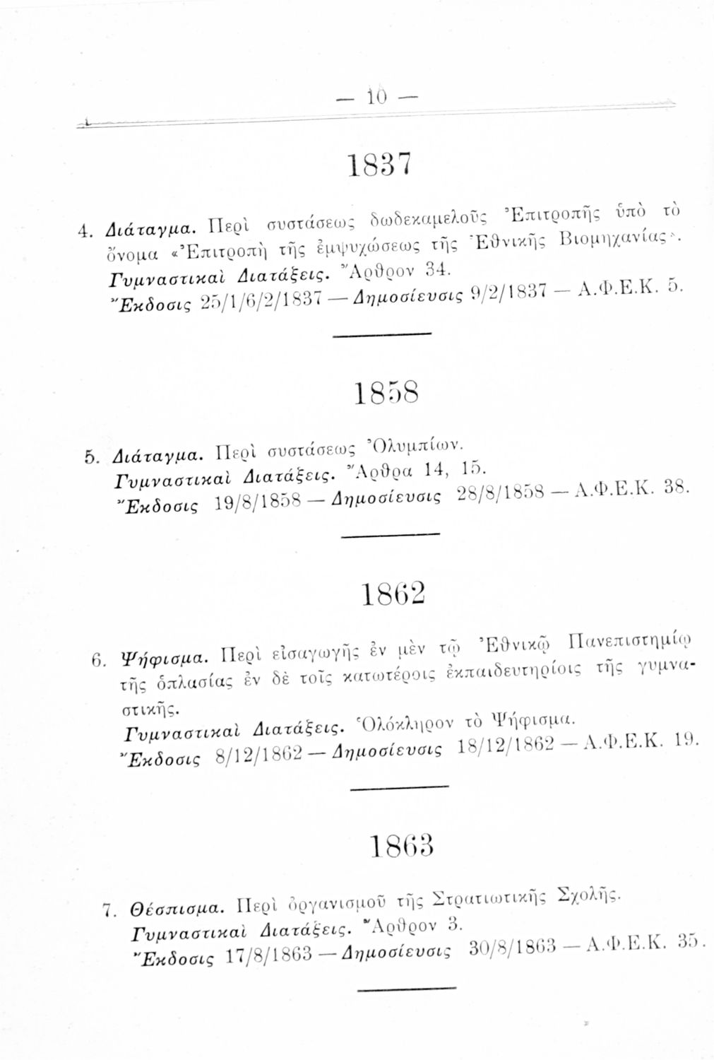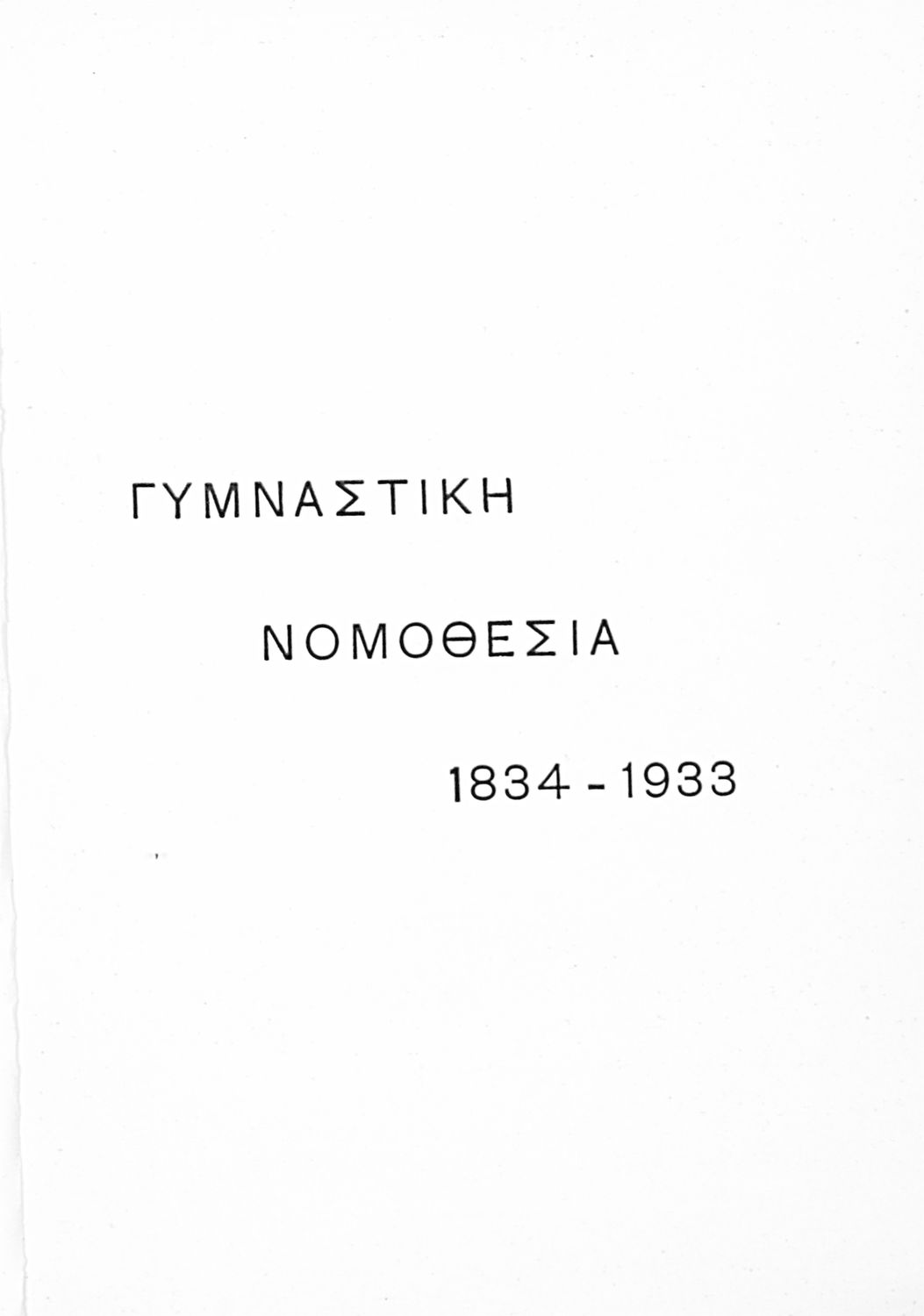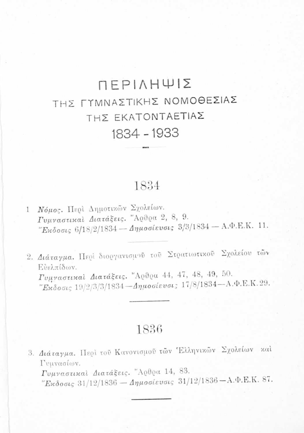 Καταγραφή νόμων, διαταγμάτων και γυμναστικών διατάξεων που αφορούν την περίοδο 1834-1933.