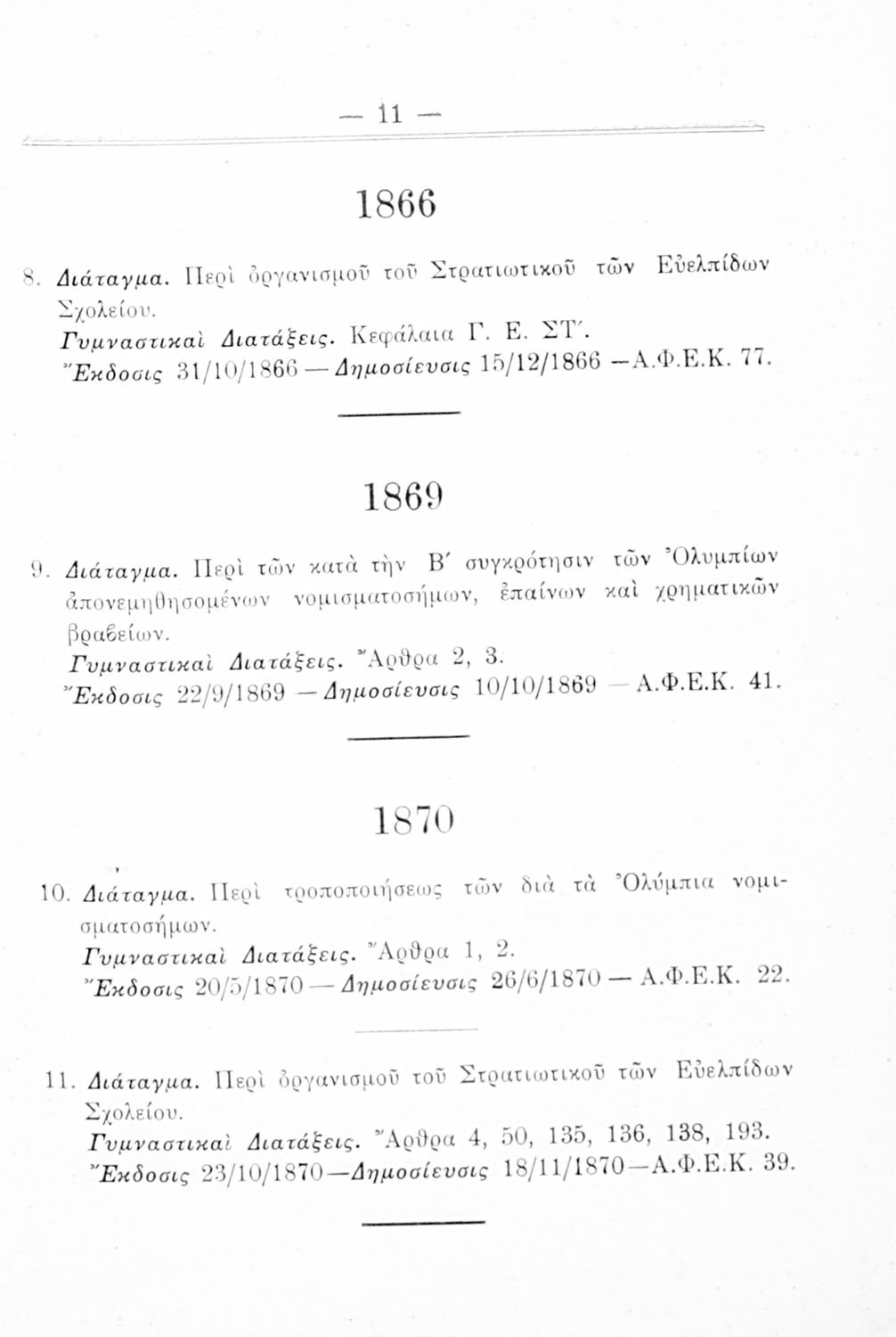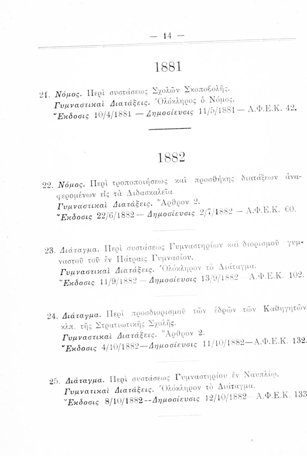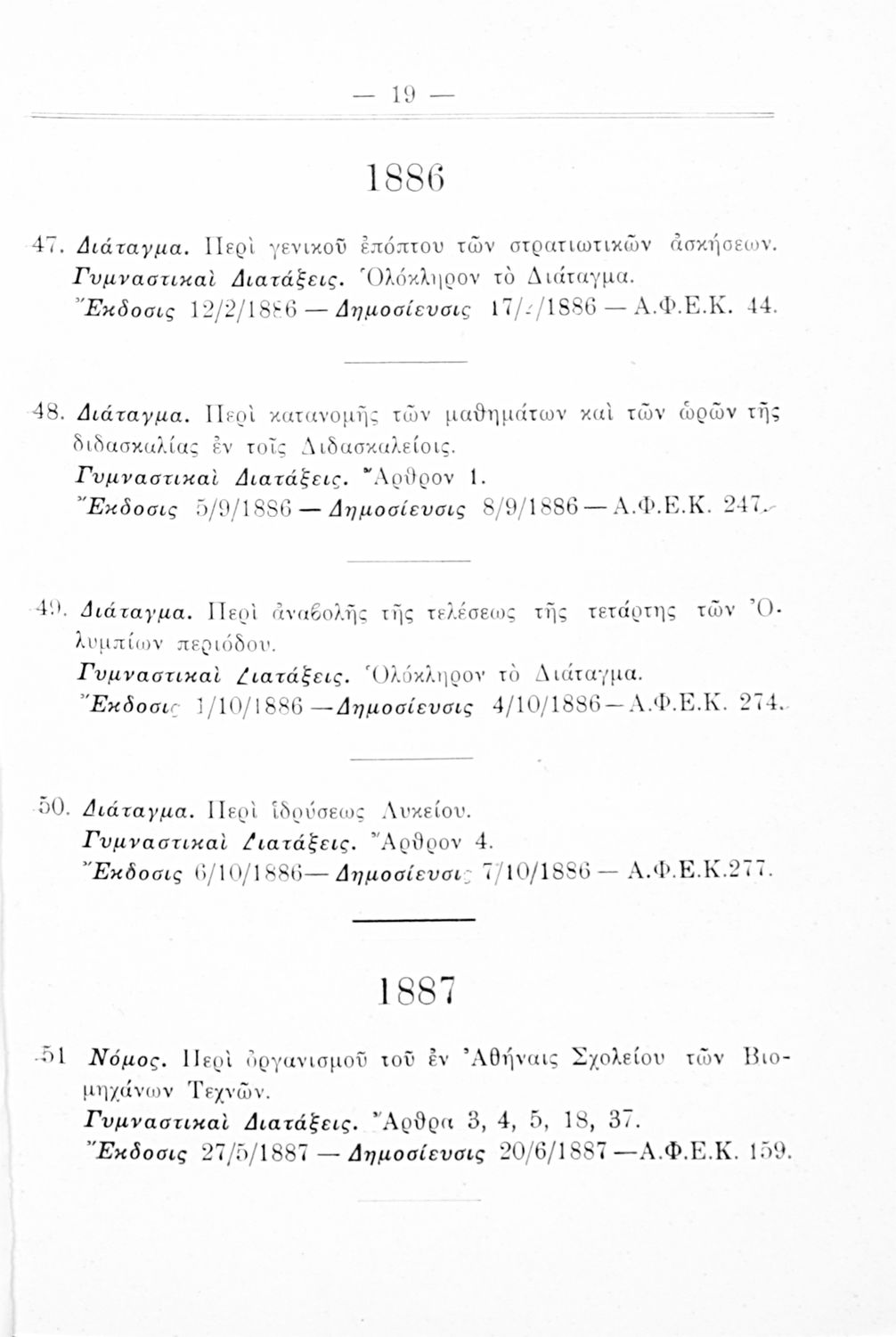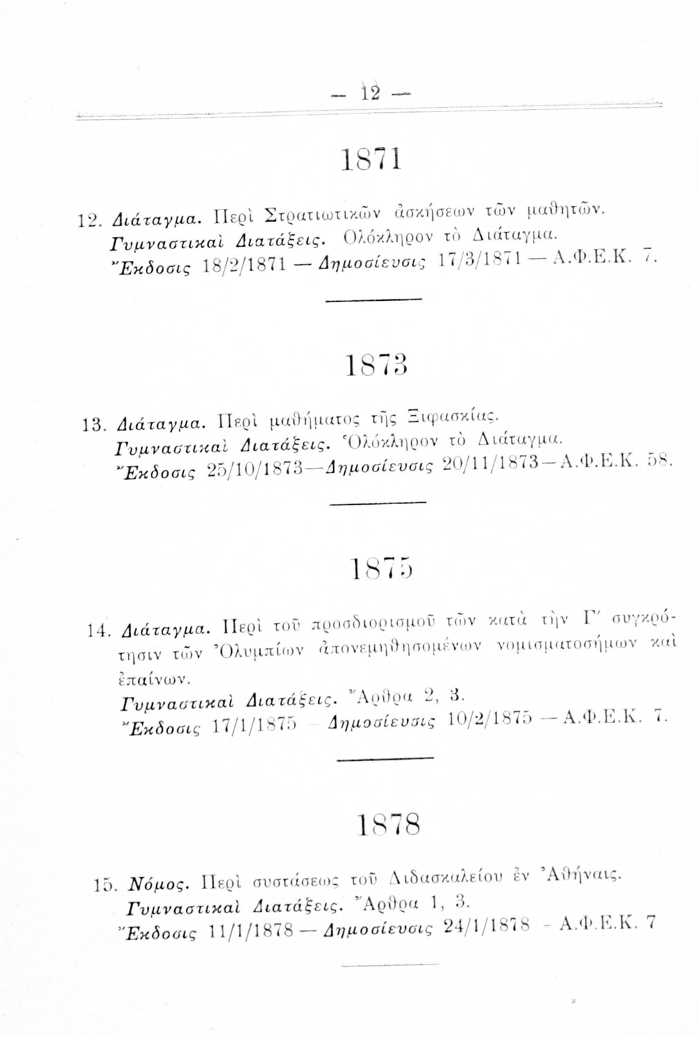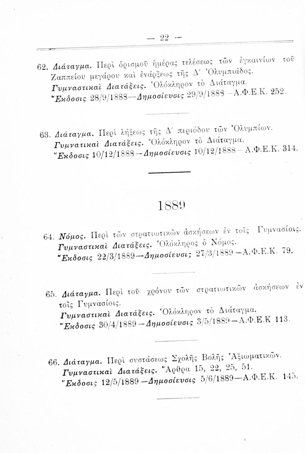 Καταγραφή νόμων, διαταγμάτων και γυμναστικών διατάξεων που αφορούν την περίοδο 1834-1933.
