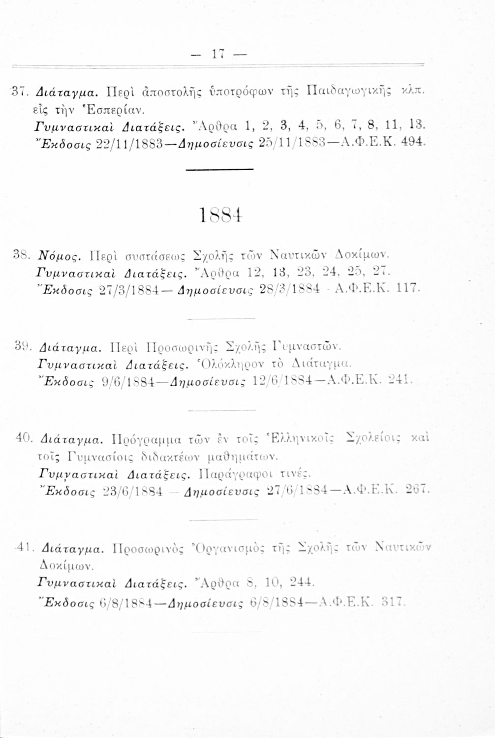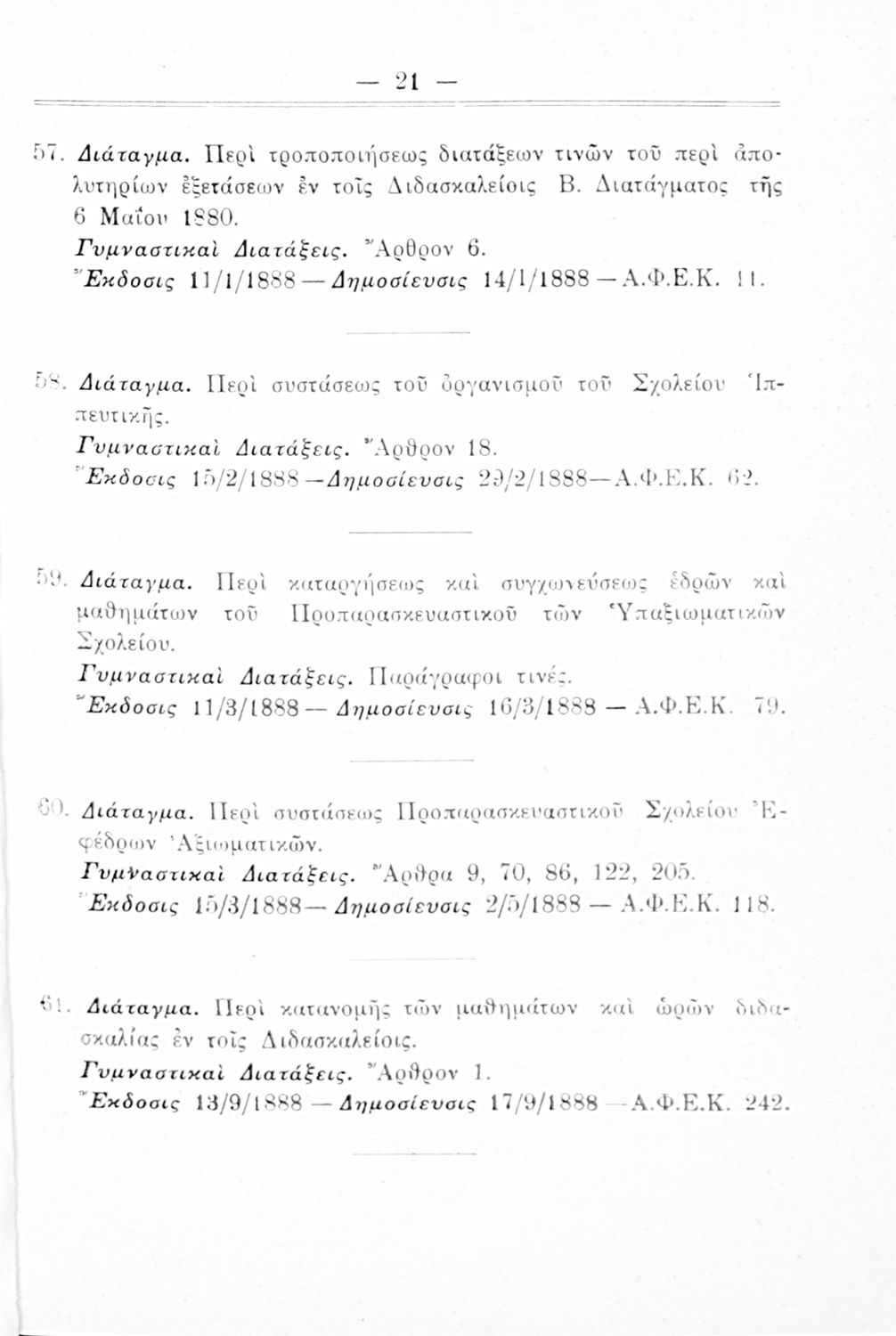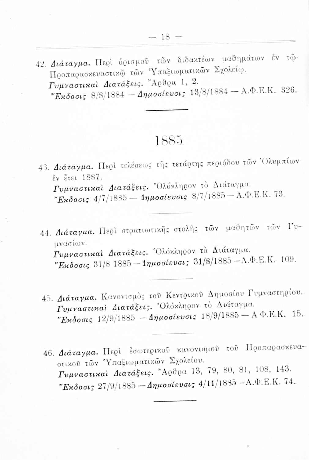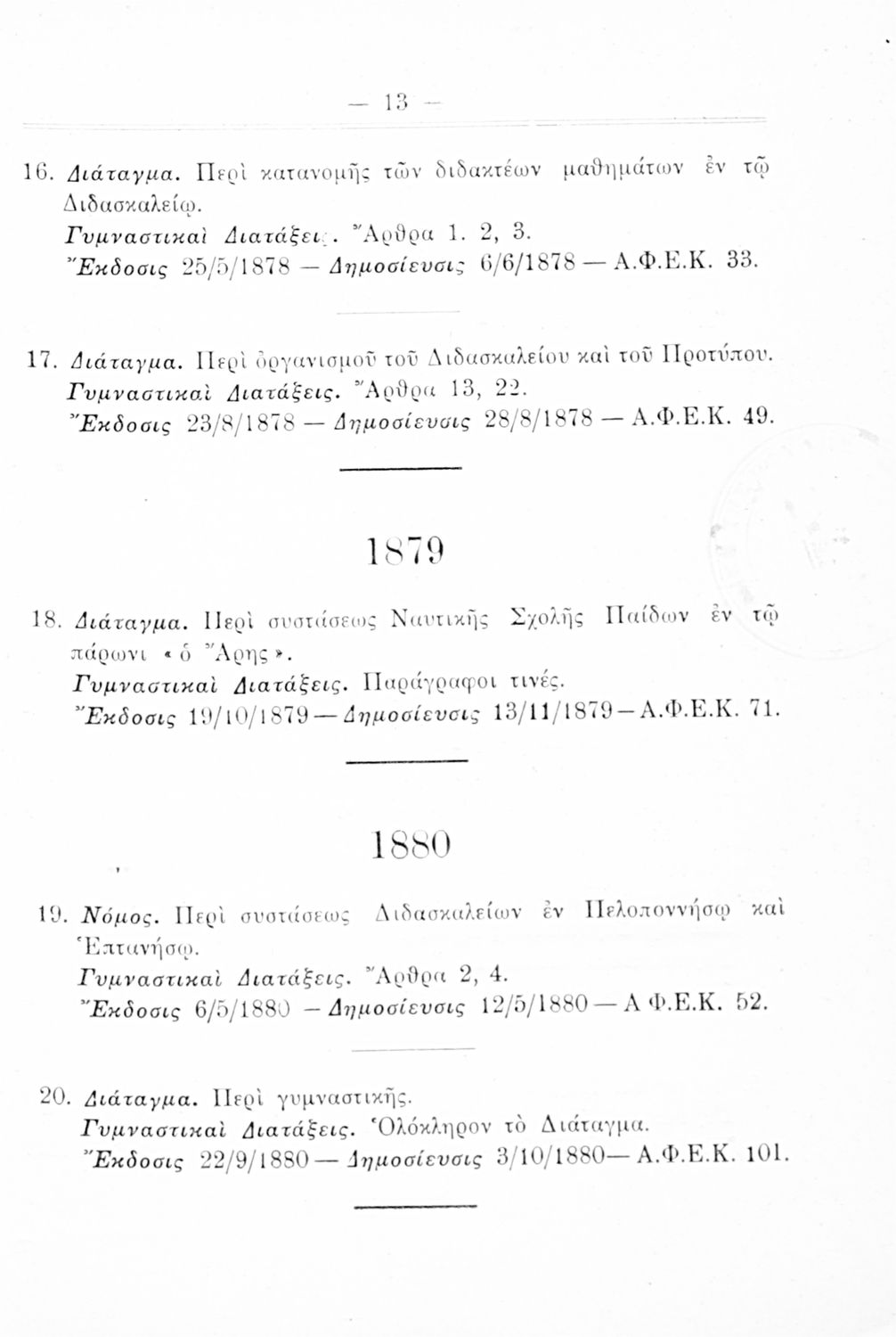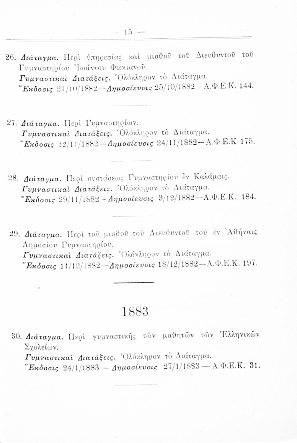 Καταγραφή νόμων, διαταγμάτων και γυμναστικών διατάξεων που αφορούν την περίοδο 1834-1933.