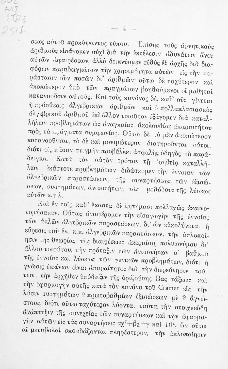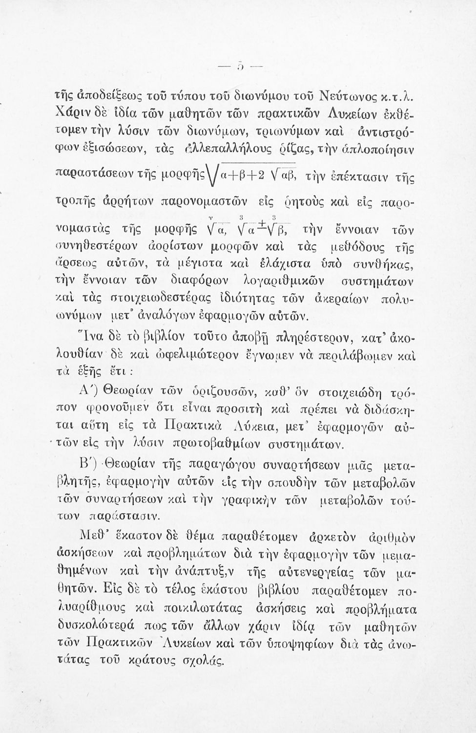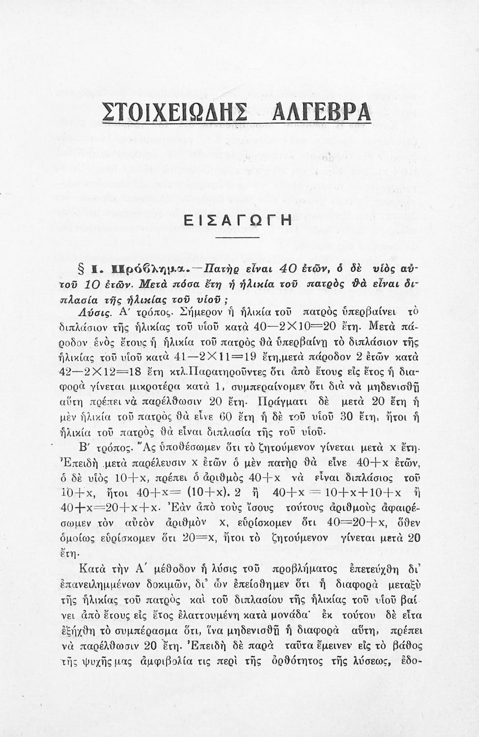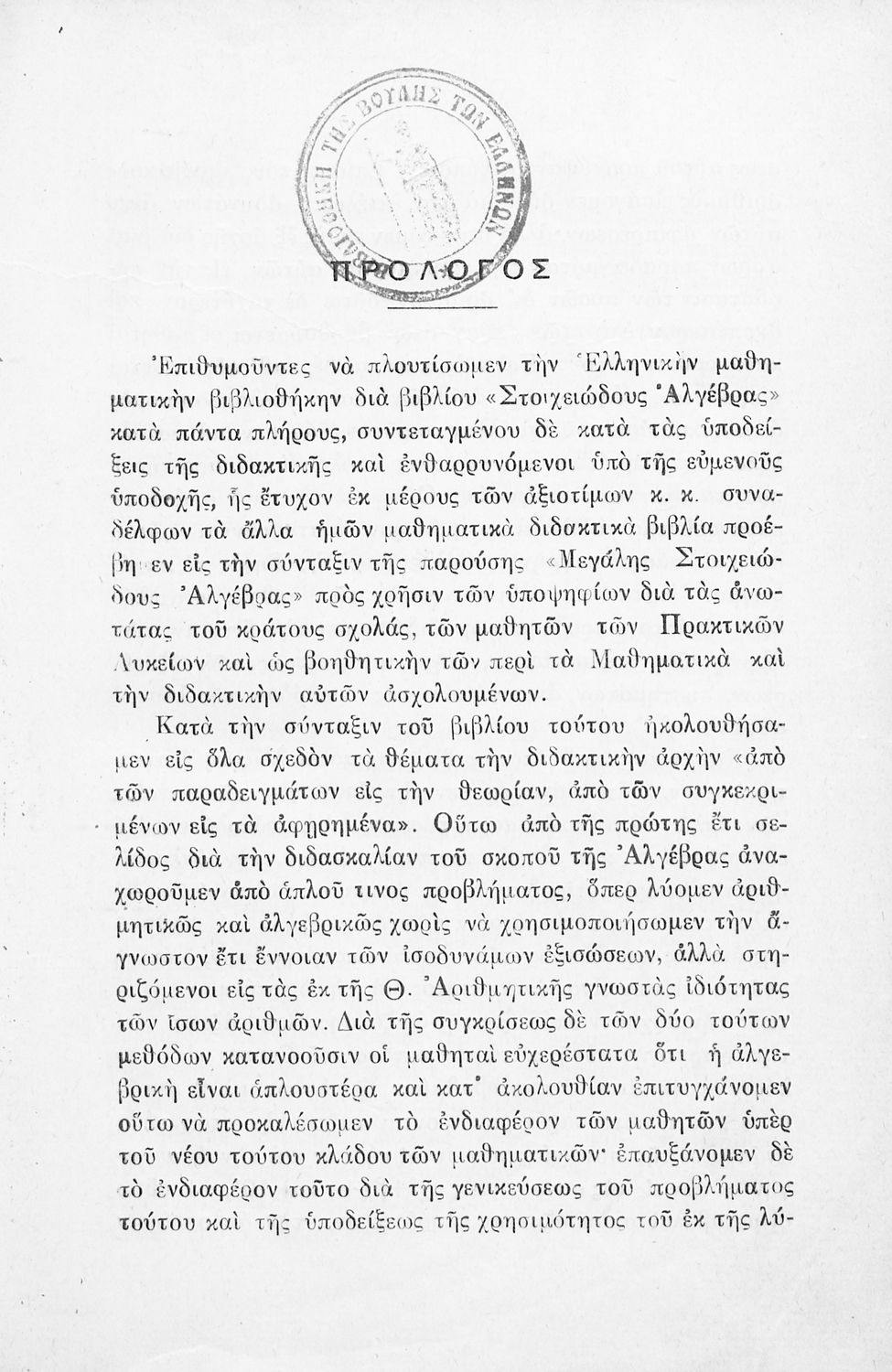 LDR 01530 2200193 4500 035 ## _a03-20632631 040 ## _aΒιβλιοθήκη της Βουλής των Ελλήνων 041 ## _ael 100 ## _aΝικόλαος Δ. Νικολάου 110 ## _a20632631 245 0# _aΜεγάλη Στοιχειώδης Άλγεβρα προς χρήσιν των μαθητών των πρακτικών Λυκείων, Γυμνασίων και των υποψηφίων δια τας Ανωτάτας Σχολάς του Κράτους 250 ## _a1η Έκδοση 260 ## _aΑθήνα _bΔημ. Ν. Τζάκας, Στεφ. Δελαγραμμάτικας και ΣΙΑ _c1932 300 ## _a346 520 ## _aΜαθητικό βοήθημα Μαθηματικών για τους μαθητές των Πρακτικών Λυκείων και τους υποψηφίους Ανωτάτων Σχολών του κράτους. Το βιβλίο περιέχει βασικές έννοιες και κανόνες της άλγεβρας και την ανάπτυξη αριθμητικών προόδων και εξισώσεων. Κάθε θεματική ενότητα συνοδεύεται από ασκήσεις για πρακτική εξάσκηση. 522 ## _aΕλλάδα 546 ## _aΚαθαρεύουσα 563 ## _aΣκληρό Εξώφυλλο 650 #4 _aΆλγεβρα _aΕξισώσεις _aΛογάριθμοι _aΠολυώνυμα _aΠράξεις αλγεβρικών αριθμών _aΣυναρτήσεις