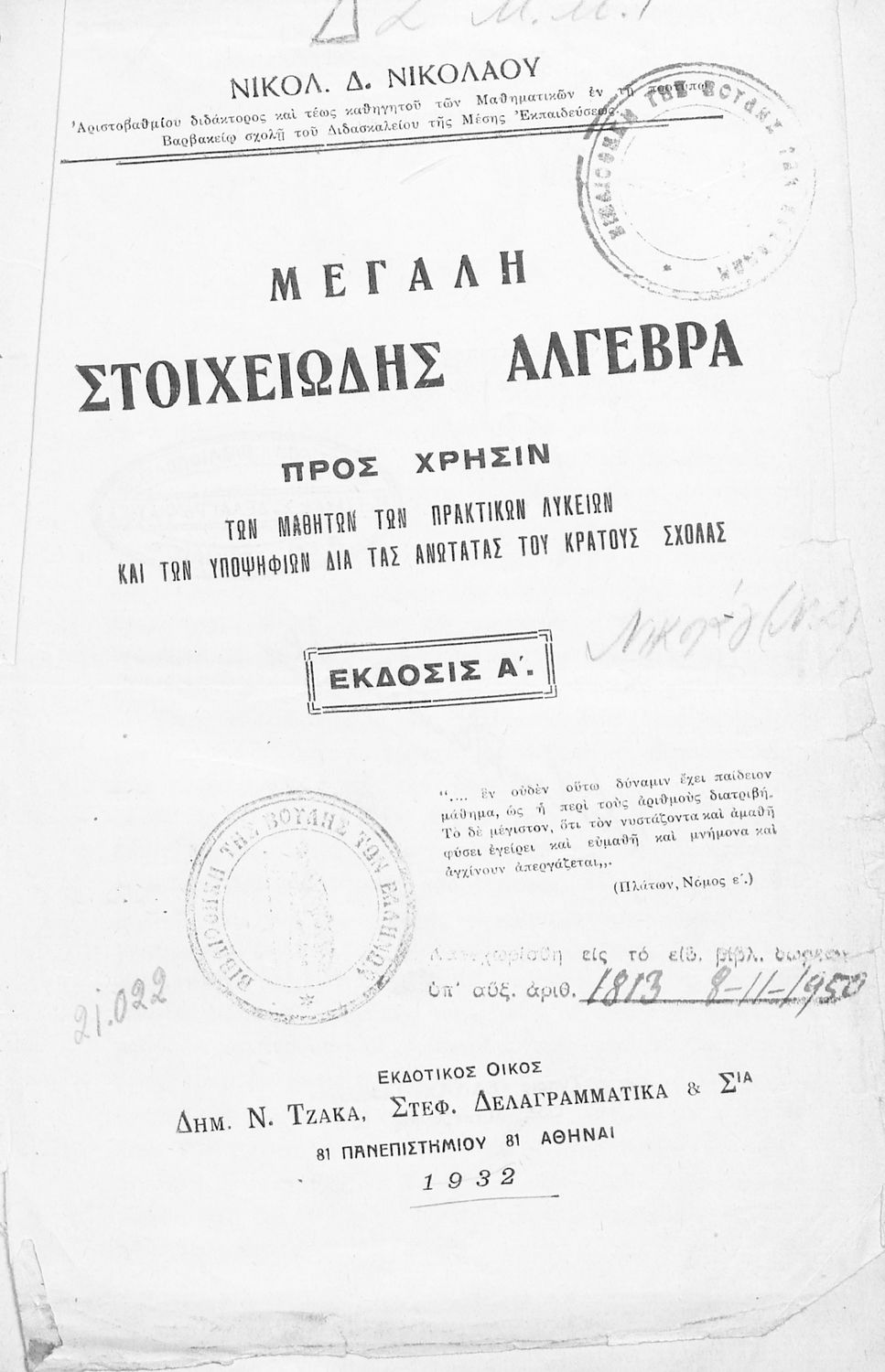 Κωδικός αναγνώρισης: 03-20632631 Τίτλος: Μεγάλη Στοιχειώδης Άλγεβρα προς χρήσιν των μαθητών των πρακτικών Λυκείων, Γυμνασίων και των υποψηφίων δια τας Ανωτάτας Σχολάς του Κράτους Συγγραφέας: Νικόλαος Δ. Νικολάου Μέγεθος και υπόστρωμα: Μαθητικό βοήθημα, σκληρό εξώφυλλο, 346 σελίδες. |