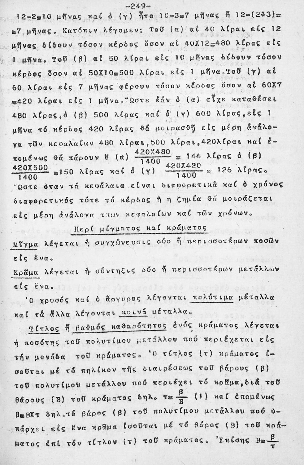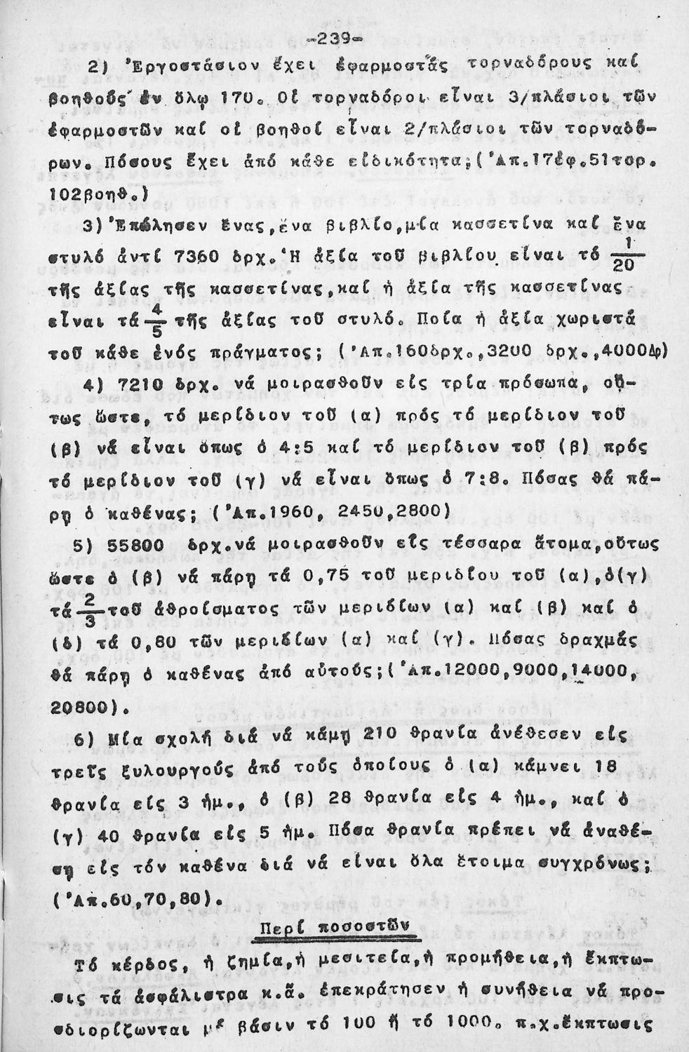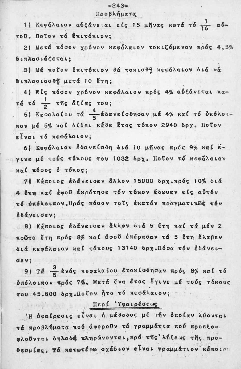 Παιδαγωγικό βοήθημα για τους Δημοδιδασκάλους, τους υποψηφίους των Σχολών Ανωτάτης Εμπορικής και τους μαθητές Πρακτικών Λυκείων των Γυμνασίων που περιέχει ασκήσεις ανώτερης αριθμητικής.
