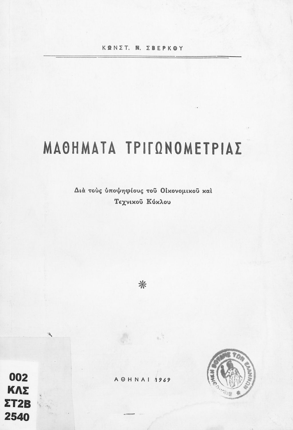 Κωδικός αναγνώρισης: 03-20632654 Τίτλος: Μαθήματα Τριγωνομετρίας δια τους υποψηφίους του οικονομικού και τεχνικού κύκλου Συγγραφέας: Κωνσταντίνος Ν. Σβέρκος Μέγεθος και υπόστρωμα: Μαθητικό βοήθημα, μαλακό εξώφυλλο, 88 σελίδες. |