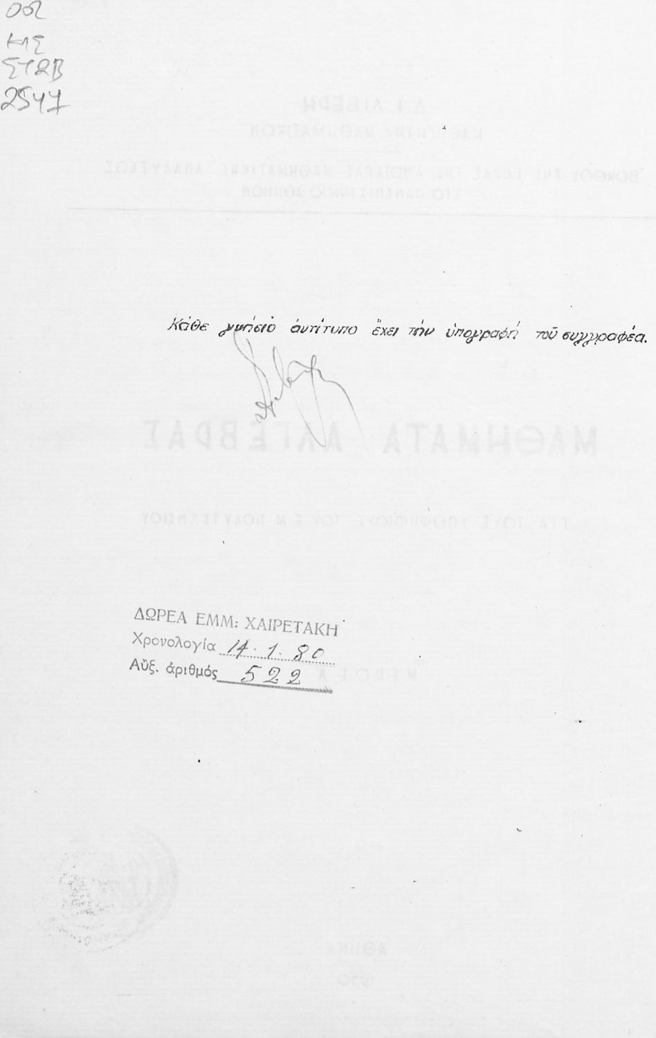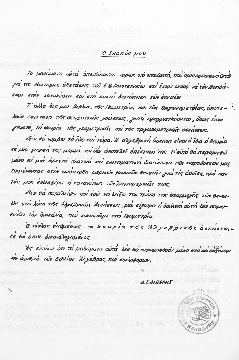 Μαθητικό βοήθημα Άλγεβρας για τους υποψηφίους των Ανωτάτων Σχολών που περιέχει τα θεμελιώδη μέρη της Άλγεβρας καθώς και τις διαφορετικές μορφές Αλγεβρικού λογισμού μεταξύ πραγματικών αριθμών.