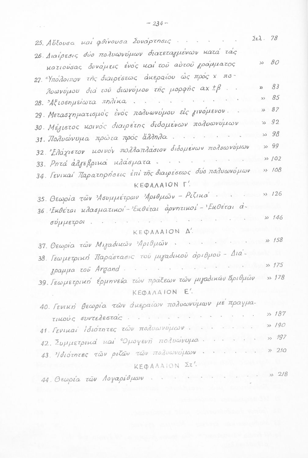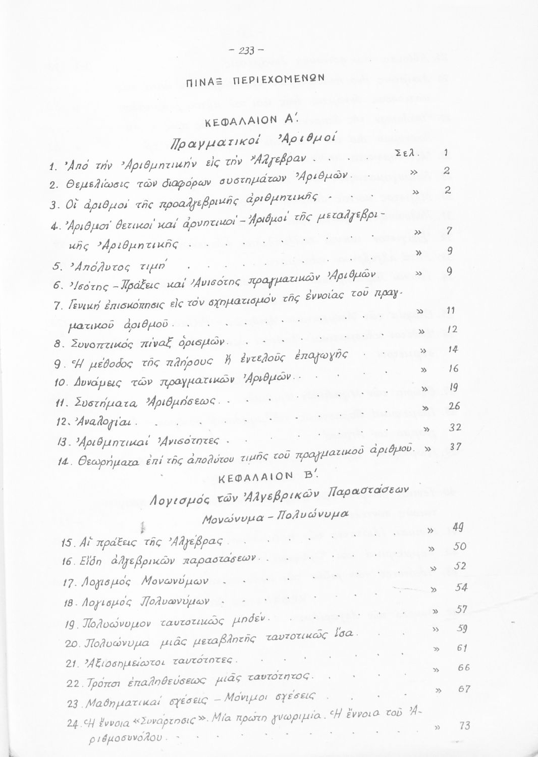 Παιδαγωγικό βοήθημα Μαθηματικών για την Δευτεροβάθμια Εκπαίδευση. Το βιβλίο είναι παιδαγωγικό βοήθημα και αποτελεί επιμορφωτικό υλικό για τους εκπαιδευτικούς. Είναι χωρισμένο σε τρία μέρη. Αρχίζει με τους πραγματικούς αριθμούς, συνεχίζει στις αλγεβρικές παραστάσεις και ολοκληρώνει με τους ασύμμετρους και μιγαδικούς αριθμούς.