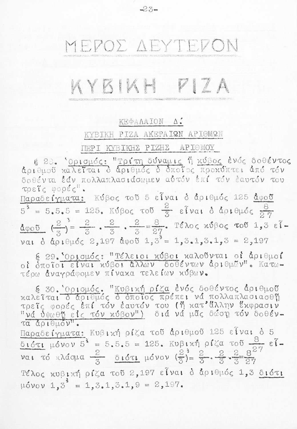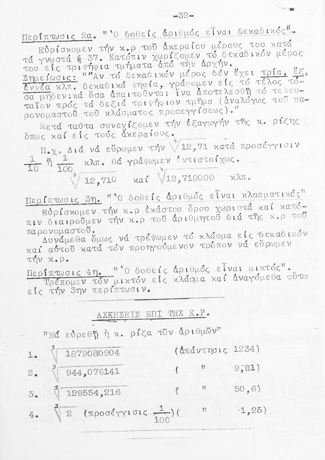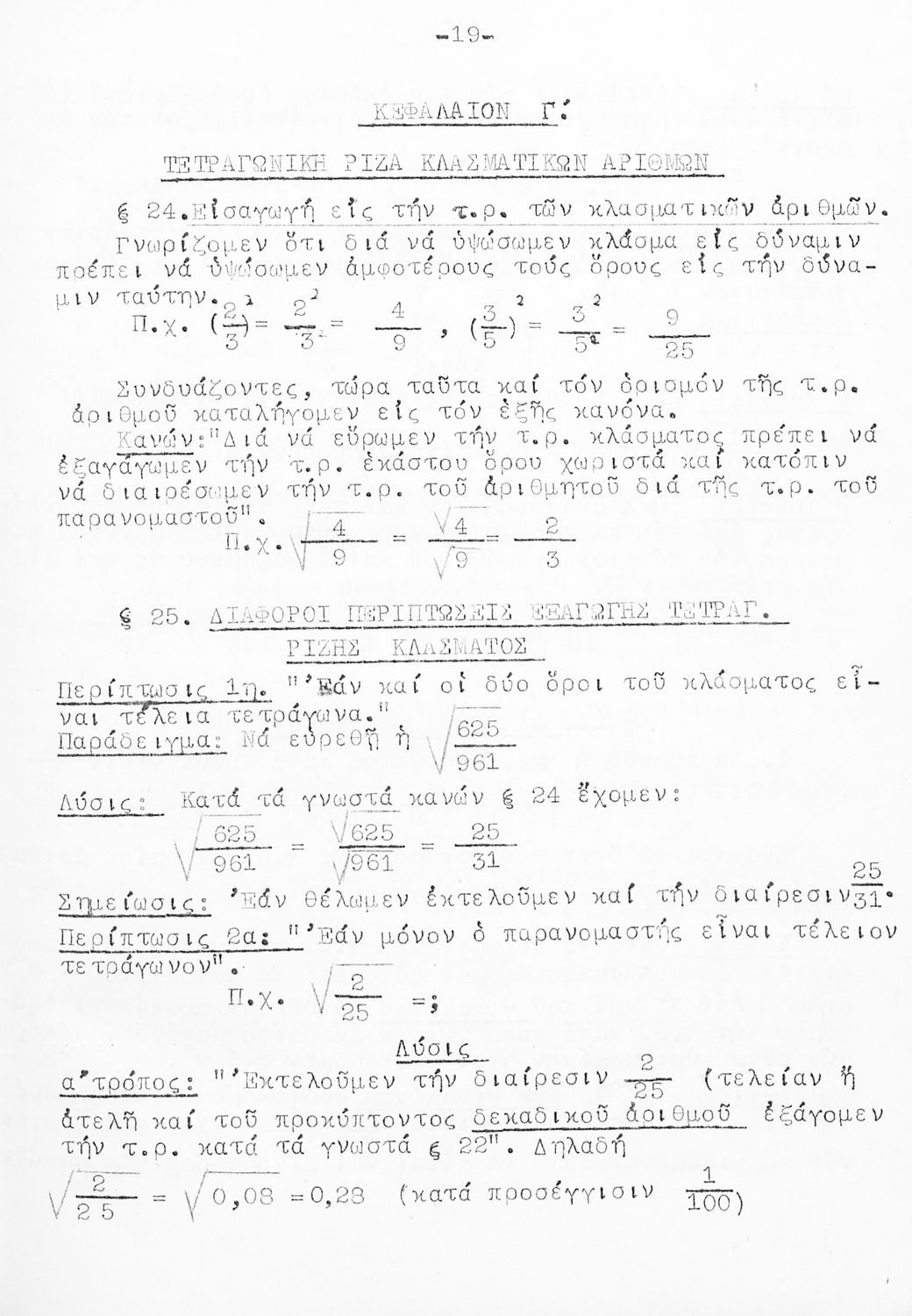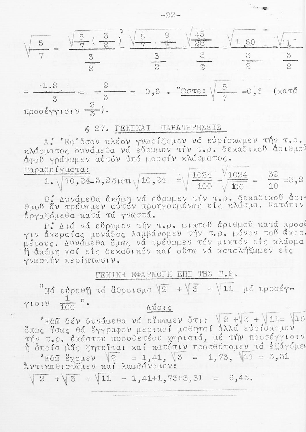 Μαθητικό βοήθημα Μαθηματικών για τους μαθητές των Γυμνασίων και των Εμπορικών και Τεχνικών Σχολών καθώς και δια τους Υποψηφίους των Ανωτάτων Σχολών. Το βιβλίο πραγματεύεται την έννοια της τετραγωνικής ρίζας και της κυβικής ρίζας των αριθμών, δεκαδικών, κλασματικών, ακέραιων.
