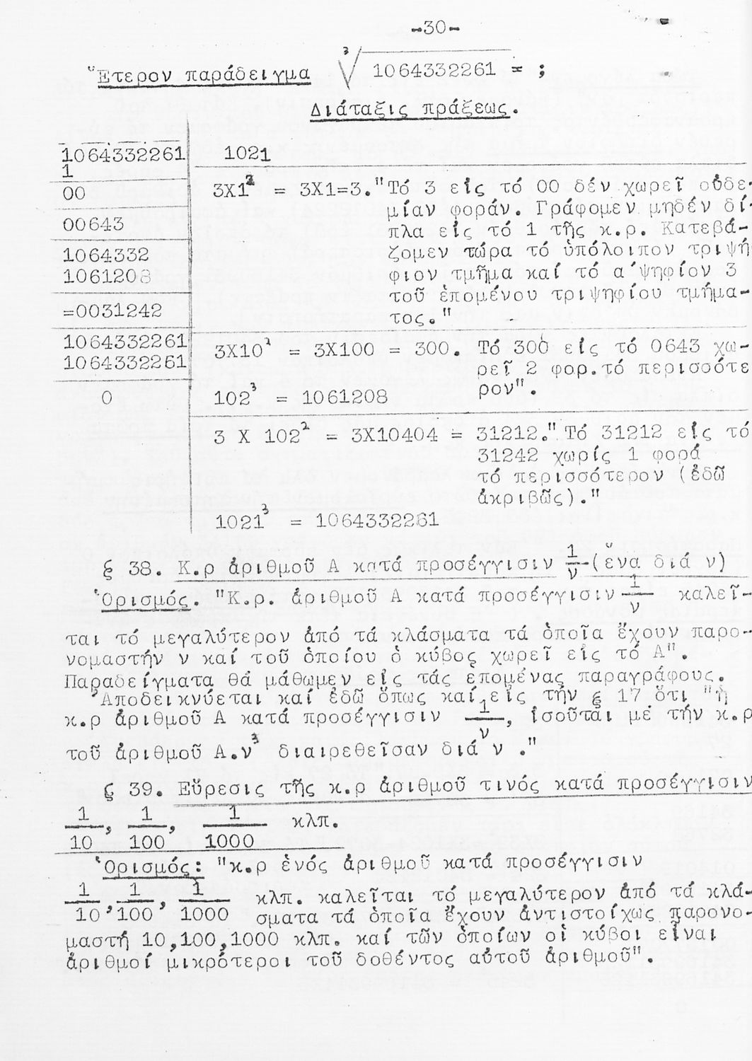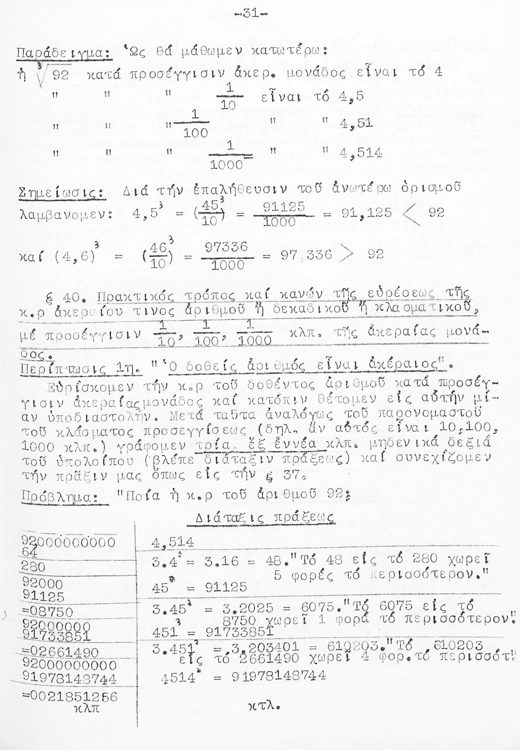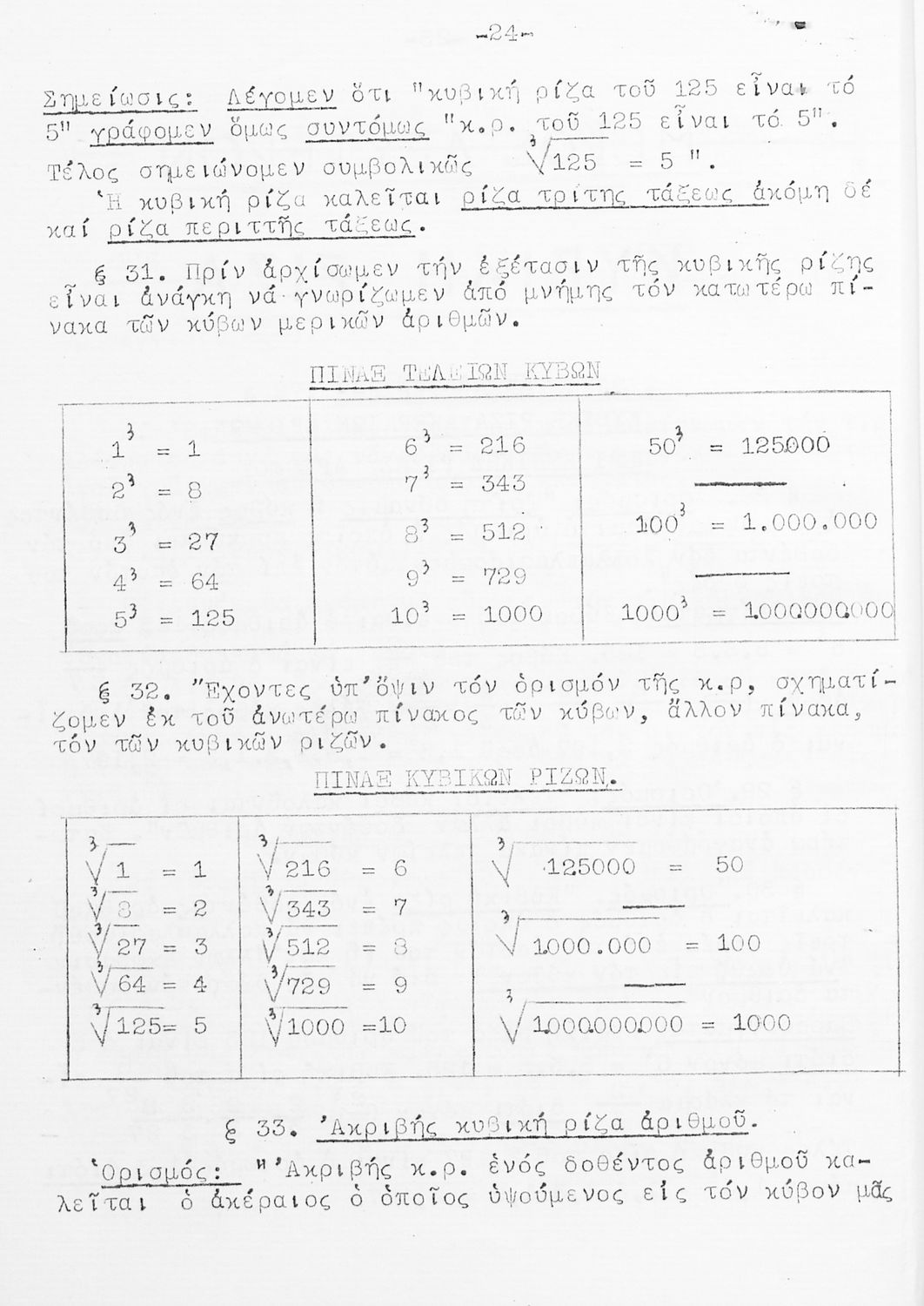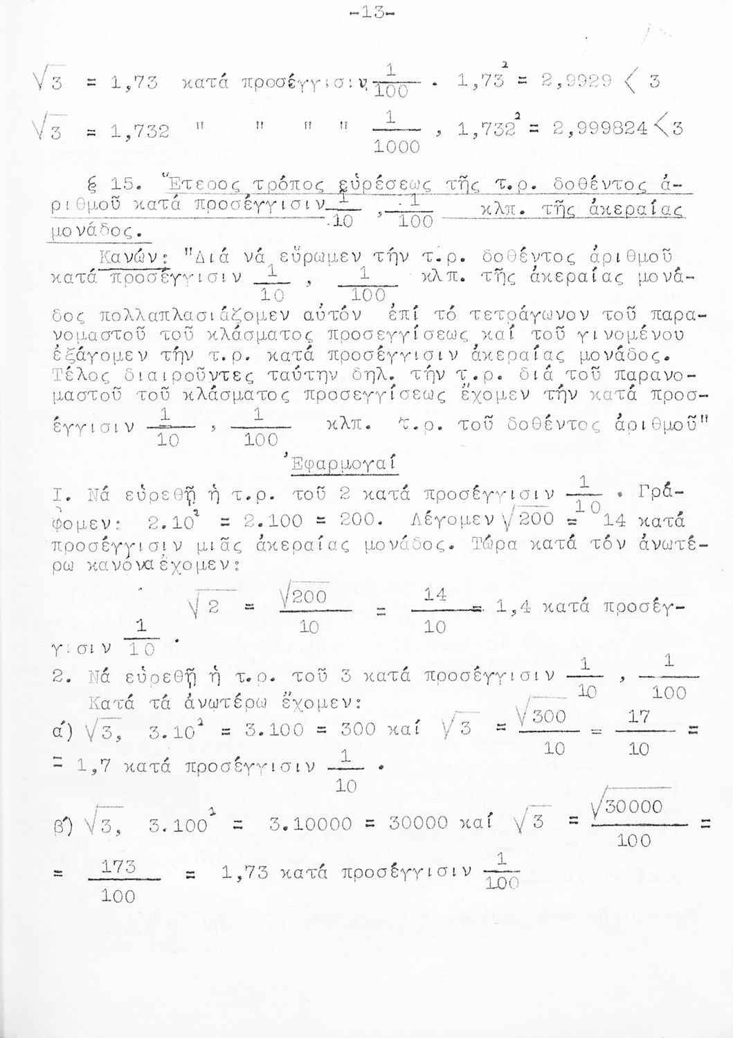 Μαθητικό βοήθημα Μαθηματικών για τους μαθητές των Γυμνασίων και των Εμπορικών και Τεχνικών Σχολών καθώς και δια τους Υποψηφίους των Ανωτάτων Σχολών. Το βιβλίο πραγματεύεται την έννοια της τετραγωνικής ρίζας και της κυβικής ρίζας των αριθμών, δεκαδικών, κλασματικών, ακέραιων.