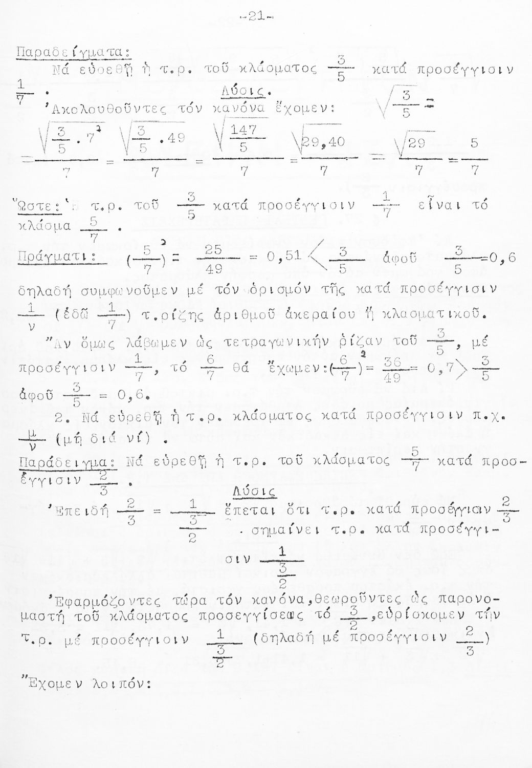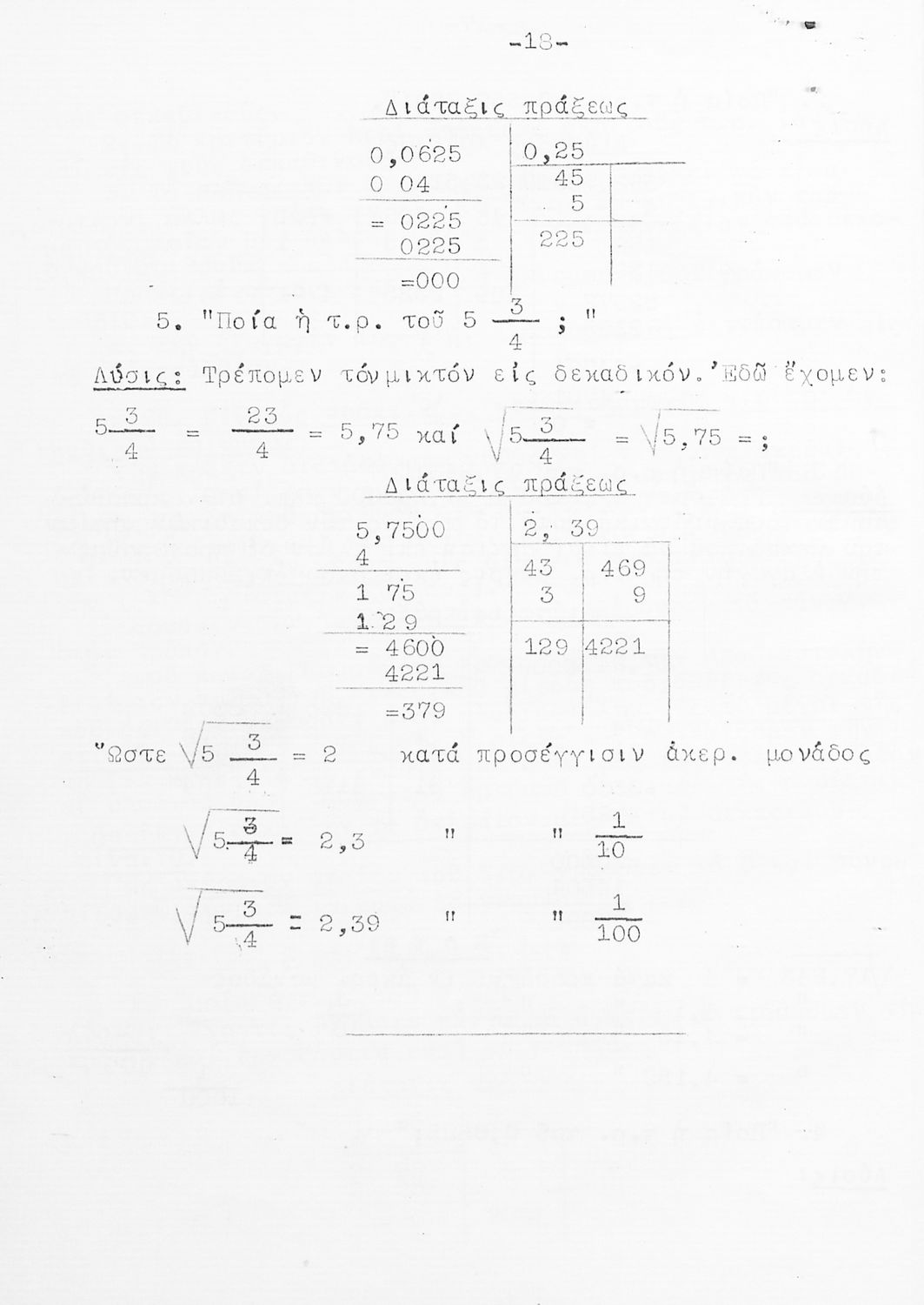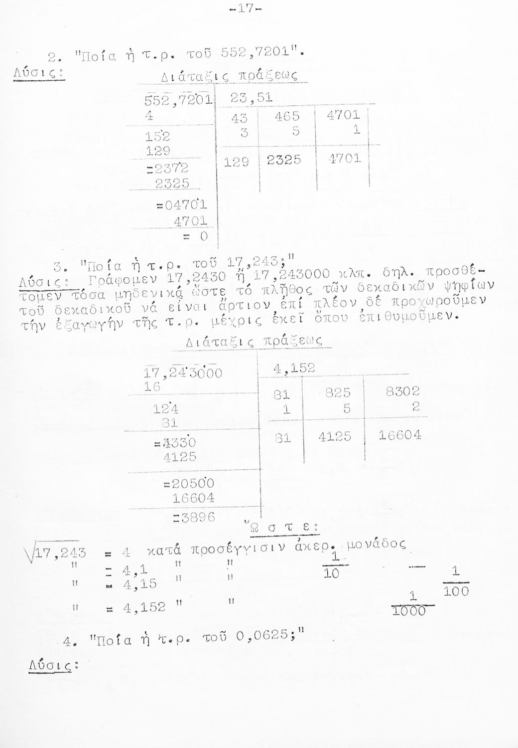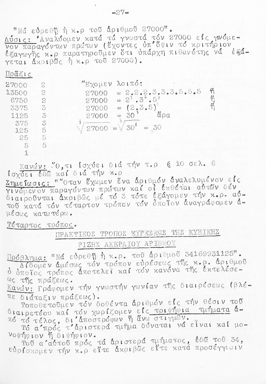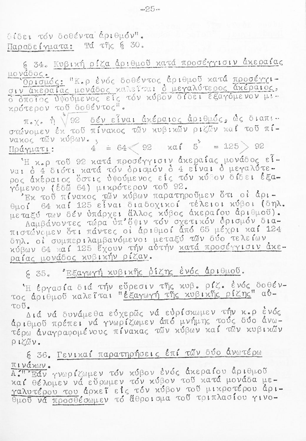 Μαθητικό βοήθημα Μαθηματικών για τους μαθητές των Γυμνασίων και των Εμπορικών και Τεχνικών Σχολών καθώς και δια τους Υποψηφίους των Ανωτάτων Σχολών. Το βιβλίο πραγματεύεται την έννοια της τετραγωνικής ρίζας και της κυβικής ρίζας των αριθμών, δεκαδικών, κλασματικών, ακέραιων.
