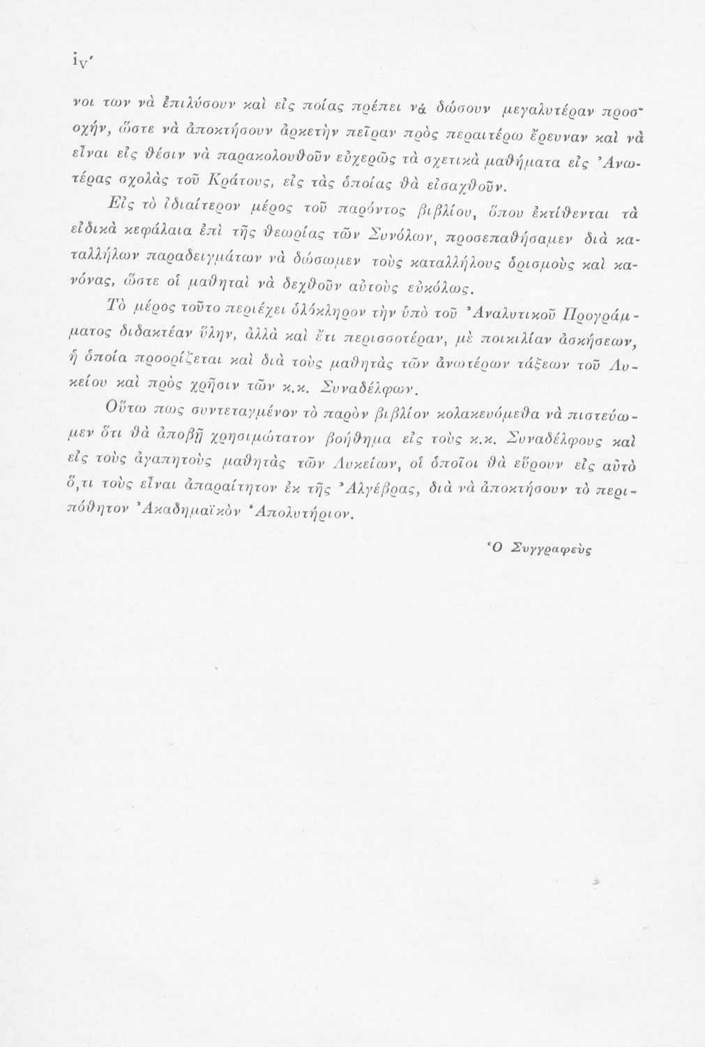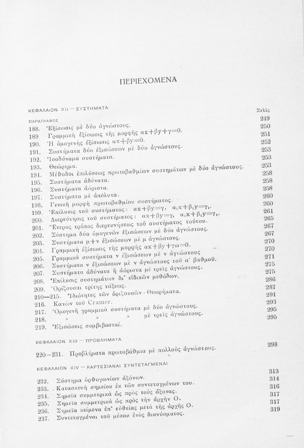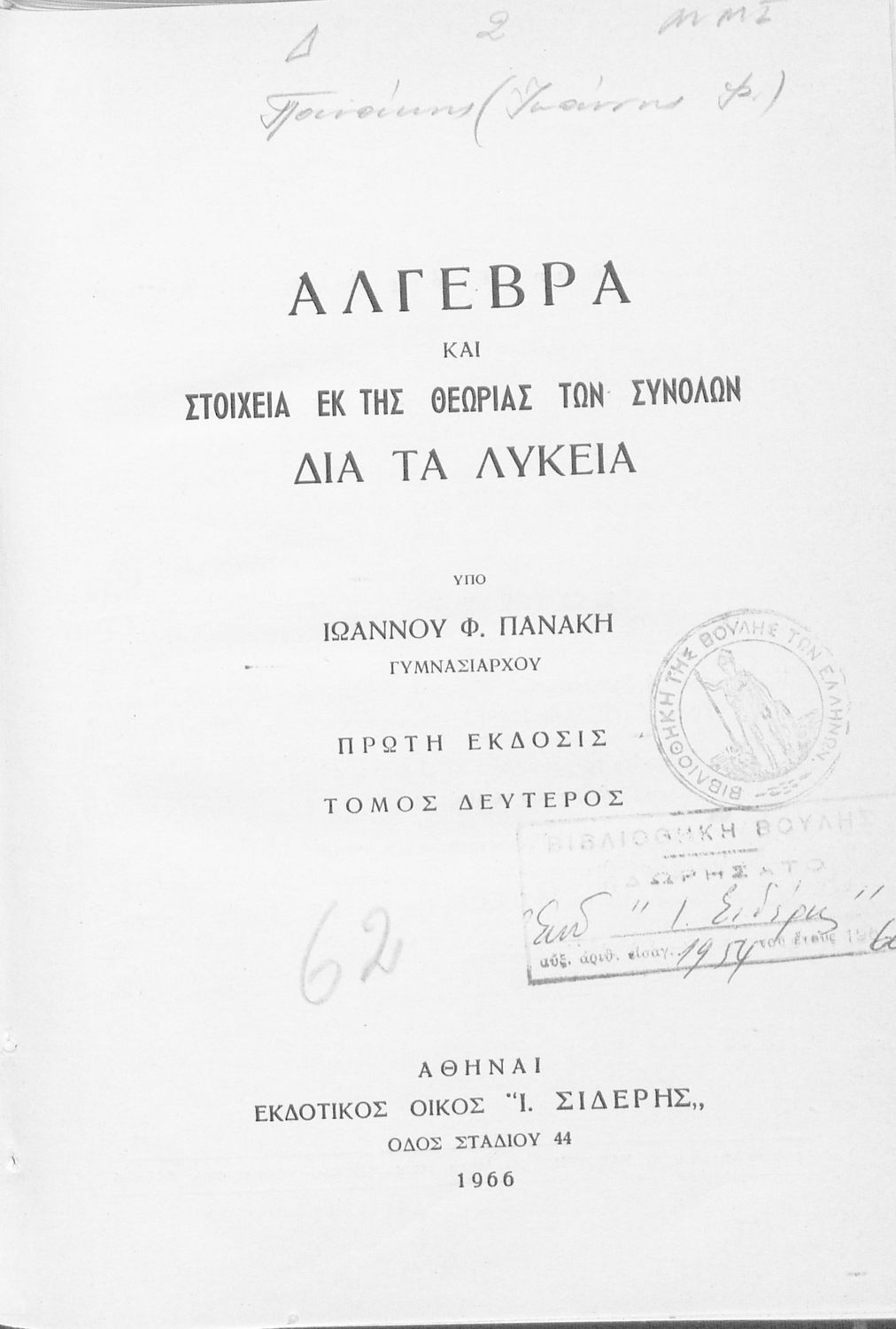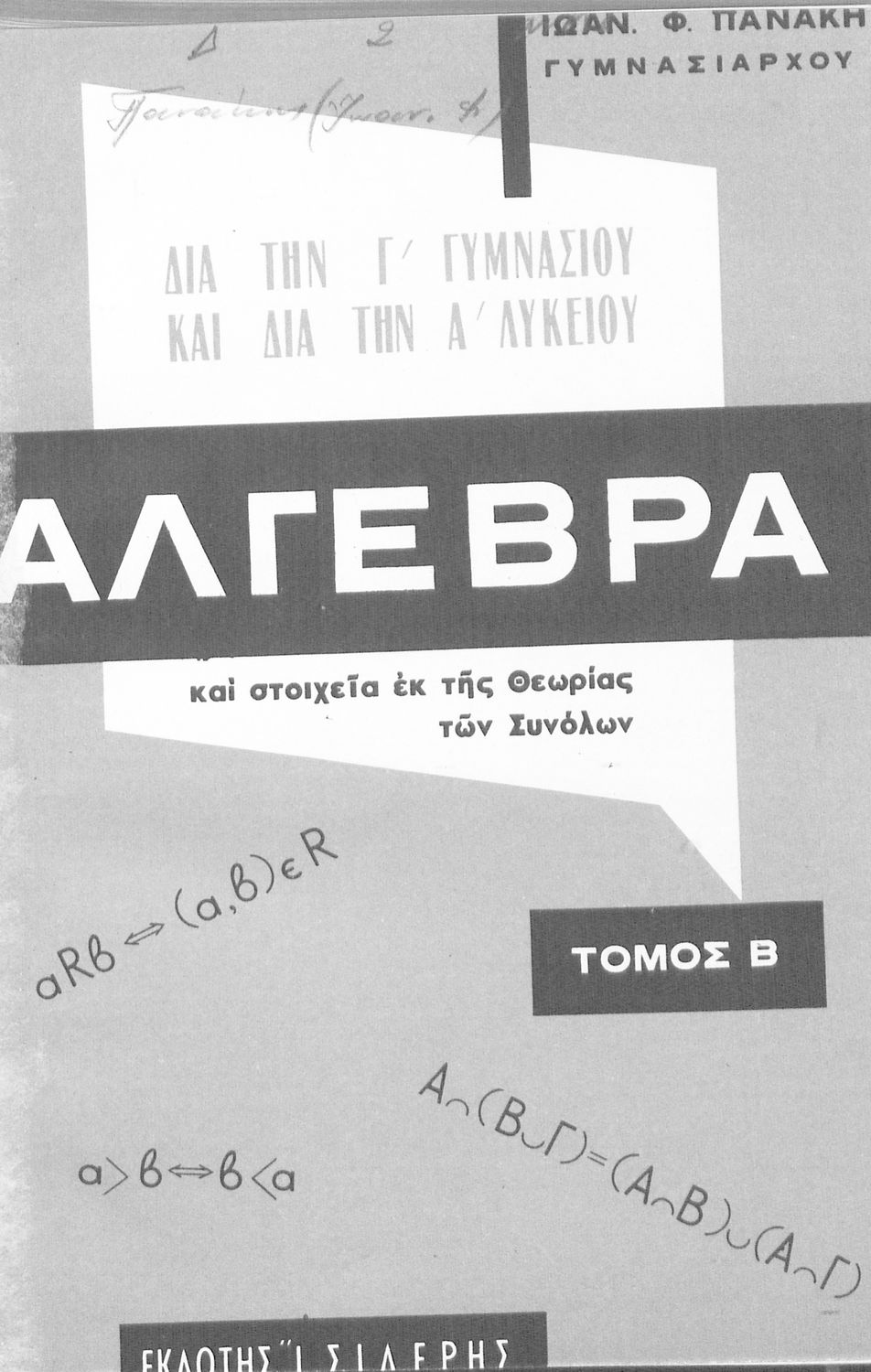 Βαθμίδα εκπαίδευσης: Δευτεροβάθμια Τάξη: Λύκειο Μάθημα: Μαθηματικά Γλώσσα: Καθαρεύουσα Παρουσίαση περιεχομένου: Σχολικό εγχειρίδιο για τις τάξεις του Λυκείου για το μάθημα των Μαθηματικών για το μάθημα της Άλγεβρας. Το εγχειρίδιο περιλαμβάνει τις βασικές έννοιες της επιστήμης, τις ιδιότητες συνόλων, τους πραγματικούς αριθμούς, τα διατεταγμένα ζεύγη, τις διμελείς σχέσεις, τις απεικονίσεις και τις συναρτήσεις. |