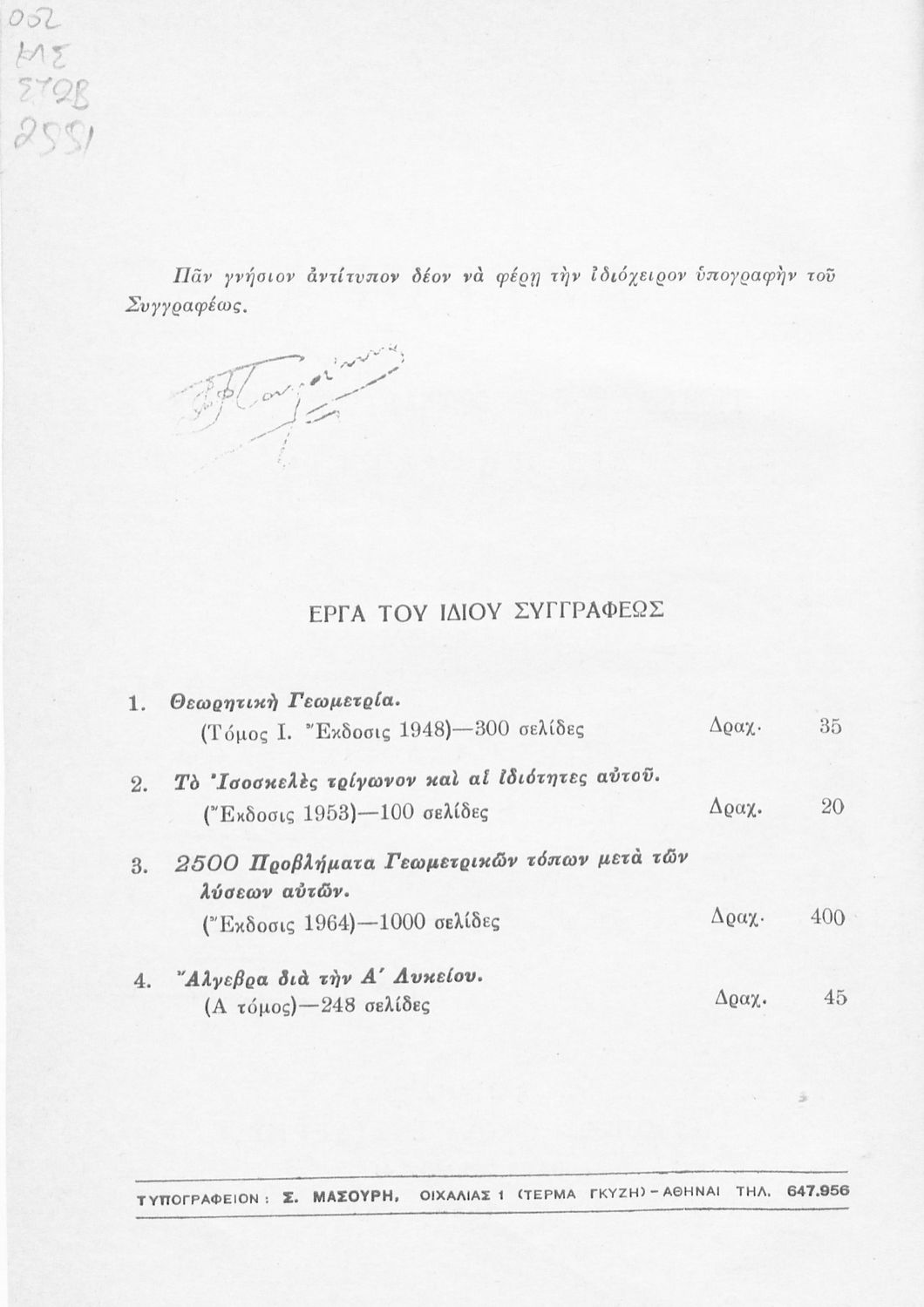 Εκδότης: Ιωάννης Ν. Σιδέρης Έτος έκδοσης: 1966 Τόπος έκδοσης: Αθήνα Έκδοση: 1η |