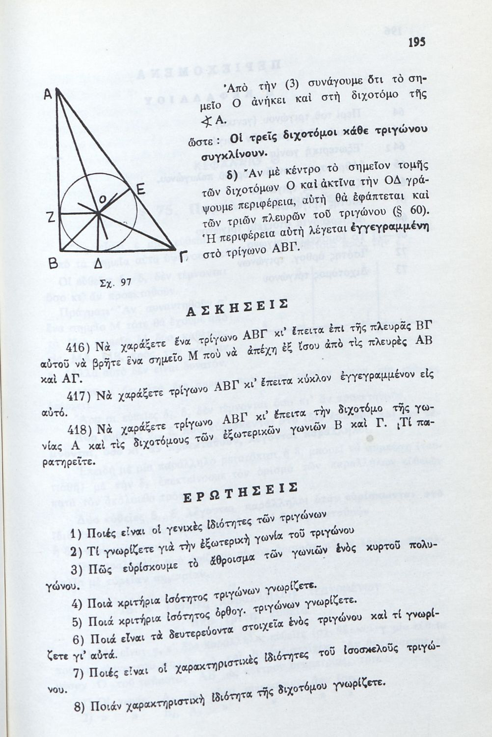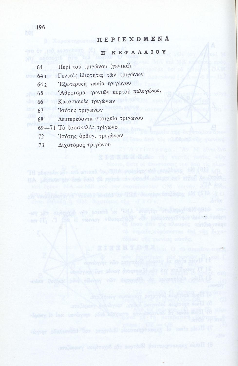 Σχολικό εγχειρίδιο Γεωμετρίας για τις Α΄, Β΄, Γ΄ Γυμνασίου που είναι χωρισμένο σε Επιπεδομετρία και Στερεομετρία και περιλαμβάνει θεωρία και ασκήσεις.