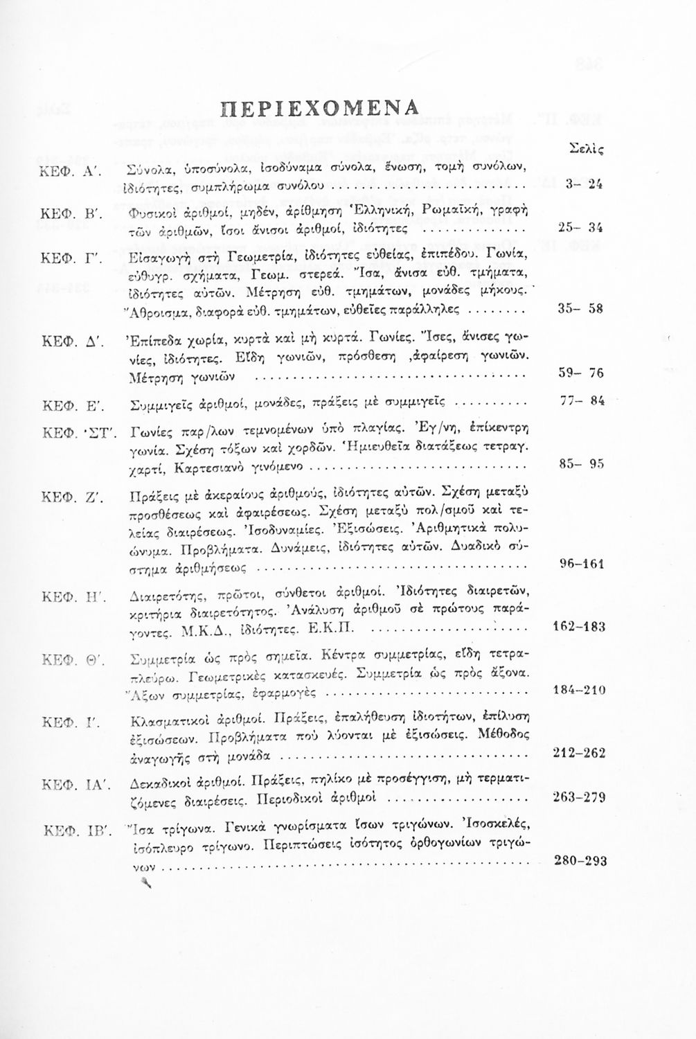 Σχολικό εγχειρίδιο Γεωμετρίας για την Α΄ και Β΄ Γυμνασίου που περιλαμβάνει θεωρία και ασκήσεις και είναι χωρισμένο σε Επιπεδομετρία και Στερεομετρία.