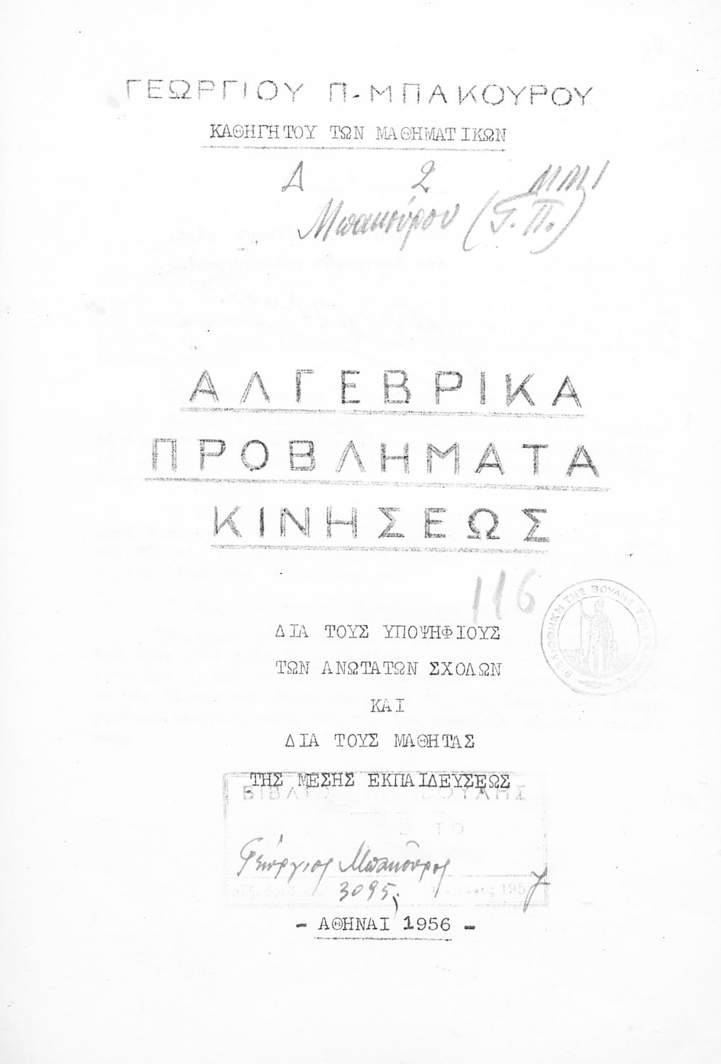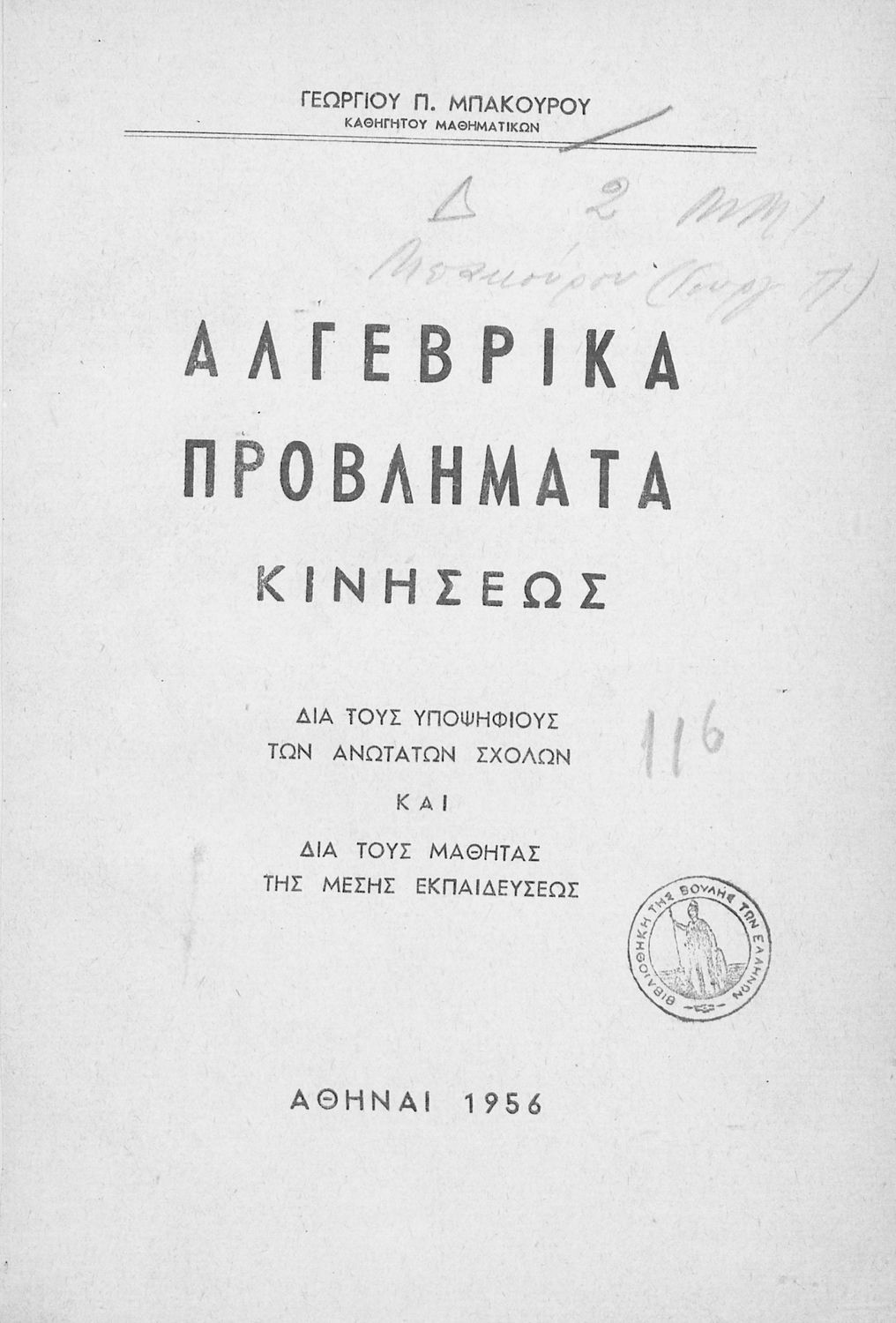 Κωδικός αναγνώρισης: 03-20632716 Τίτλος: Αλγεβρικά Προβλήματα Κινήσεως δια τους υποψηφίους των Ανωτάτων Σχολών και δια τους μαθητάς της Μέσης Εκπαιδεύσεως Συγγραφέας: Γεώργιος Π. Μπακούρος Μέγεθος και υπόστρωμα: Μαθητικό βοήθημα, σκληρό εξώφυλλο, 50 σελίδες. |