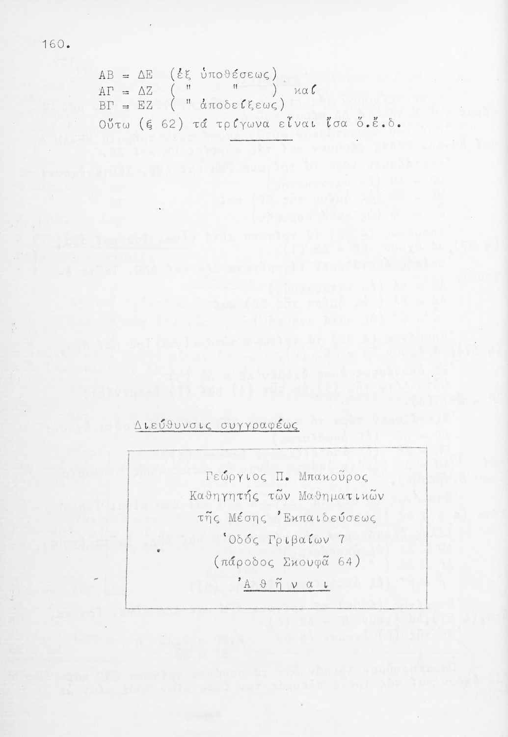 Κωδικός αναγνώρισης: 03-20632726 Τίτλος: Γεωμετρικαί ασκήσεις λελυμέναι υποδειγματικώς και ταξινομημέναι κατά κατηγορίας, προς χρήσιν των υποψηφίων Ανωτάτων σχολών και των μαθητών της Ε΄ τάξεως των Γυμνασίων Συγγραφέας: Γεώργιος Μπακούρος Μέγεθος και υπόστρωμα: Μαθητικό βοήθημα, σκληρό εξώφυλλο, 164 σελίδες. |