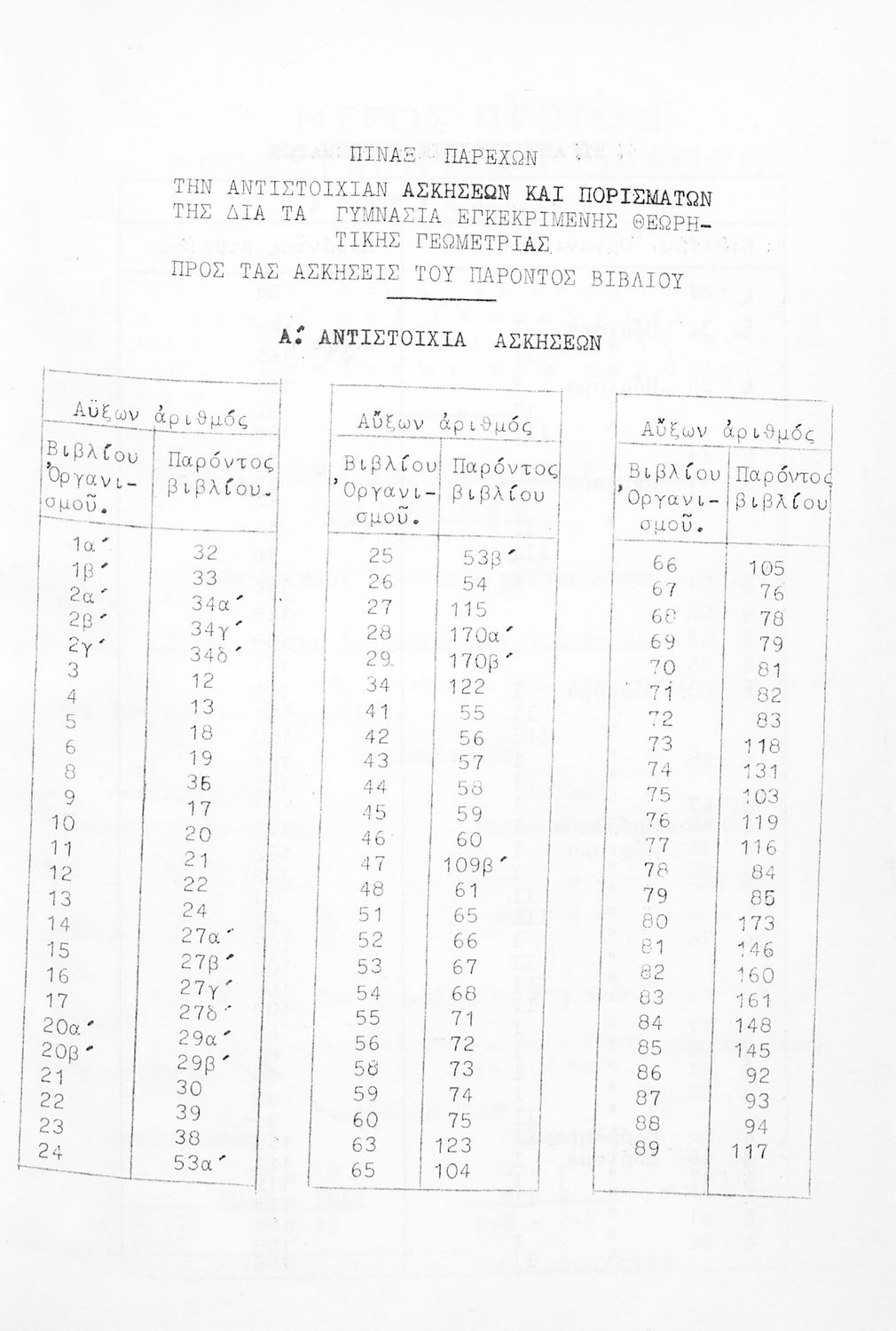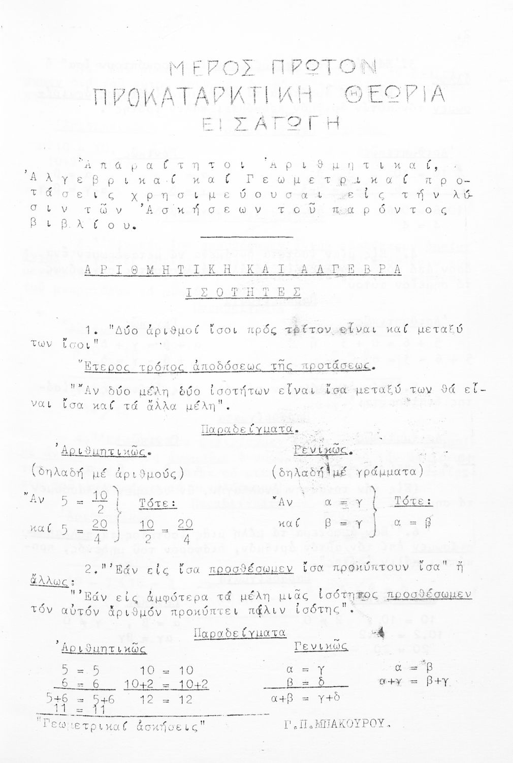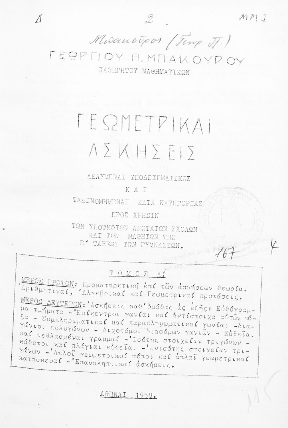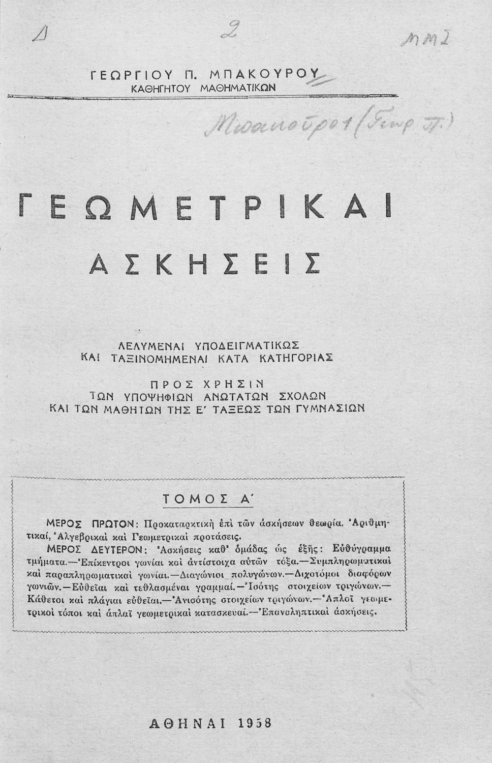 Κωδικός αναγνώρισης: 03-20632726 Τίτλος: Γεωμετρικαί ασκήσεις λελυμέναι υποδειγματικώς και ταξινομημέναι κατά κατηγορίας, προς χρήσιν των υποψηφίων Ανωτάτων σχολών και των μαθητών της Ε΄ τάξεως των Γυμνασίων Συγγραφέας: Γεώργιος Μπακούρος Μέγεθος και υπόστρωμα: Μαθητικό βοήθημα, σκληρό εξώφυλλο, 164 σελίδες. |