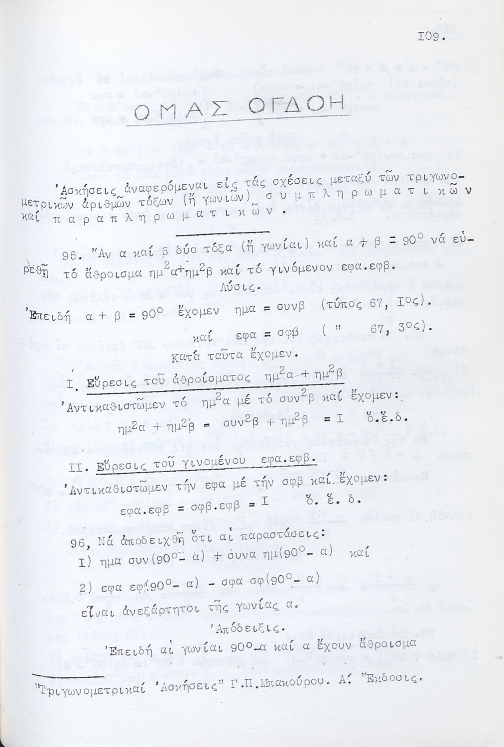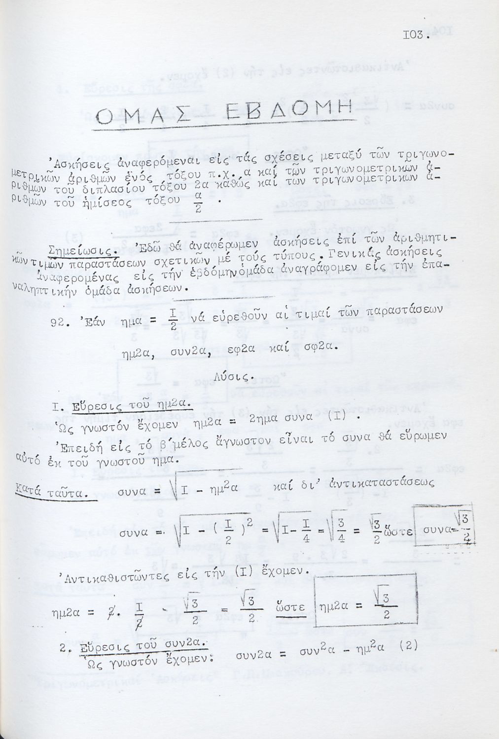 Μαθητικό βοήθημα για τους υποψηφίους Ανωτάτων Σχολών και ειδικότερα για τους μαθητές των Γυμνασίων. Το βιβλίο είναι χωρισμένο σε δύο μέρη. Στο πρώτο μέρος περιλαμβάνει αλγεβρική και γεωμετρική θεωρία για τη λύση των ασκήσεων ενώ στο δεύτερο μέρος περιλαμβάνει ασκήσεις σε ομάδες.