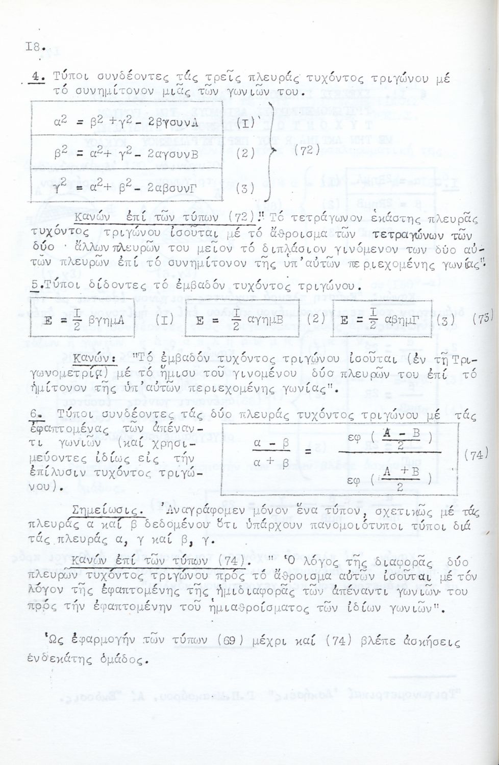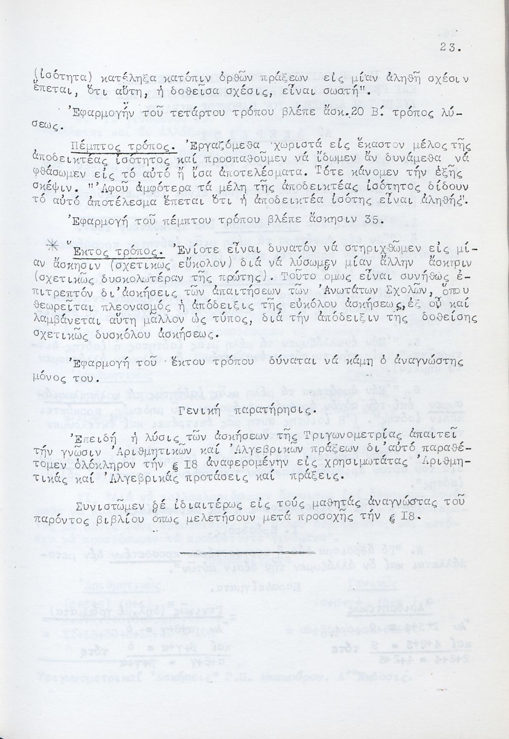 Βαθμίδα εκπαίδευσης: Δευτεροβάθμια Τάξη: Γυμνάσιο Μάθημα: Τριγωνομετρία Γλώσσα: Καθαρεύουσα Παρουσίαση περιεχομένου: Μαθητικό βοήθημα για τους υποψηφίους Ανωτάτων Σχολών και ειδικότερα για τους μαθητές των Γυμνασίων. Το βιβλίο είναι χωρισμένο σε δύο μέρη. Στο πρώτο μέρος περιλαμβάνει αλγεβρική και γεωμετρική θεωρία για τη λύση των ασκήσεων ενώ στο δεύτερο μέρος περιλαμβάνει ασκήσεις σε ομάδες. |